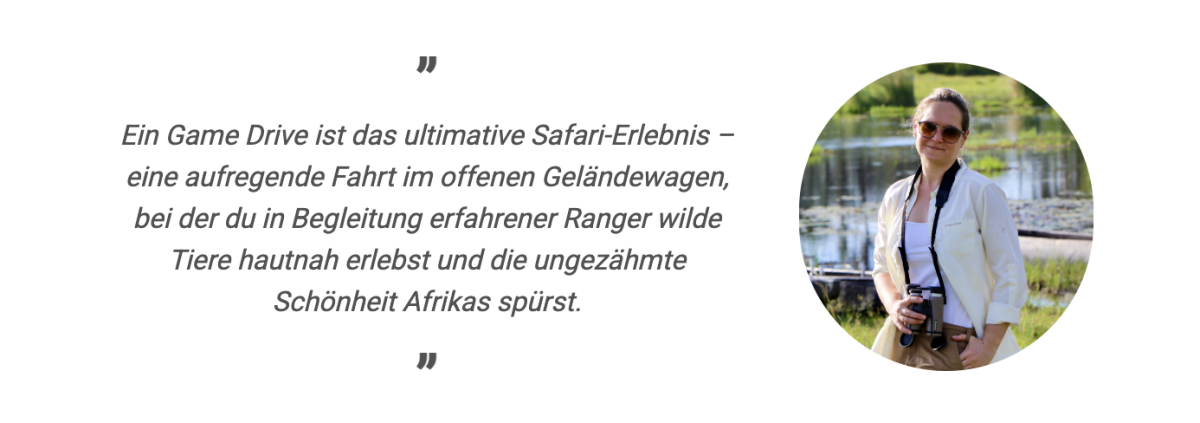 Ein Game Drive ist jedes Mal eine Reise ins Ungewisse – nie vorhersehbar, immer einzigartig, voller Überraschungen und Adrenalin. Die Tiere leben hier frei und wild und halten sich leider nicht an den Zeitplan der Besucher. Daher kann es schon mal passieren, dass dein Ranger stundenlang nach deinem Lieblingstier sucht, bevor du es endlich in freier Wildbahn entdeckst. Doch genau das macht die Magie einer Safari aus: Jeder Moment ist echt, ungestellt und unvergesslich.