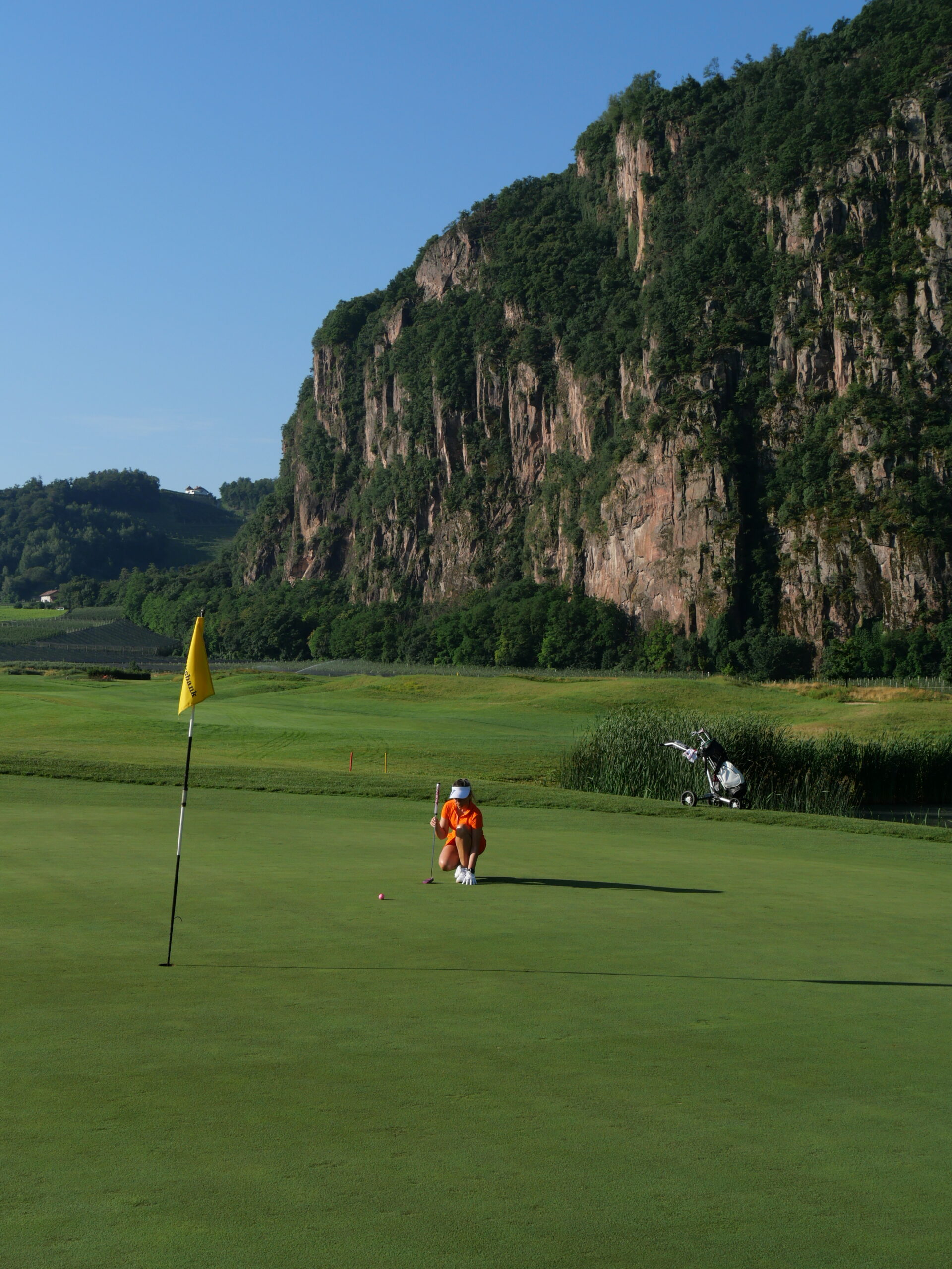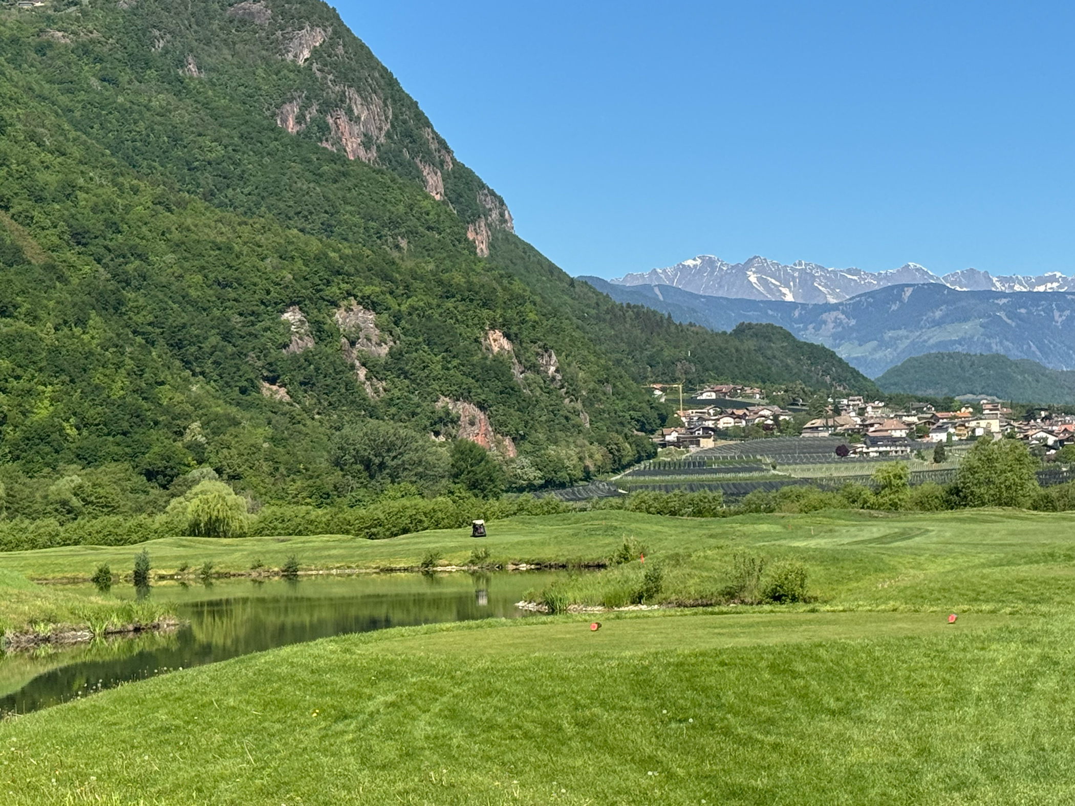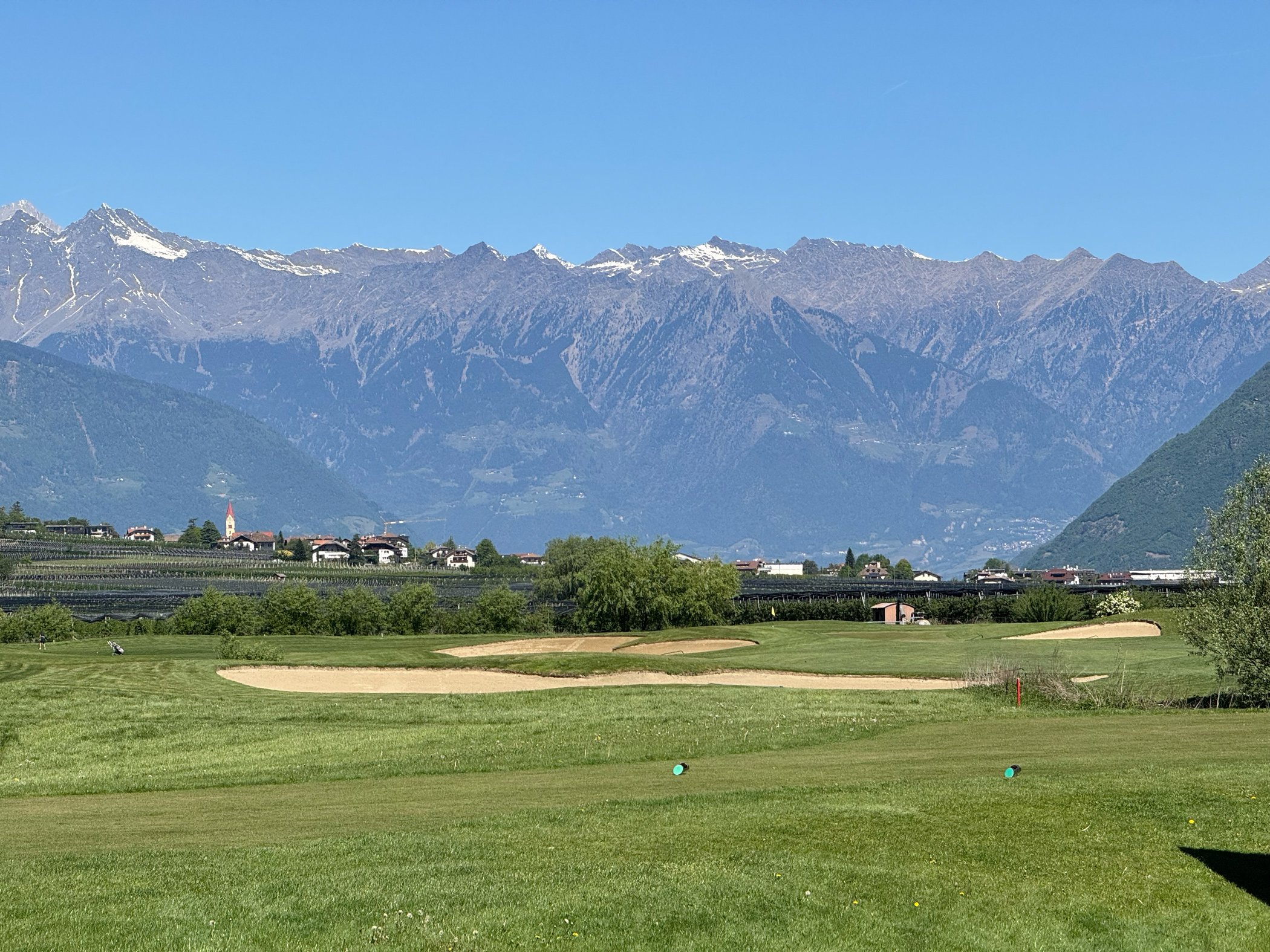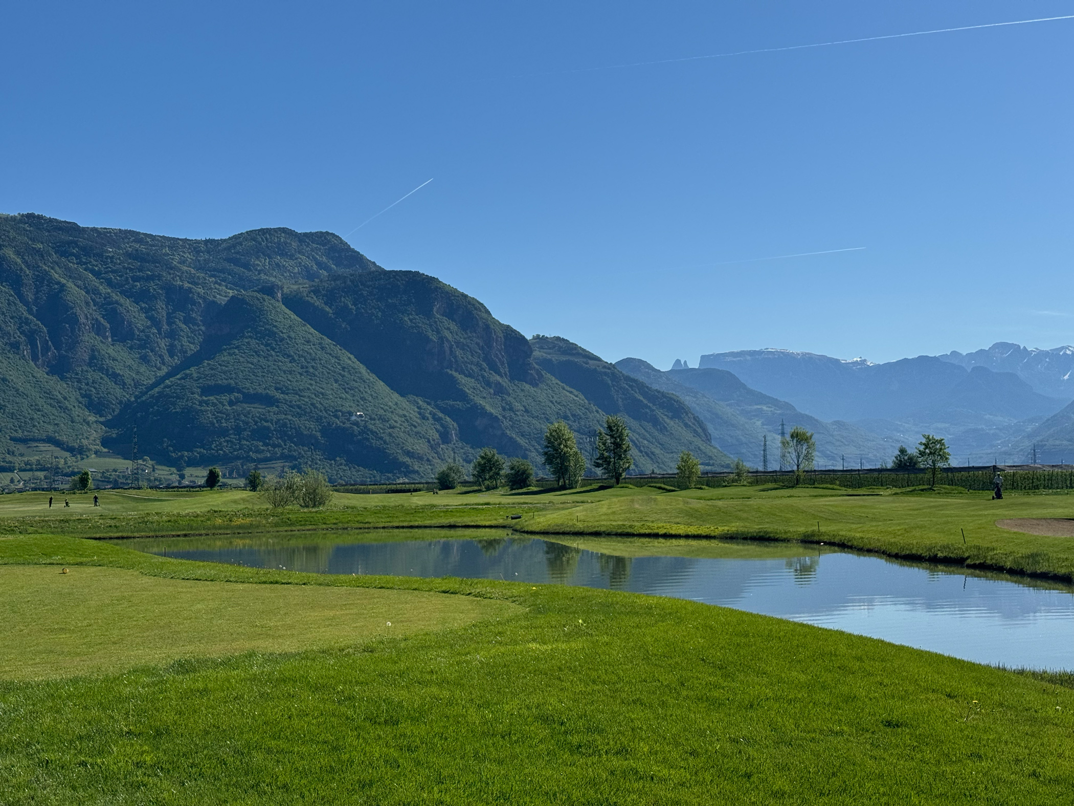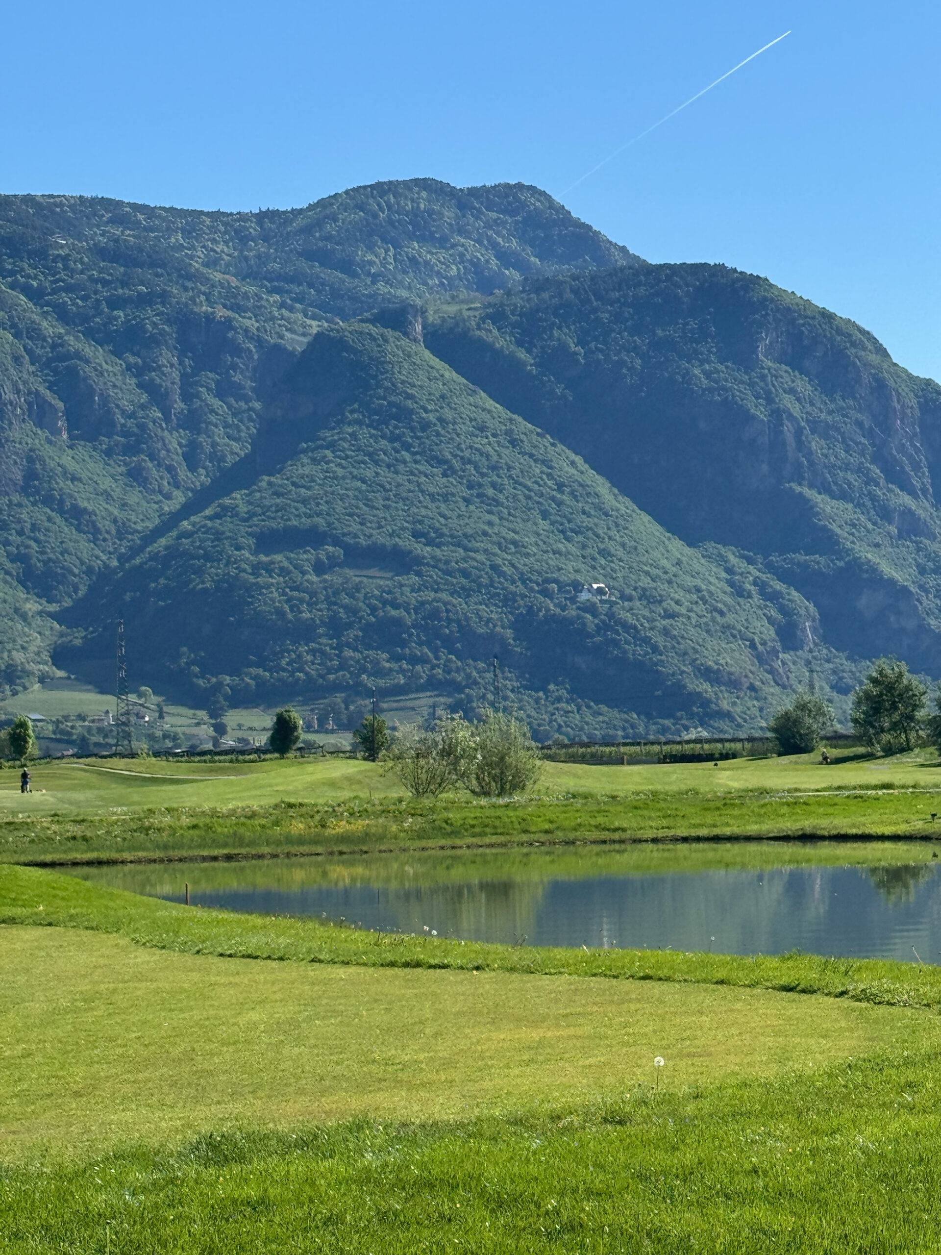 Die künstlichen Seen, die Modellierungen, die positionierten Bunker: alles erdacht. Der Golfplatz wurde 2015 auf einer ehemaligen Apfelplantage eröffnet und gehört der Familie Gostner. Man sieht es dem Boden noch an — diese Flachheit ist für Südtirol geradezu systemfremd.