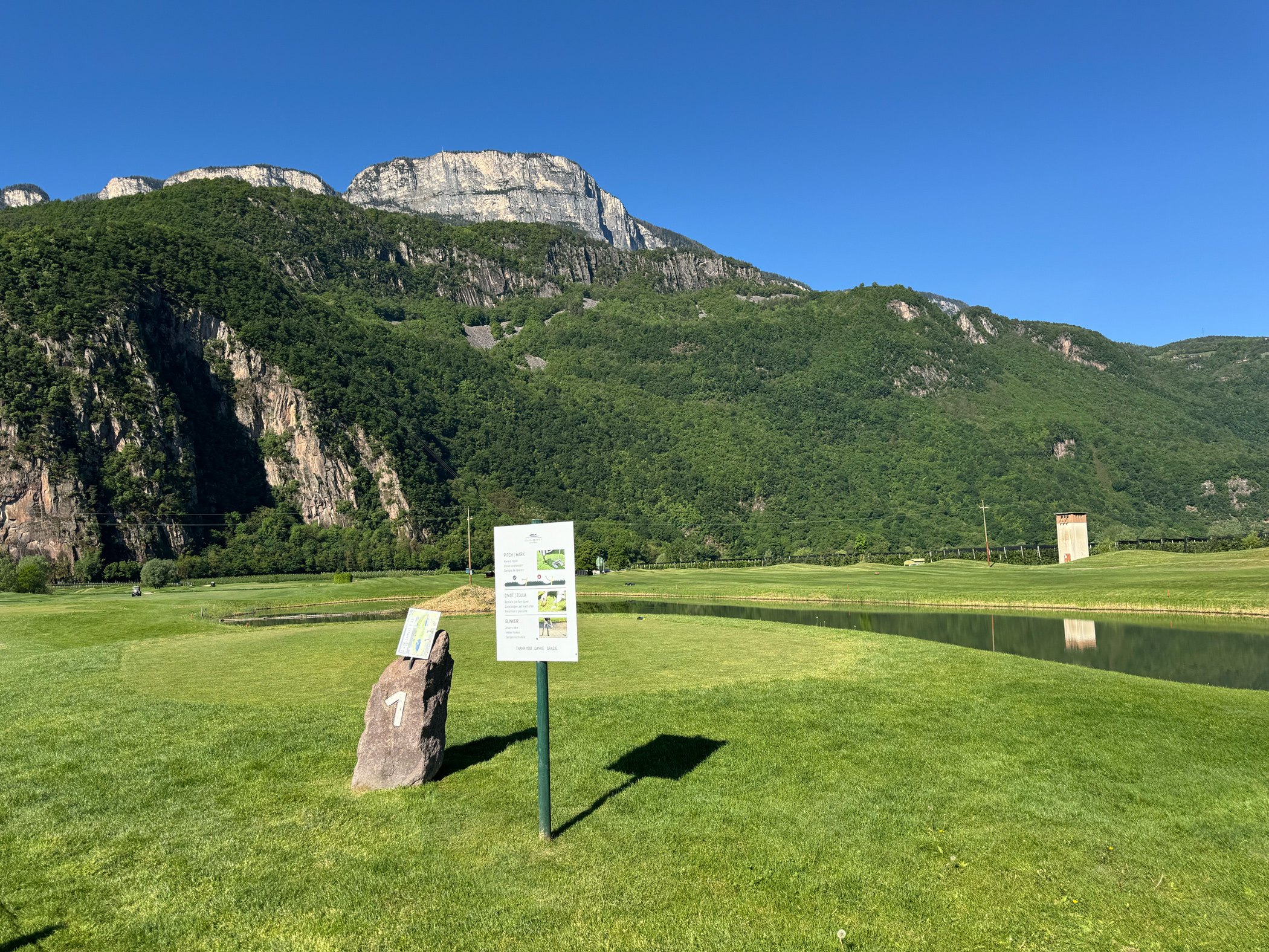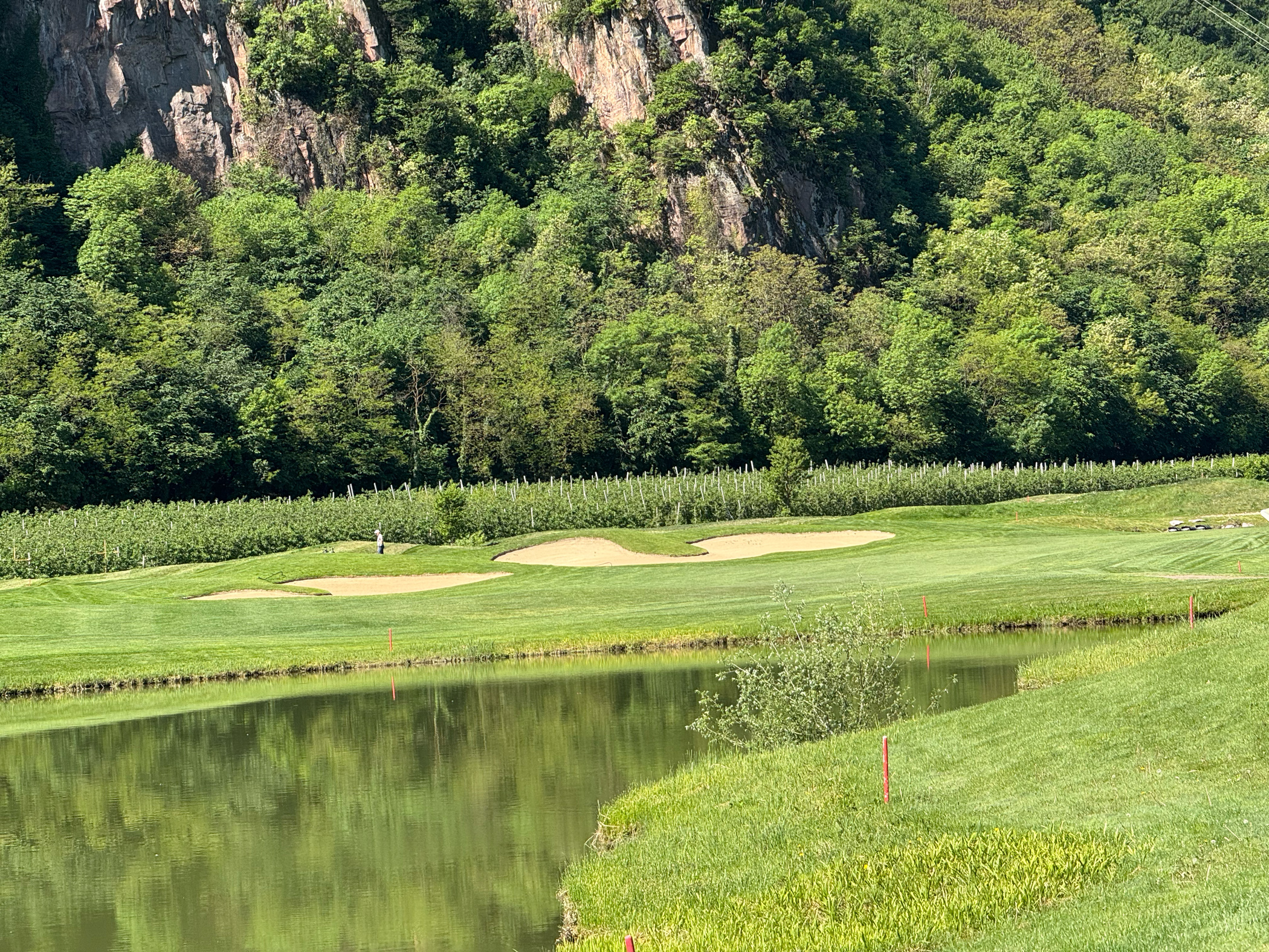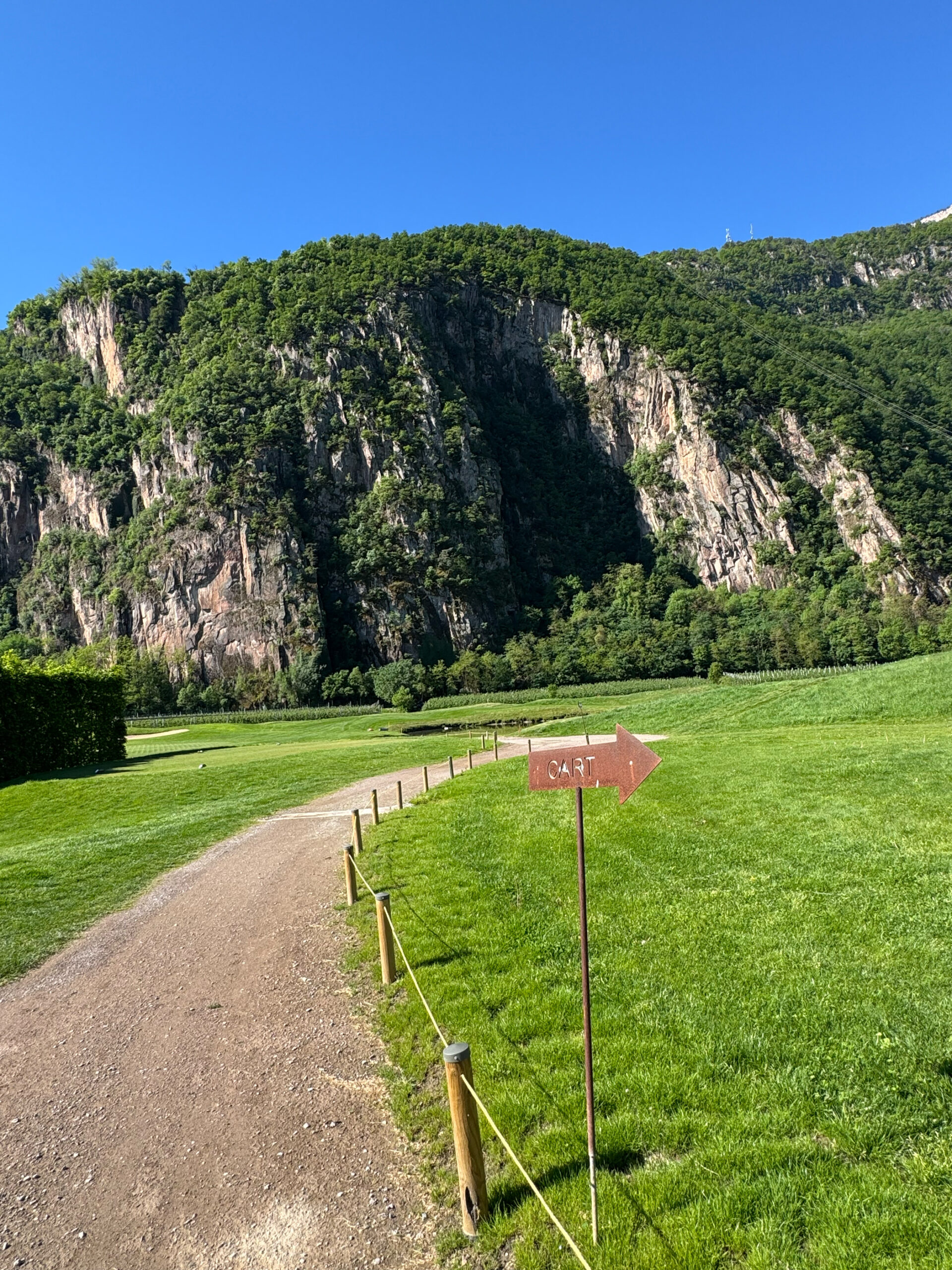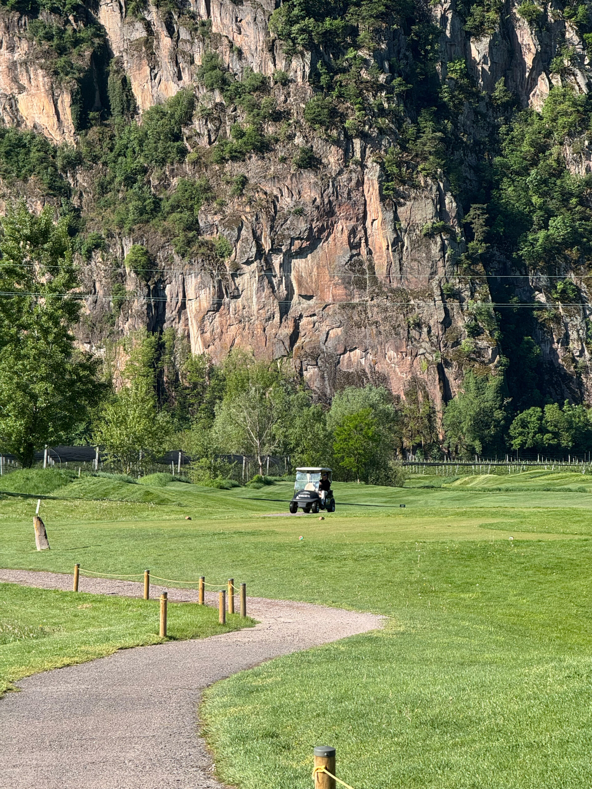 Die künstlichen Seen, die Modellierungen, die positionierten Bunker: alles erdacht. Der Golfplatz wurde 2015 auf einer ehemaligen Apfelplantage eröffnet und gehört der Familie Gostner. Man sieht es dem Boden noch an — diese Flachheit ist für Südtirol geradezu systemfremd.