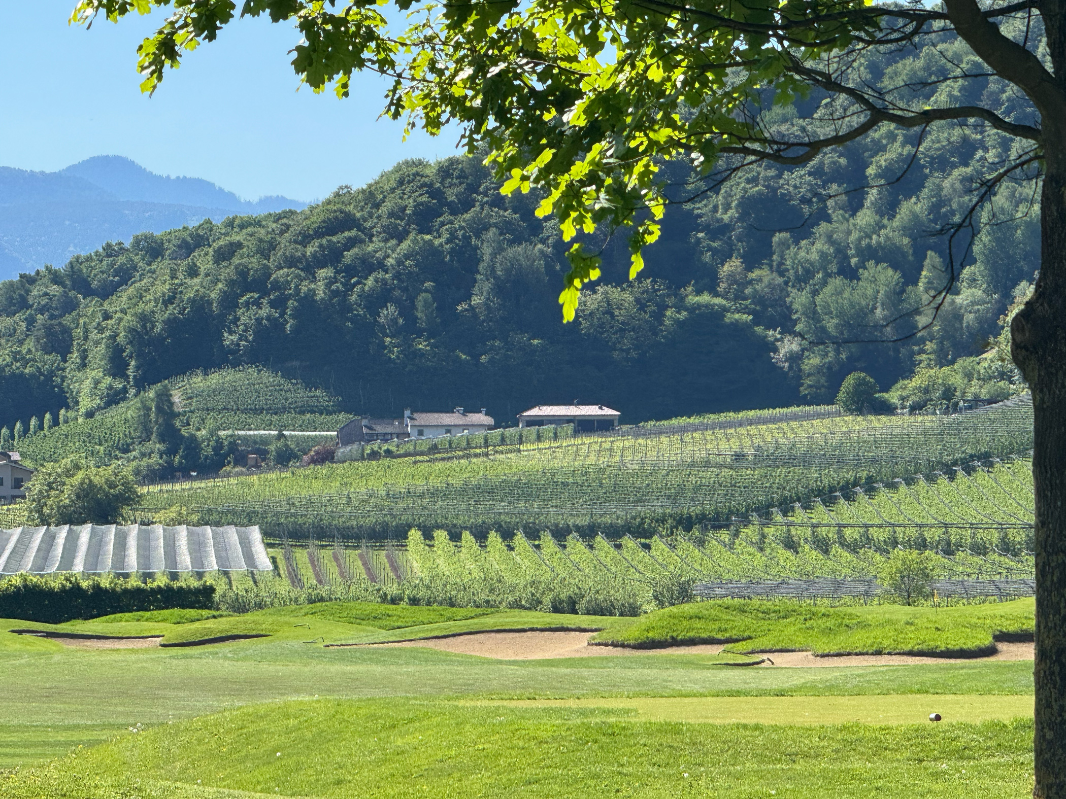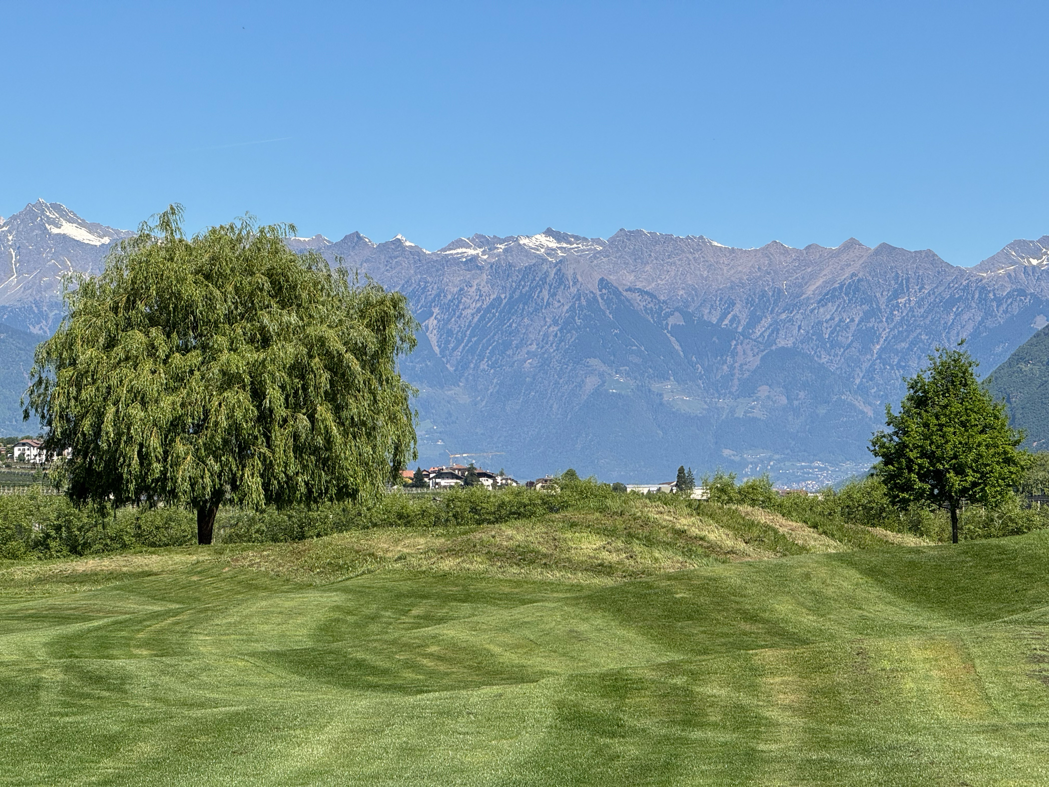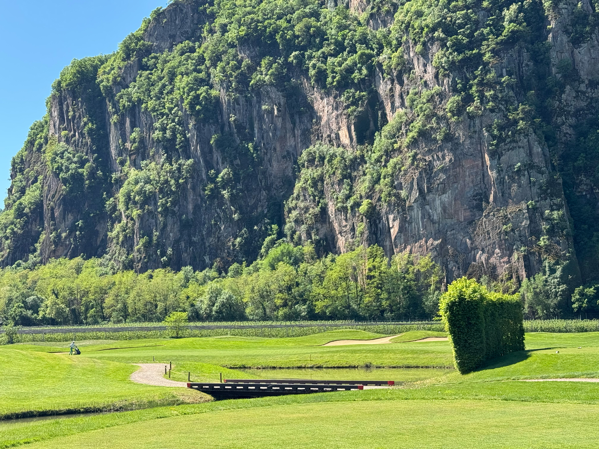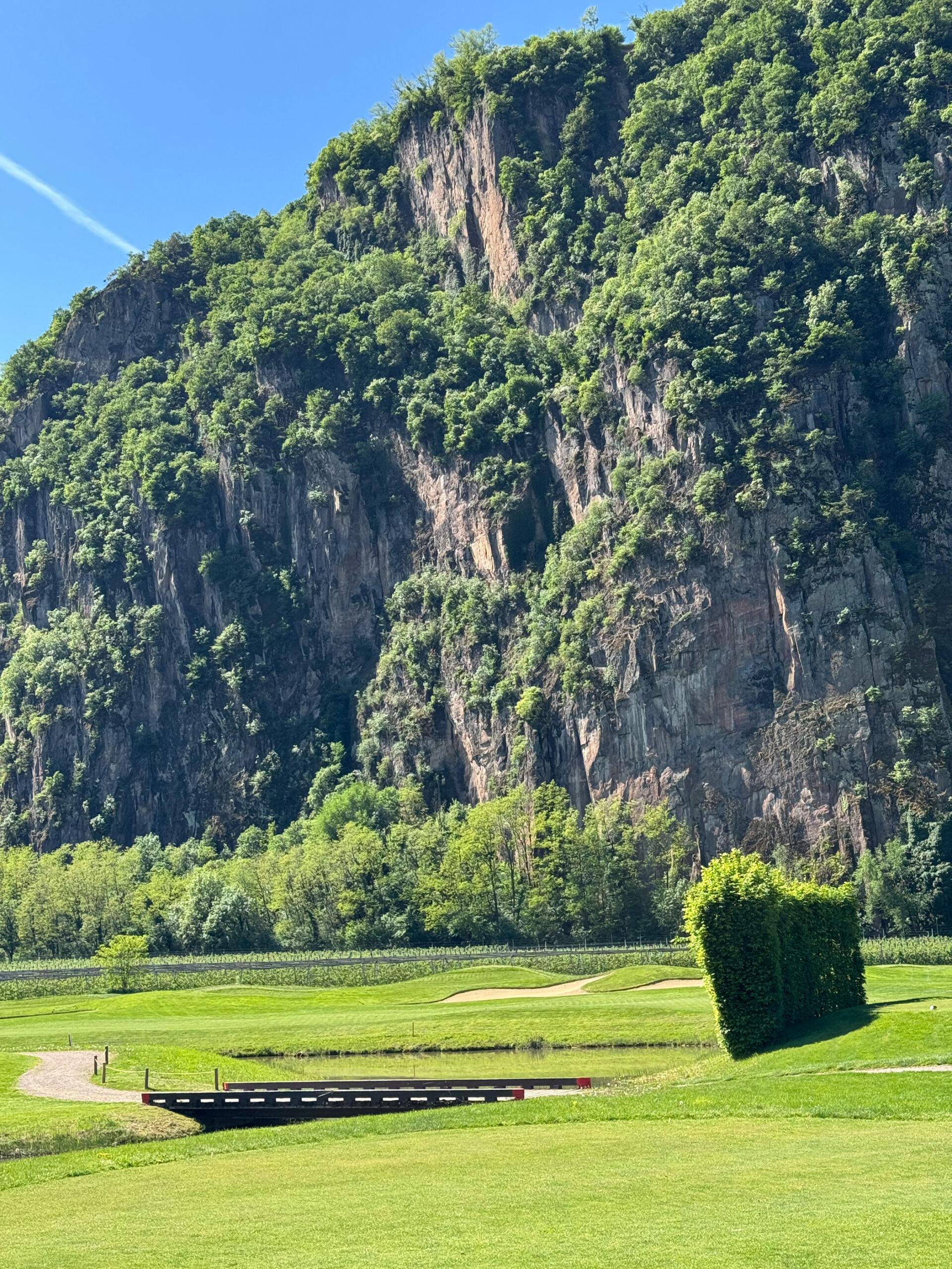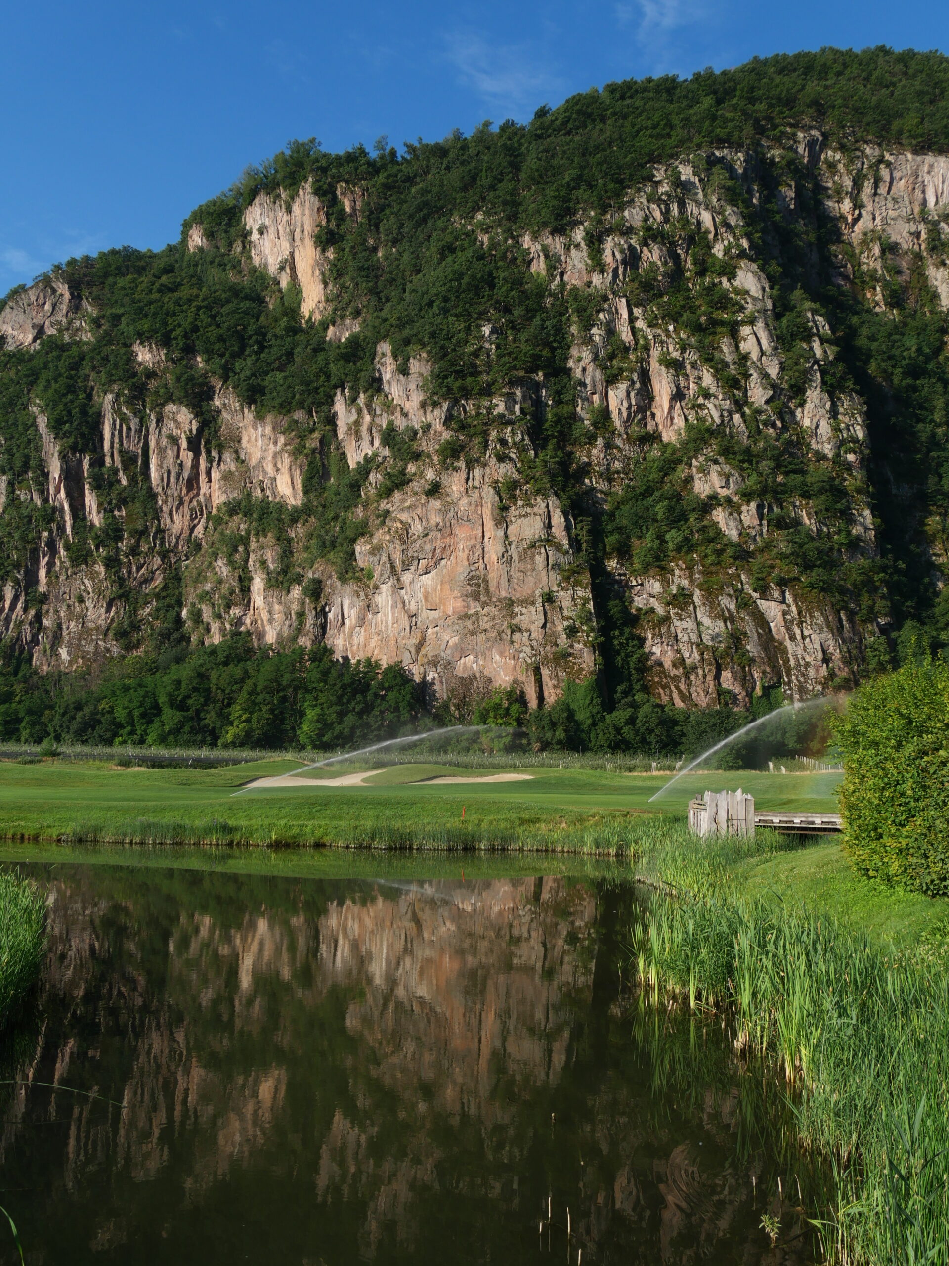 Die künstlichen Seen, die Modellierungen, die positionierten Bunker: alles erdacht. Der Golfplatz wurde 2015 auf einer ehemaligen Apfelplantage eröffnet und gehört der Familie Gostner. Man sieht es dem Boden noch an — diese Flachheit ist für Südtirol geradezu systemfremd.