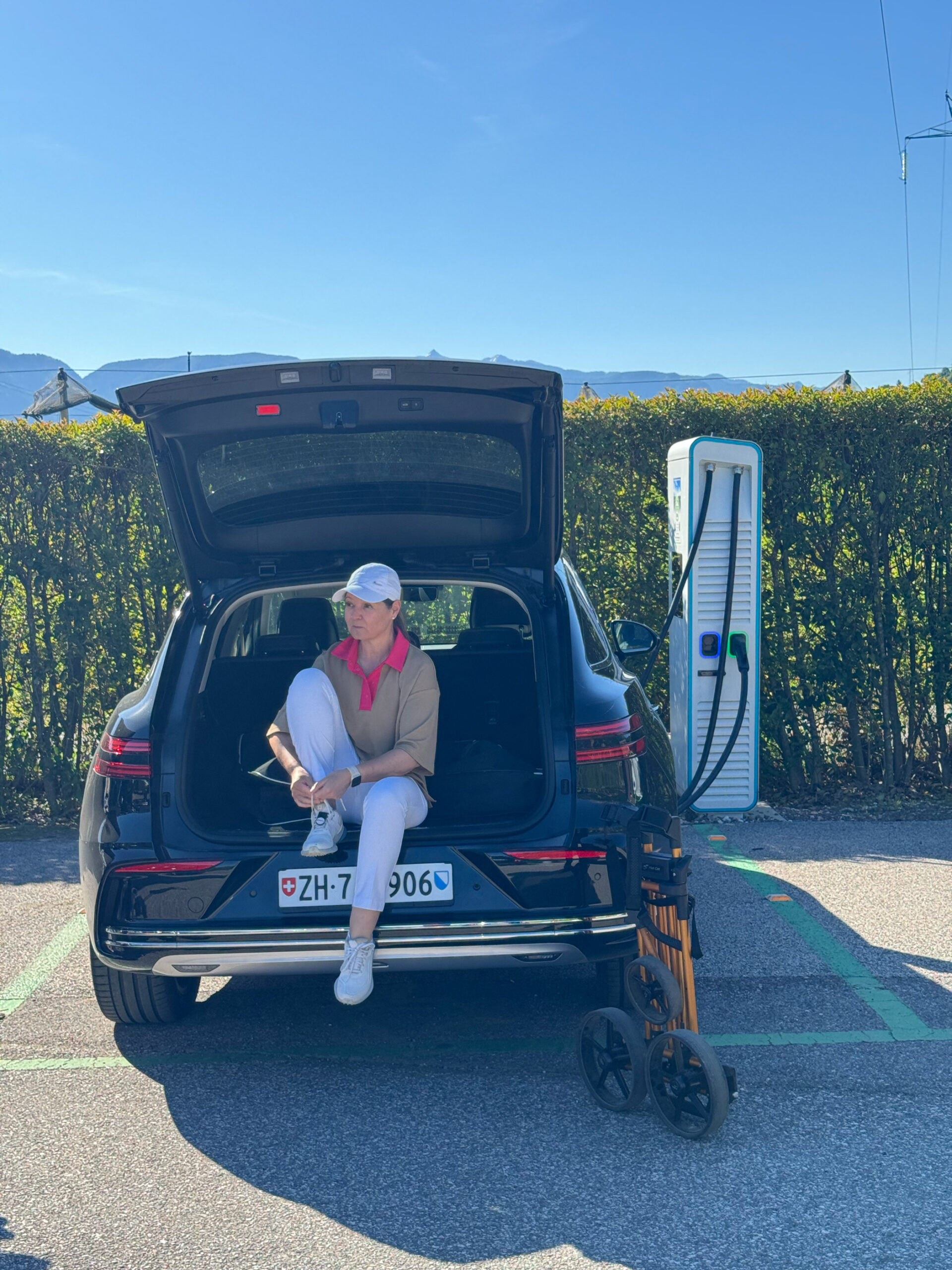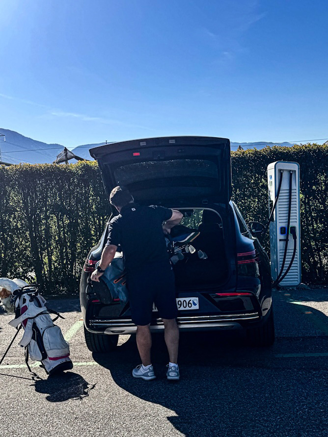 Direkt vor Ort stehen Ladestationen für Elektroautos zur Verfügung – praktisch, wenn man wie wir mit dem Genesis GV70 anreist und die Runde gleich für ein paar zusätzliche Kilometer Reichweite nutzt.