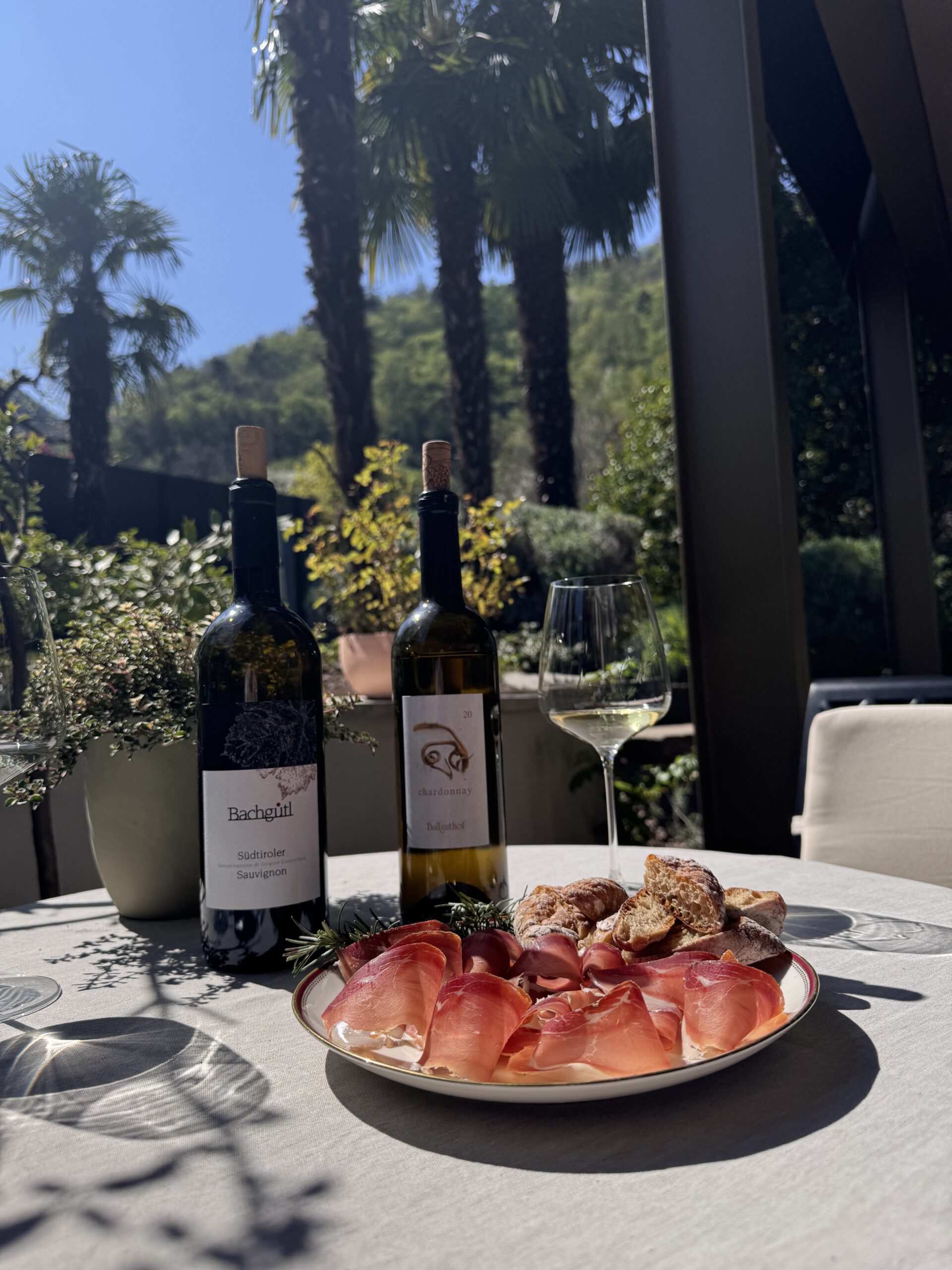 Denn im Ballguthof bedeutet Aperitivo nicht einfach nur ein Drink vor dem Abendessen, sondern: flüssige Lebensfreude auf Südtiroler Art. Andreas steht höchstpersönlich mit der Weinflasche bereit – und schenkt dir ein Gläschen vom hauseigenen Tropfen ein. Und zwar nicht irgendeinen: Hier wird ausgeschenkt, was auf eigenem Boden wächst. Mit viel Liebe kultiviert, mit noch mehr Stolz serviert – denn in der grosszügigen 12’000 m² Gartenanlage reifen Chardonnay- und Merlot-Trauben direkt neben der Liegewiese – Mehr „Lage“ geht kaum.