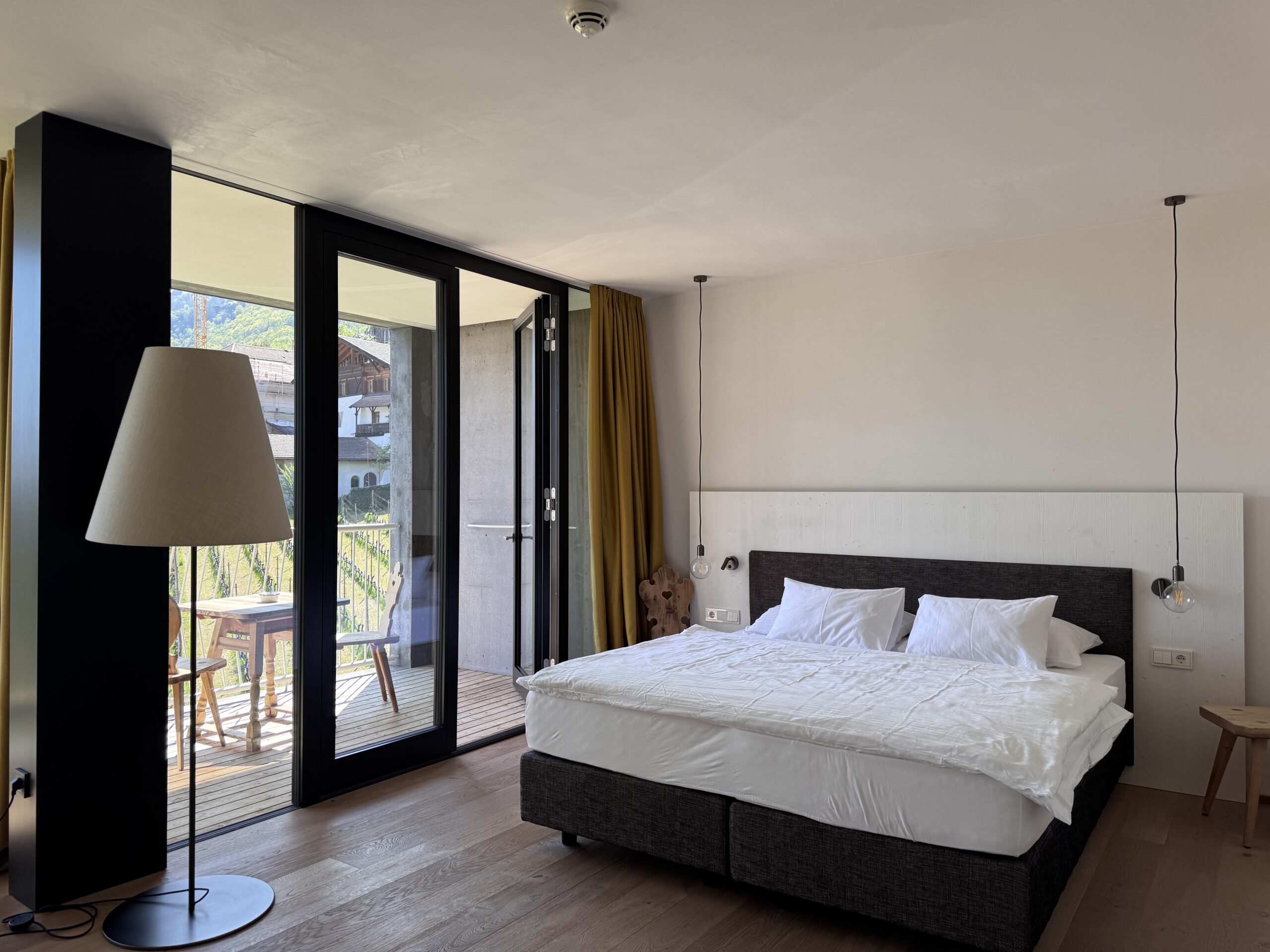 Unsere Appartementsuite «In die Aussicht 402» ist gross. Und zwar nicht nur so «Hotel-bisschen-grösser-als-normal»-gross, sondern wirklich: Platz zum Atmen, Drehen, Strecken – wenn ich wollte, könnte ich hier problemlos Yoga machen.