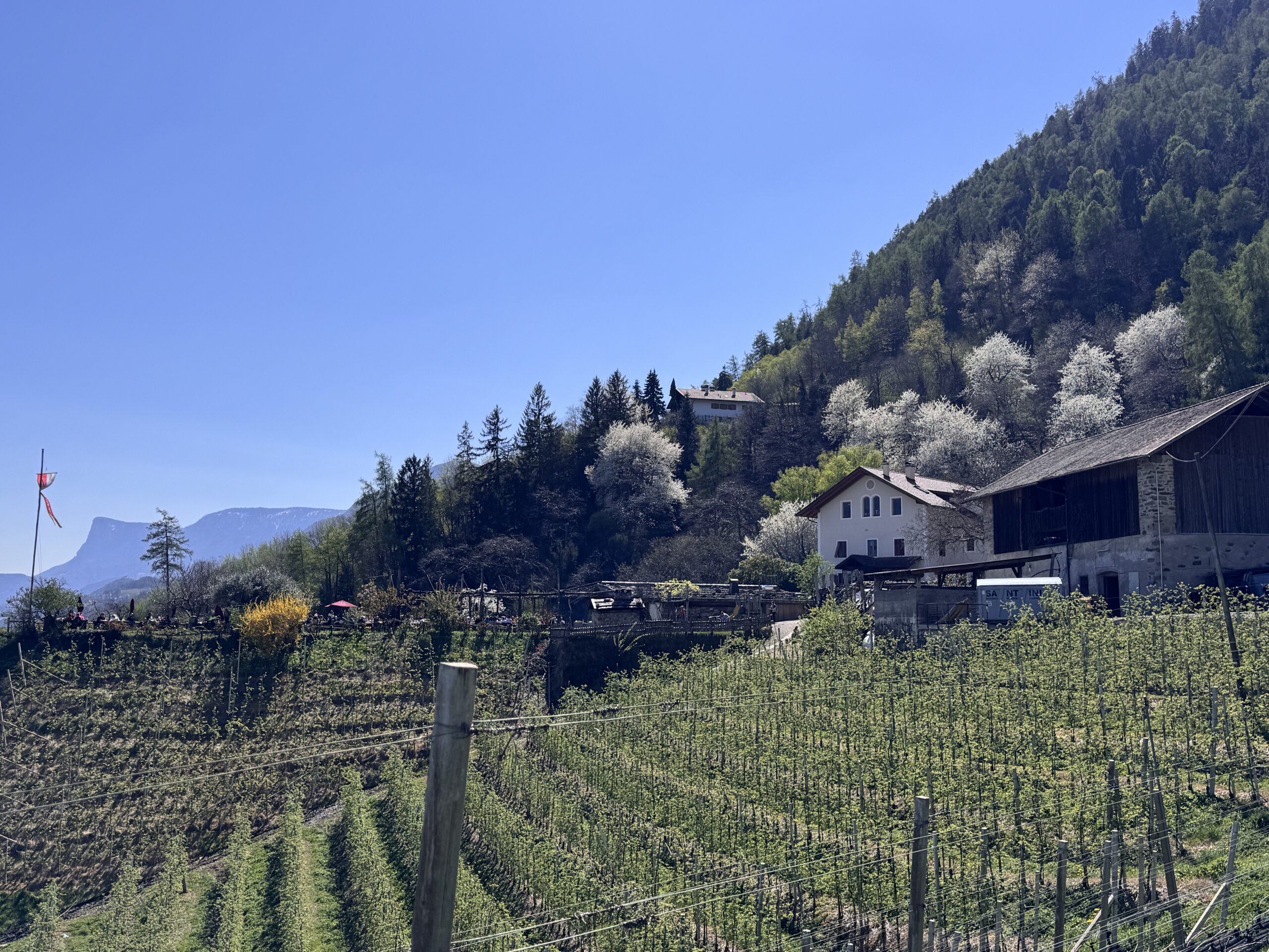 Gerade mal vor zwei Tagen hat der Buschenschank Haidenhof nach der Winterpause wieder seine Türen geöffnet – und jetzt bekommst du zur Mittagszeit draussen schon fast keinen Platz mehr. Hier ist Hochbetrieb. Kein Wunder: Die Aussicht ist unschlagbar, die Lage perfekt, und das Essen ein Gedicht. Der Familienbetrieb zählt zu den ältesten Höfen der Region – und Hausherr Hansi Erb ist übrigens der Bruder von Rosemarie, genau: der vom Boutique Hotel Ballguthof, unserem Hotel unten in Lana, direkt neben dem Golfplatz.