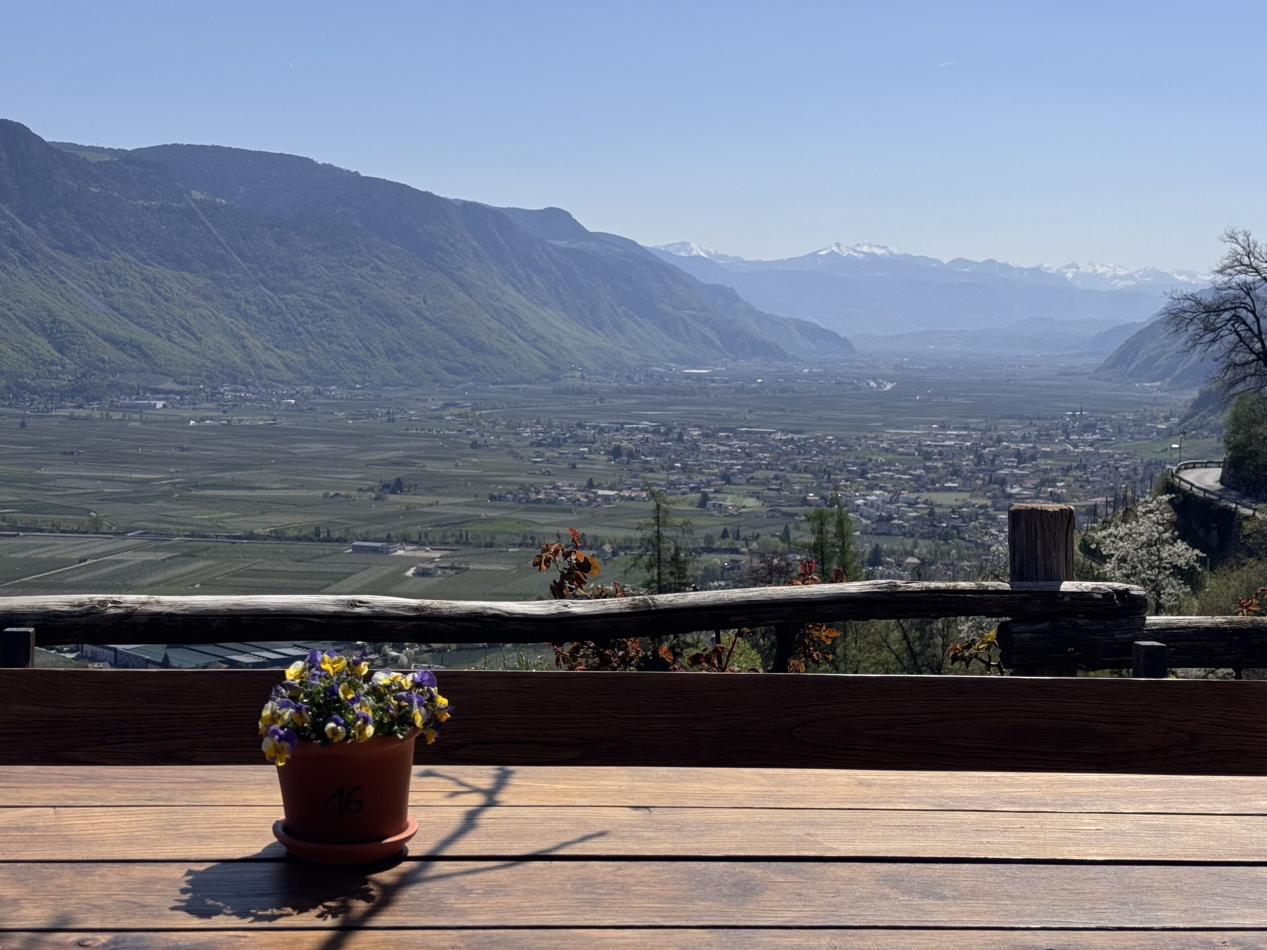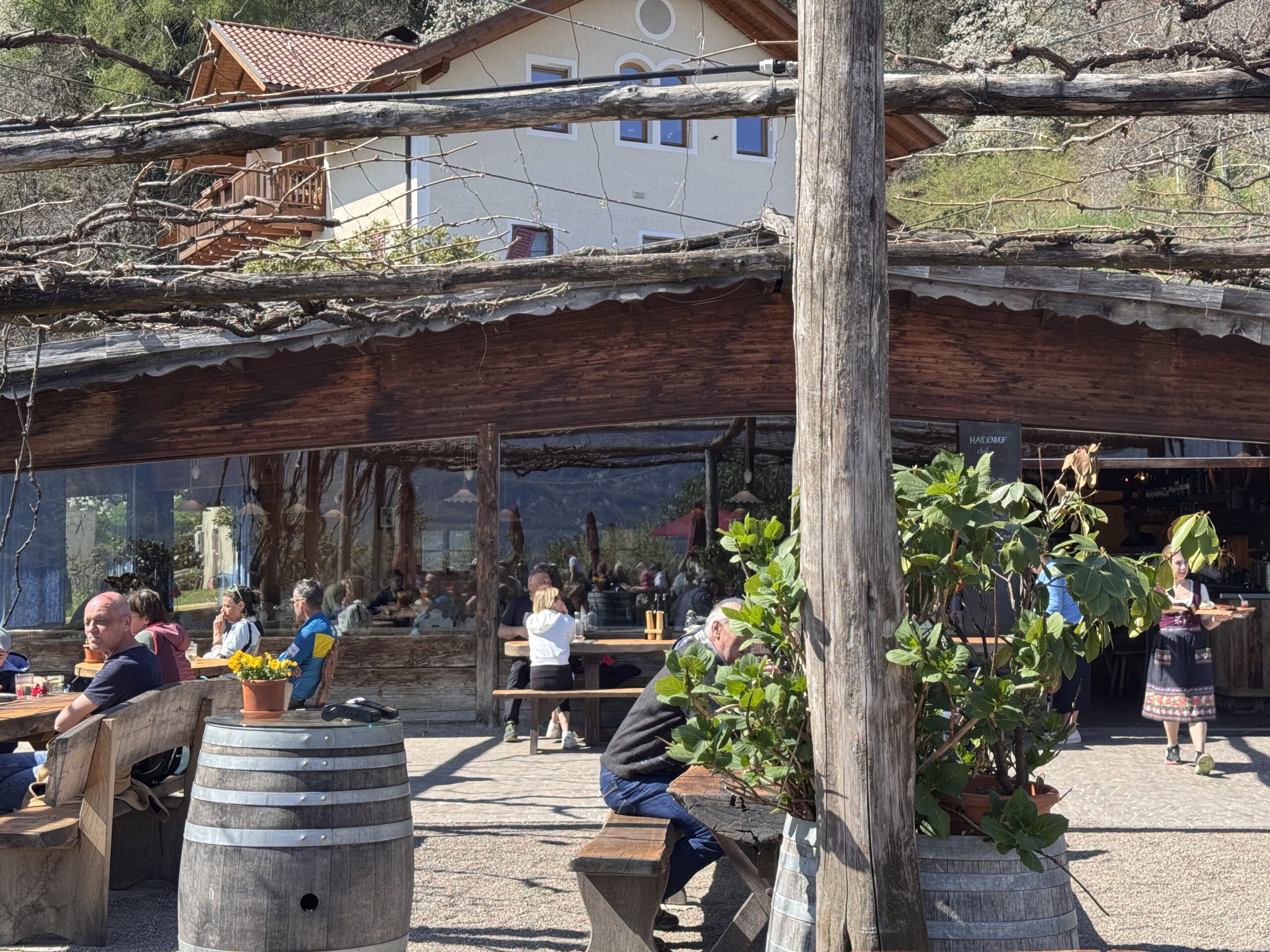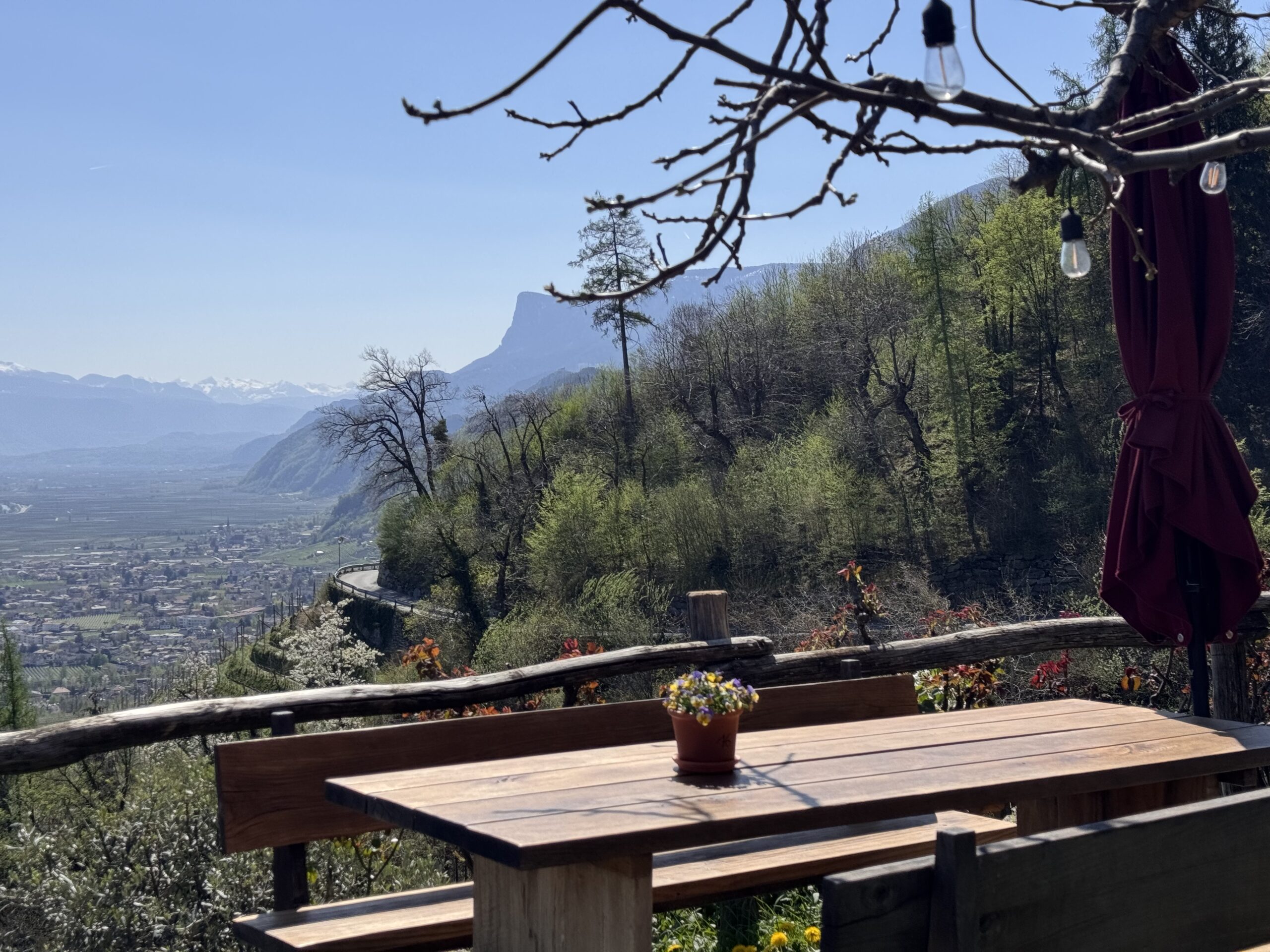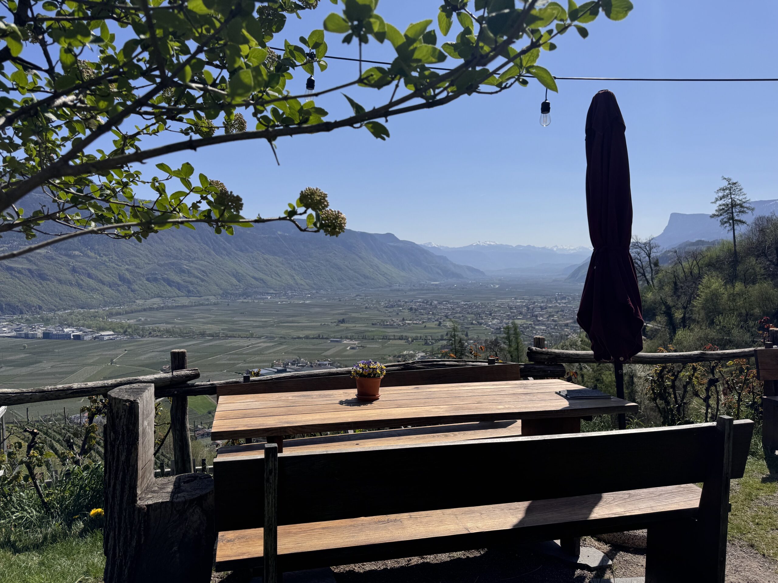 Gerade mal vor zwei Tagen hat der Buschenschank Haidenhof nach der Winterpause wieder seine Türen geöffnet – und jetzt bekommst du zur Mittagszeit draussen schon fast keinen Platz mehr. Hier ist Hochbetrieb. Kein Wunder: Die Aussicht ist unschlagbar, die Lage perfekt, und das Essen ein Gedicht. Der Familienbetrieb zählt zu den ältesten Höfen der Region – und Hausherr Hansi Erb ist übrigens der Bruder von Rosemarie, genau: der vom Boutique Hotel Ballguthof, unserem Hotel unten in Lana, direkt neben dem Golfplatz.