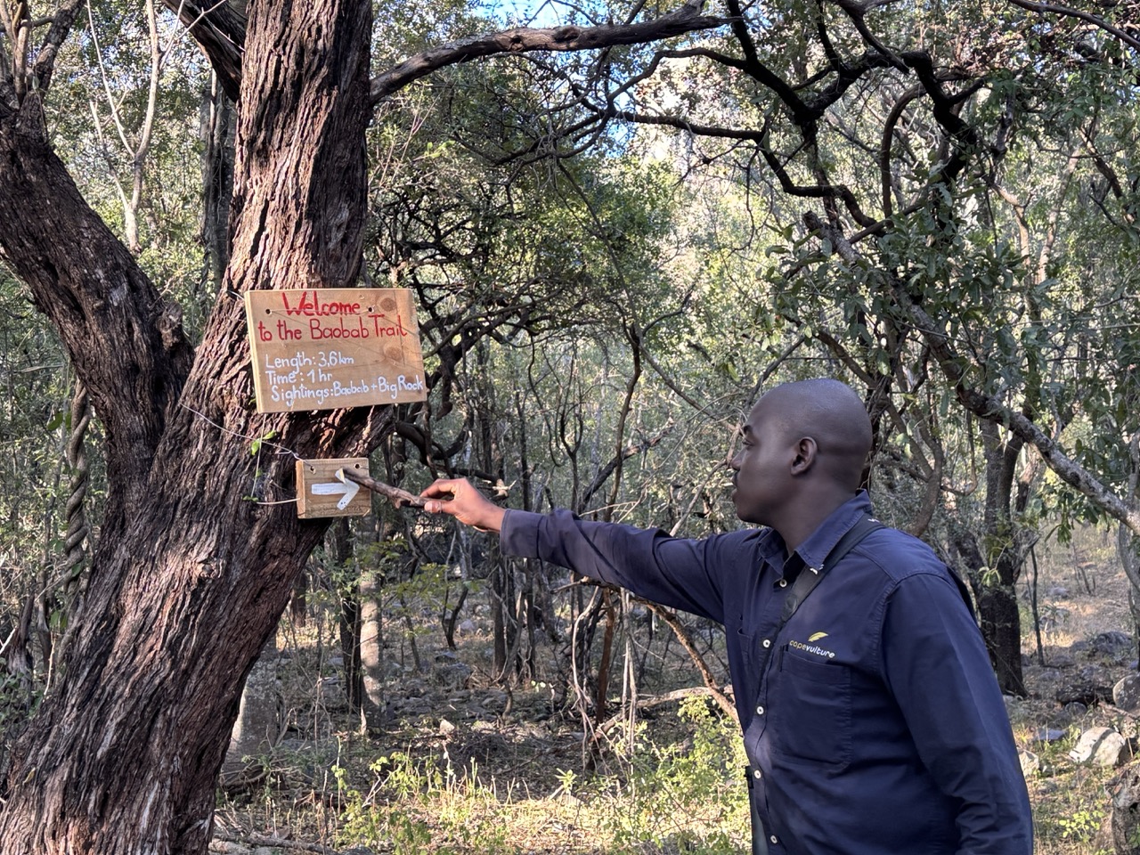 Wir schlüpfen also in unser Safari-Outfit, schnüren die Wanderschuhe – und los geht’s: hinein in den Baobab-Trail, zwei Stunden voller wilder Eindrücke. Der Pfad zieht sich durchs trockene Gras, führt vorbei an neugierigen Zebras und scheuen Kudus. Mal raschelt es im Busch, mal funkelt die Sonne durch das dichte, typisch afrikanische Dickicht. Jeder Schritt bringt uns tiefer hinein in diese ursprüngliche Welt, wo die Natur den Ton angibt.