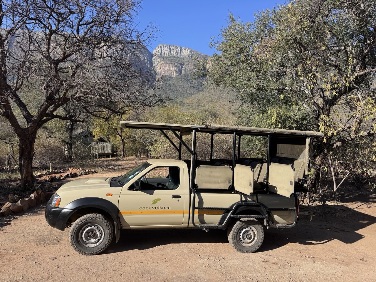Die Cape Vulture Lodge im Cape Vulture Nature Reserve unweit von Hoedspruit liegt im Herzen des Kruger-to-Canyon-Biosphärenreservats und engagiert sich aktiv für den Schutz der über 728 Brutpaare des gefährdeten Kapgeiers, die in den zum Reservat gehörenden Bergen nisten. Das Projekt mit der Lodge wurde 2020 gestartet und ist – wie Frikkie, der General Manager des Reservats, erklärt – nur ein kleiner Baustein, oder besser gesagt ein Beiwerk des Cape Vulture Conservancy. In nur vier Jahren wurde es offiziell als neuestes Naturreservat anerkannt. Frikkie scherzt: Es habe länger gedauert, die Wasserleitung bewilligt zu bekommen, als den Status als Naturreservat.