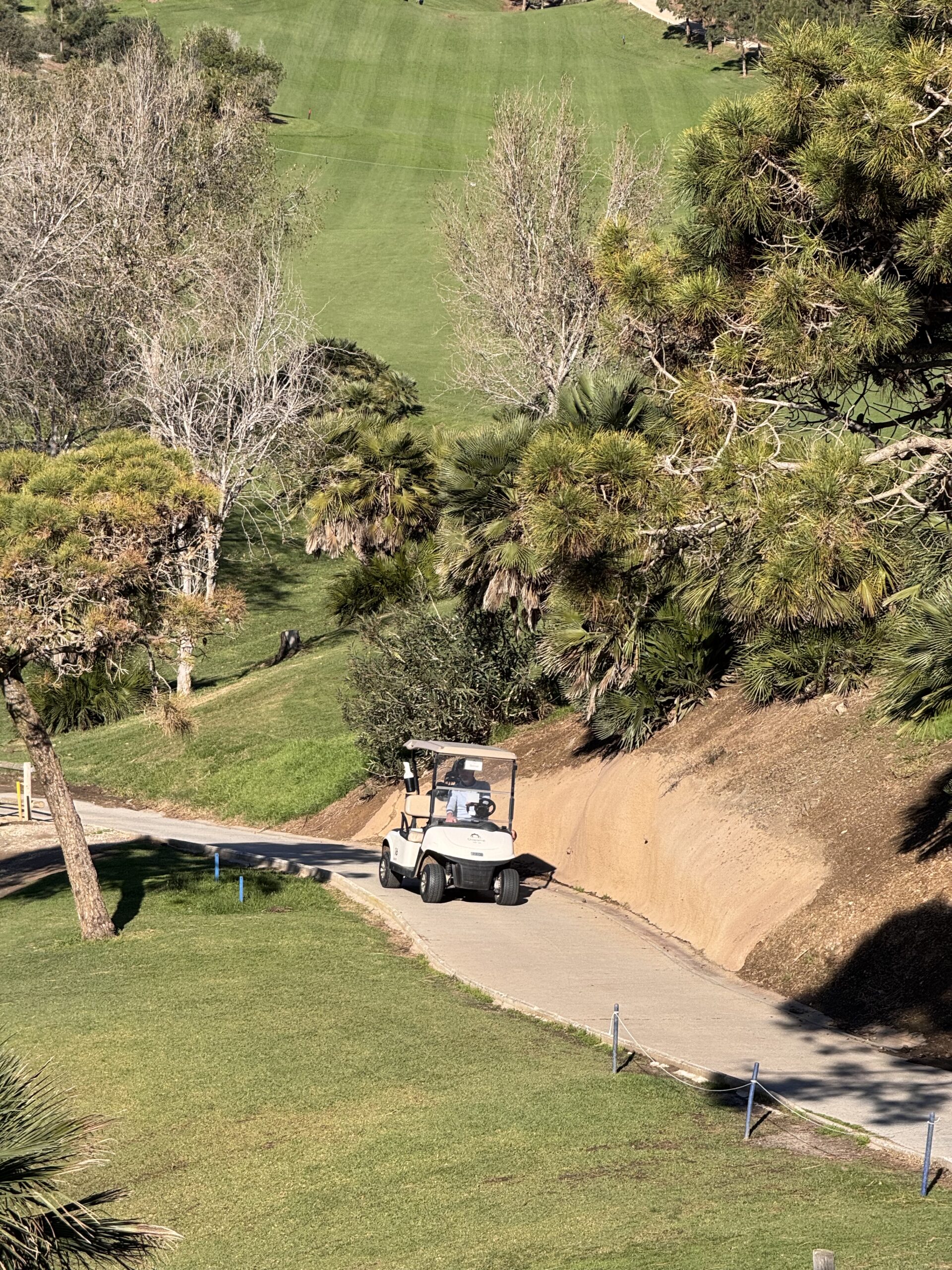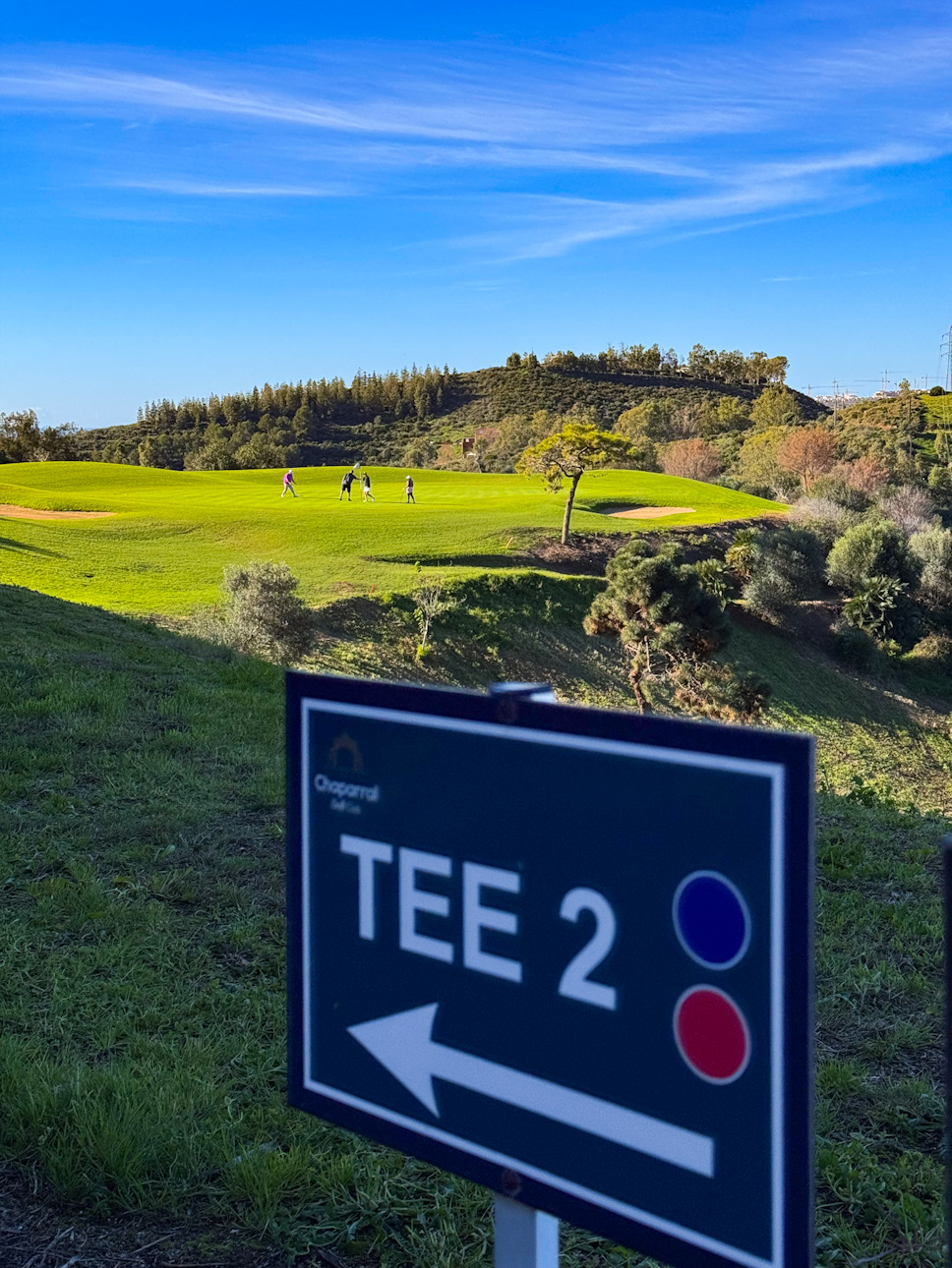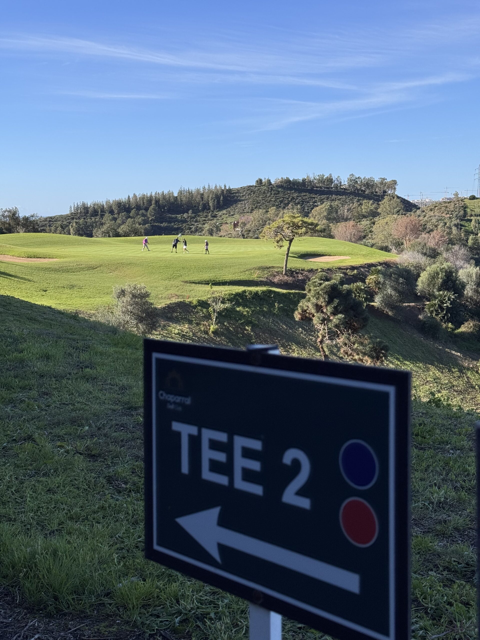 Im Chaparral Golf Club in Mijas ist ein Buggy absolut unverzichtbar – nicht etwa wegen steiler Anstiege, sondern wegen der langen Wege zwischen den Abschlägen. Diese kurzen Fahrten sind kleine, meditative Pausen, in denen du die Schönheit der andalusischen Landschaft geniessen kannst. Die Struktur des Platzes ist ungewöhnlich: 6 Par 5, 6 Par 4 und 6 Par 3. Besonders die Back Nine sind ein echter Hingucker – und eine Geduldsprobe. Unser persönliches Highlight? Ganz klar Loch 12 (Par 4). Das Grün scheint wie eine Fata Morgana über einem Graben zu schweben. Zweimal hinschauen ist Pflicht, um zu begreifen, wo genau der Ball landen soll. Sogar im Toilettenhäuschen zeigt sich der Humor des Clubs: Wegweiser helfen dir auf charmante Weise, den „Weg zum Glück“ zu finden.