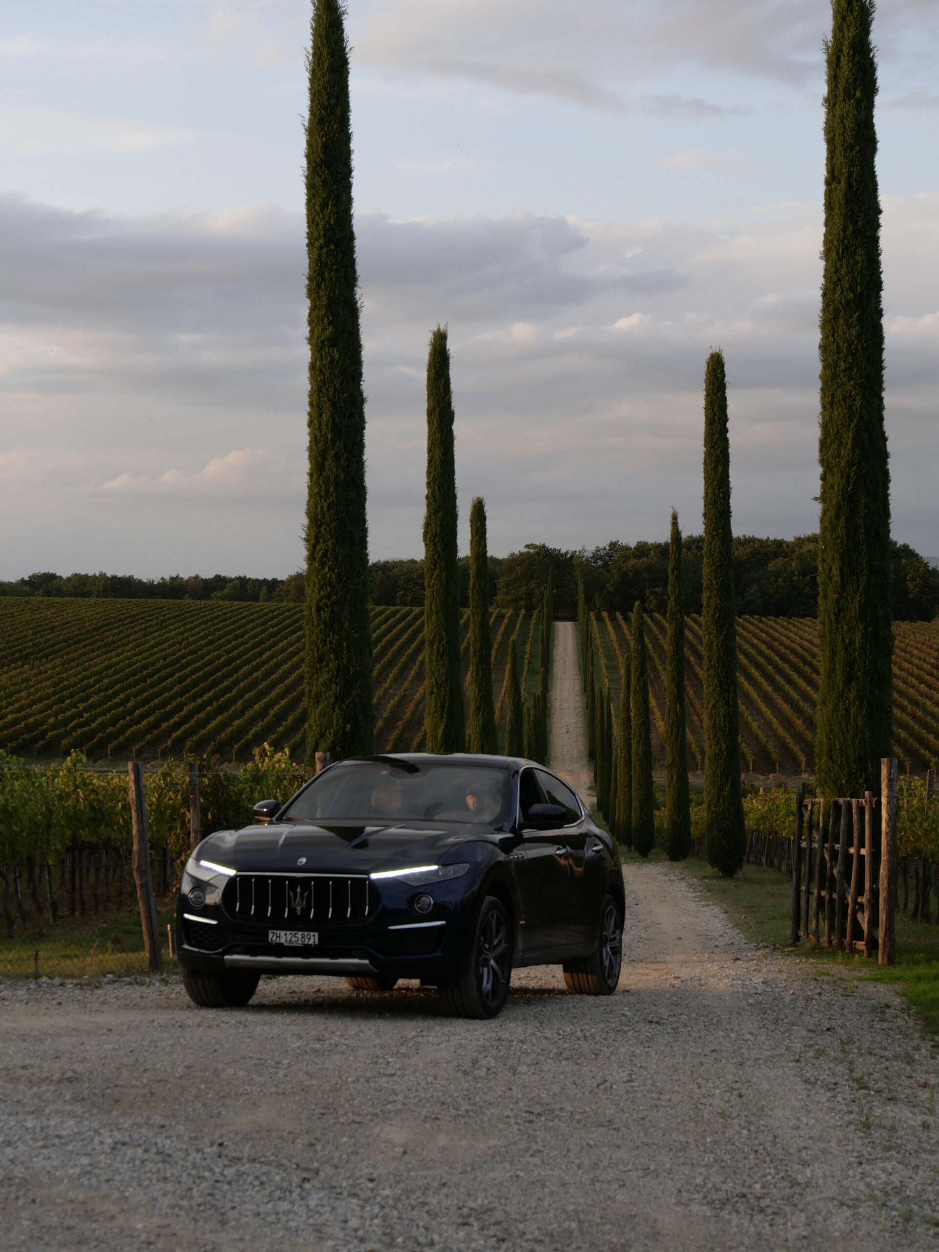Bilderbuch-Toskana und der Maserati Levante Luxus-SUV.