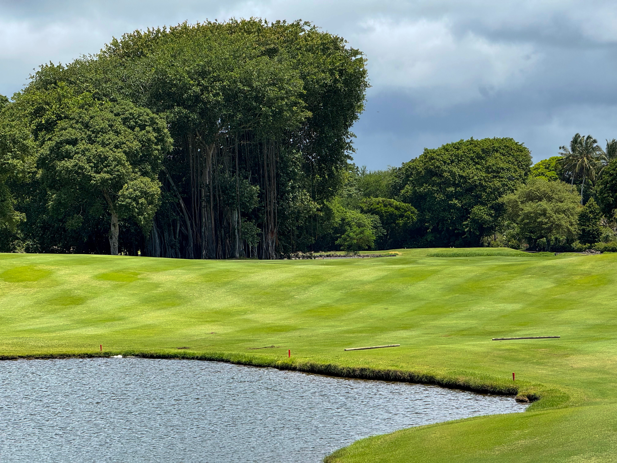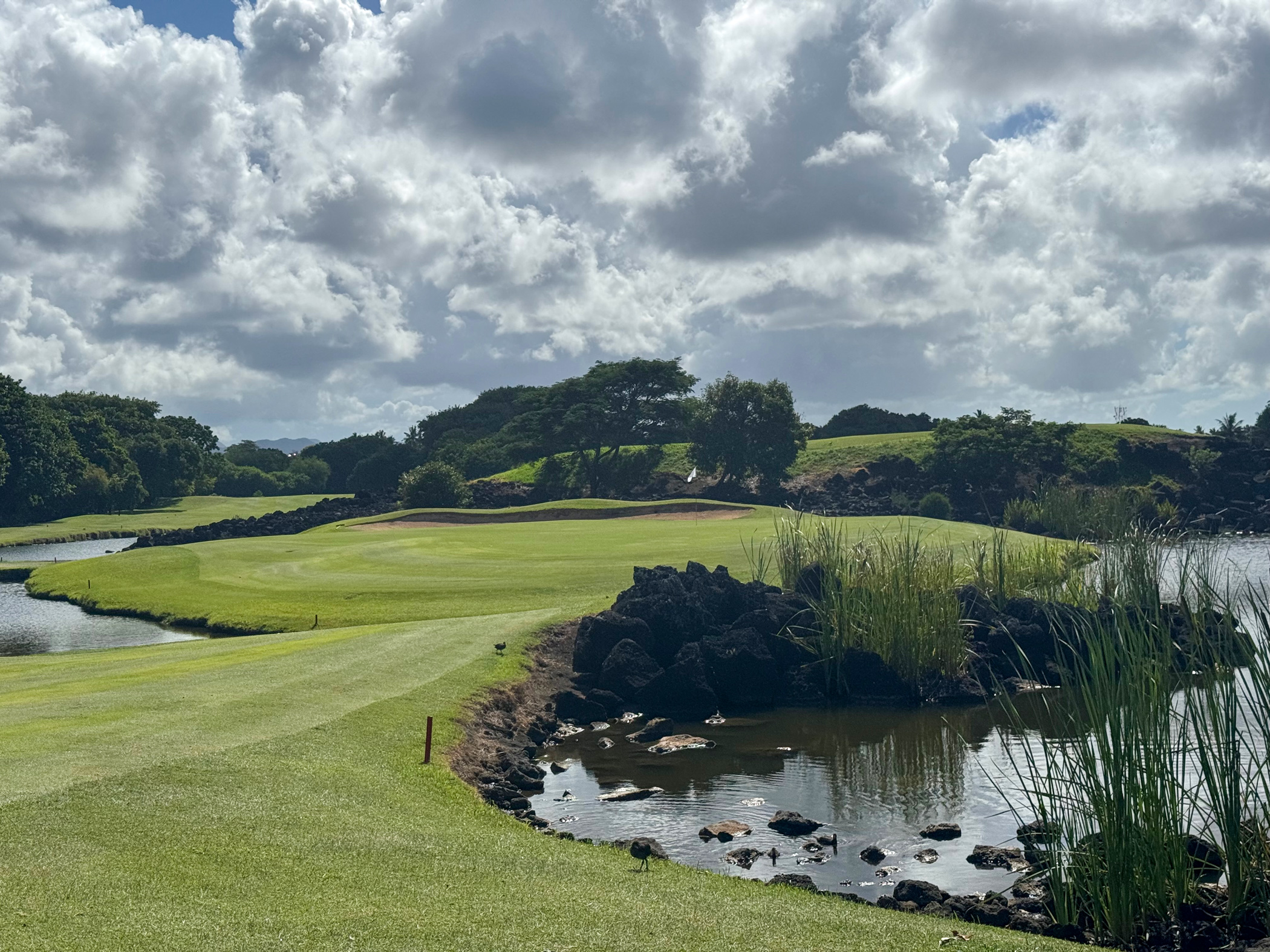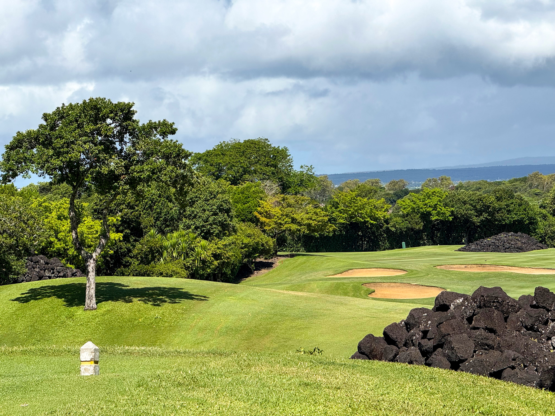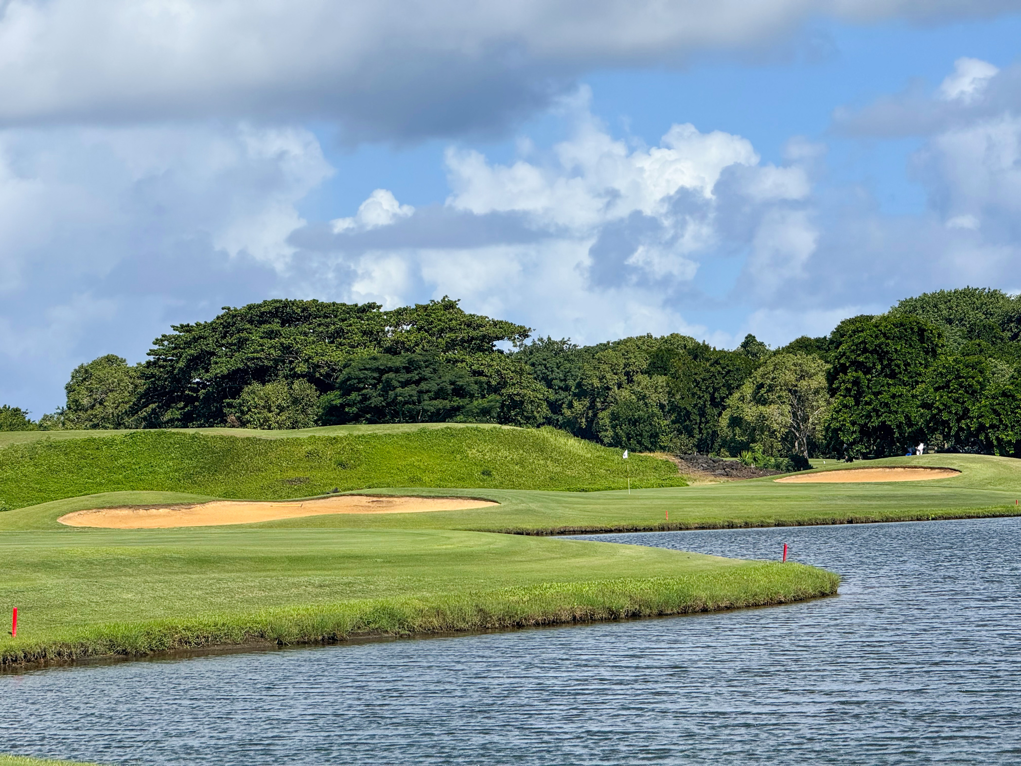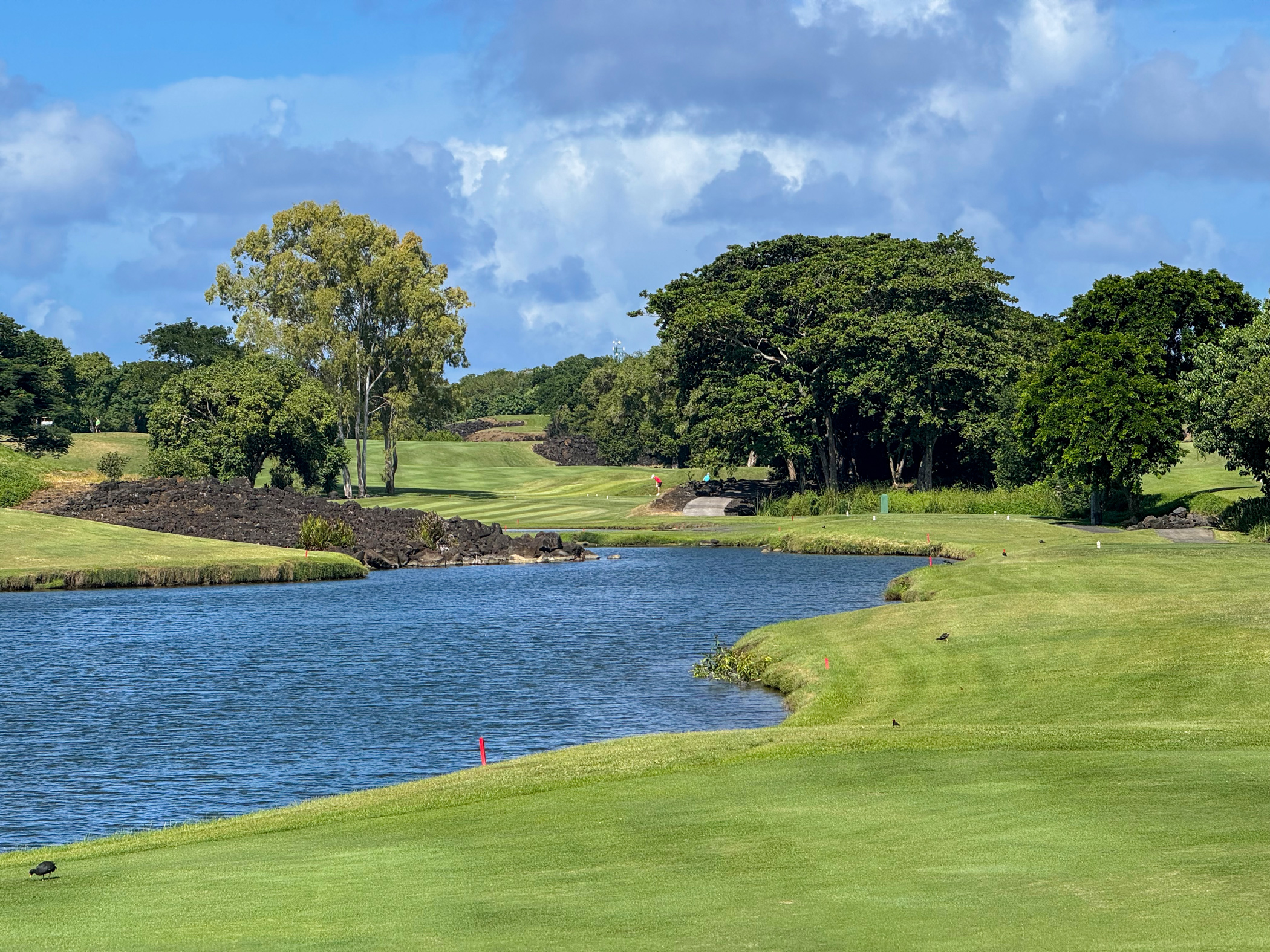 Und genau dieses Gefühl beginnt hier oft schon auf dem erhöhten Abschlag. Die Fairways des Links Course im Constance Belle Mare Plage wirken offener als jene drüben auf dem Legend Course, was vielleicht auch an diesen erhöhten Tees liegt. Wenn du dort oben stehst, öffnet sich der Blick über sattes Grün, Bunker, Wasserflächen und sanft modellierte Bahnen. Dazwischen ziehen sich immer wieder dunkle Linien aus schwarzem Vulkangestein durch das Bild. Sie geben dem Platz Kontur, formen Hügel, setzen Akzente und sehen dabei schlicht grossartig aus. Viele sagen, der Legend sei der schwierigere der beiden Plätze. Ich persönlich sehe das etwas anders.