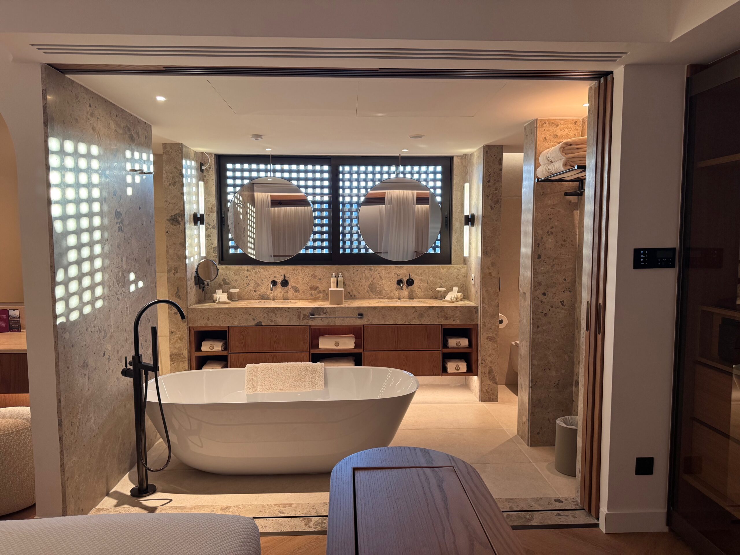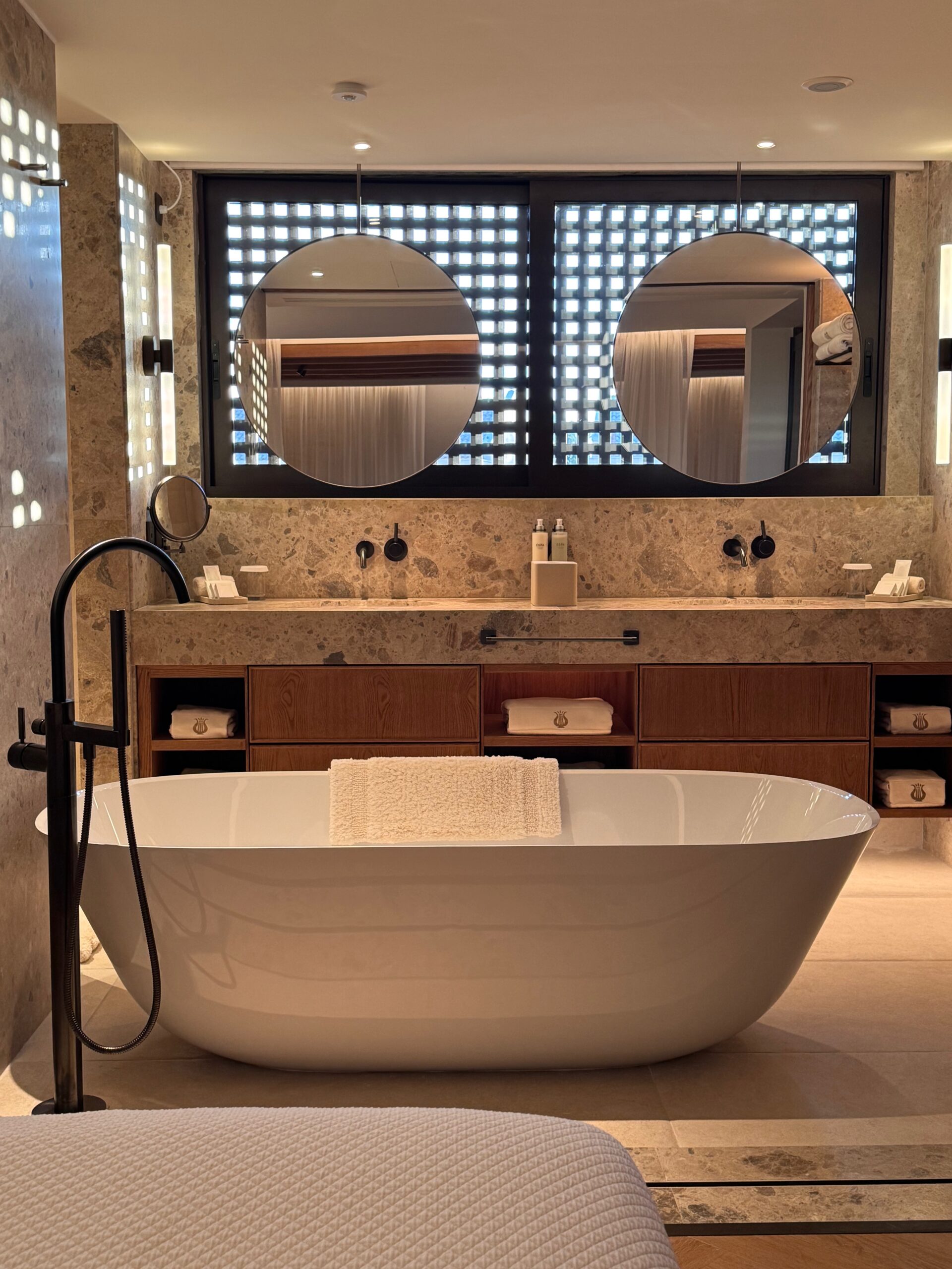 Alles hier fühlt sich nach me time an: Auf dem Nachttisch liegt das Kissenmenü. Die Nespresso-Maschine steht griffbereit, abends sorgt der Turn-Down-Service für eine Extraportion Wohlfühlgefühl. Dazu dimmbares Licht per Touch-Panel, Bademäntel so flauschig wie Wolken und eine freistehende Badewanne, in die ich später noch eintauchen werde. Für diesen einen Moment. Für diesen Urlaub. Für mich.
