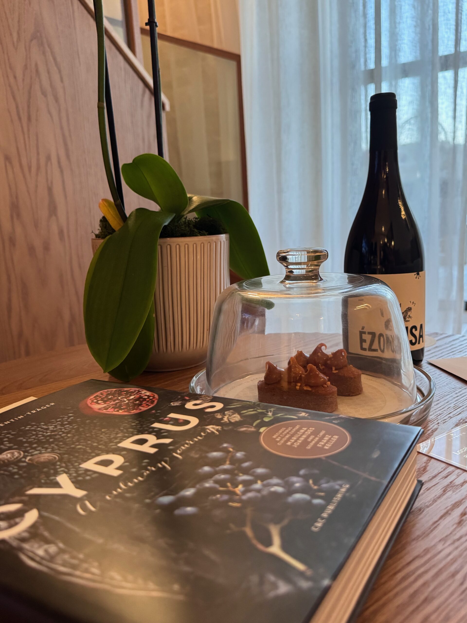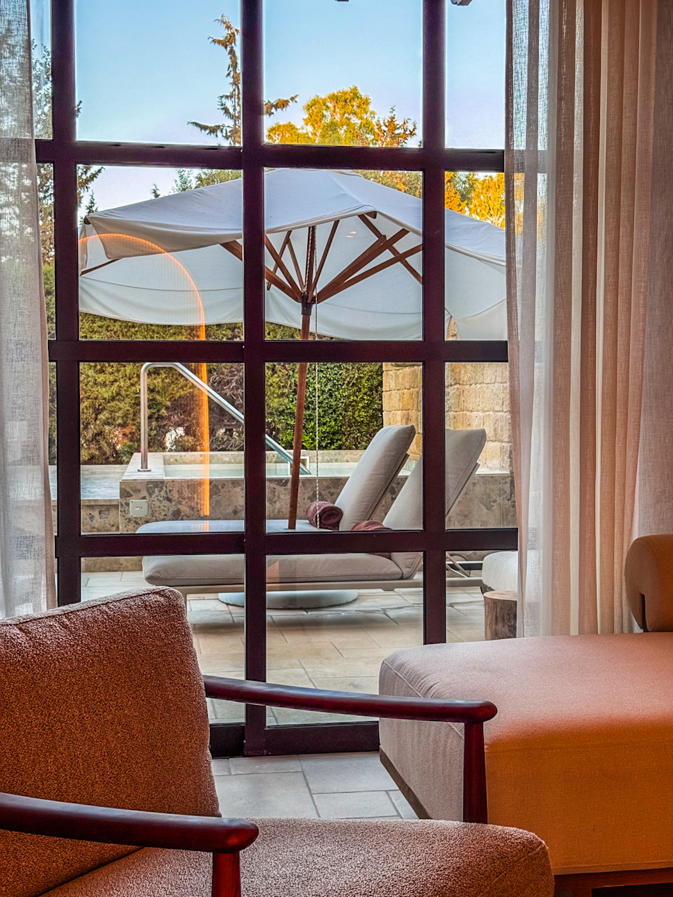 Hinter den gläsernen Schiebetüren wartet ein kleines Paradies: ein privater Pool mit zwei Sonnenliegen – Privatsphäre hast du hier auf jeden Fall. Die Nachbarn müssten schon auf etwas steigen, um über die Mauer zum anderen hinüberzuschauen. Das zypriotische Licht spielt auch hier seine Show: erst grell, dann golden, schliesslich rosa-orange Dämmerung. Und dann wartet im Zimmer ein Glas zypriotischer Rotwein, begleitet von feinen Karamell-Törtchen als Willkommensgruss.