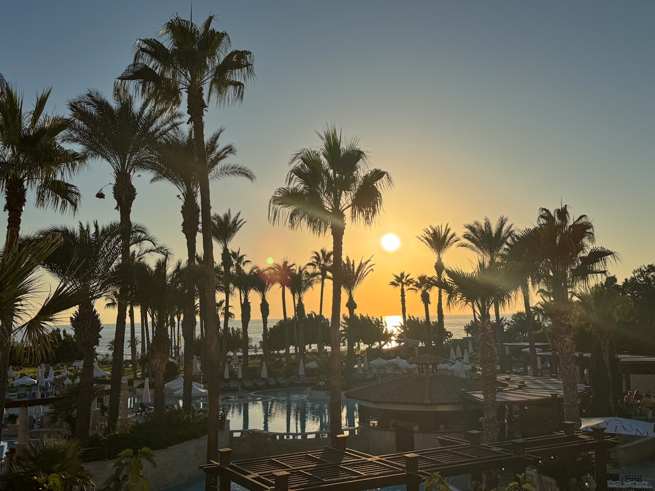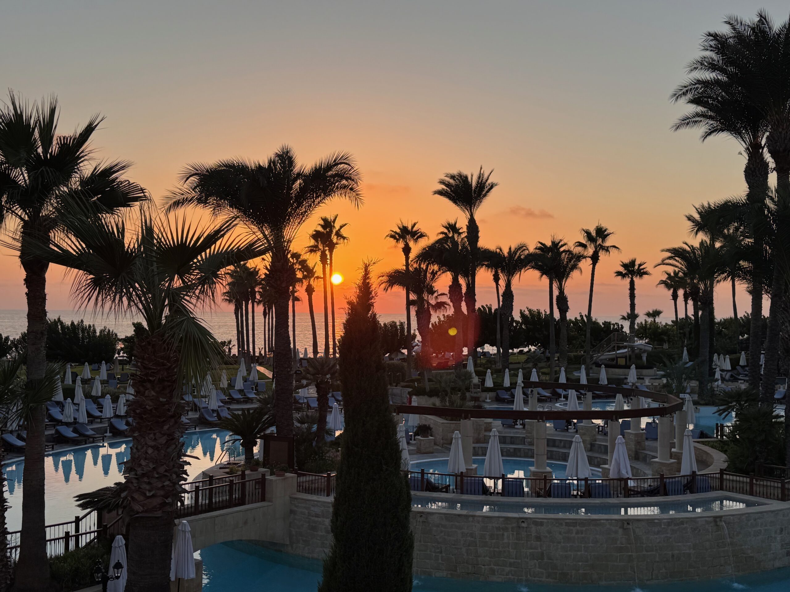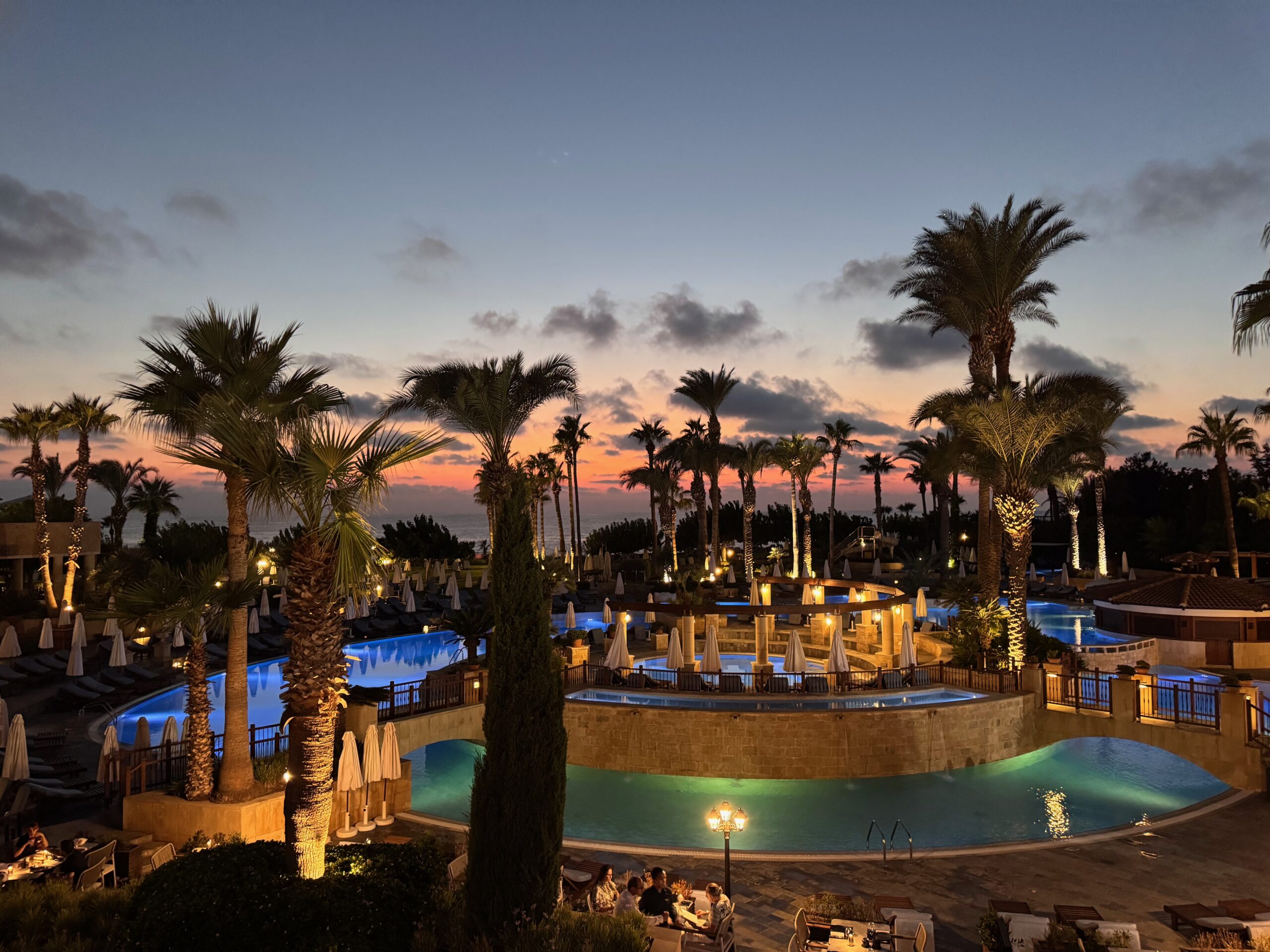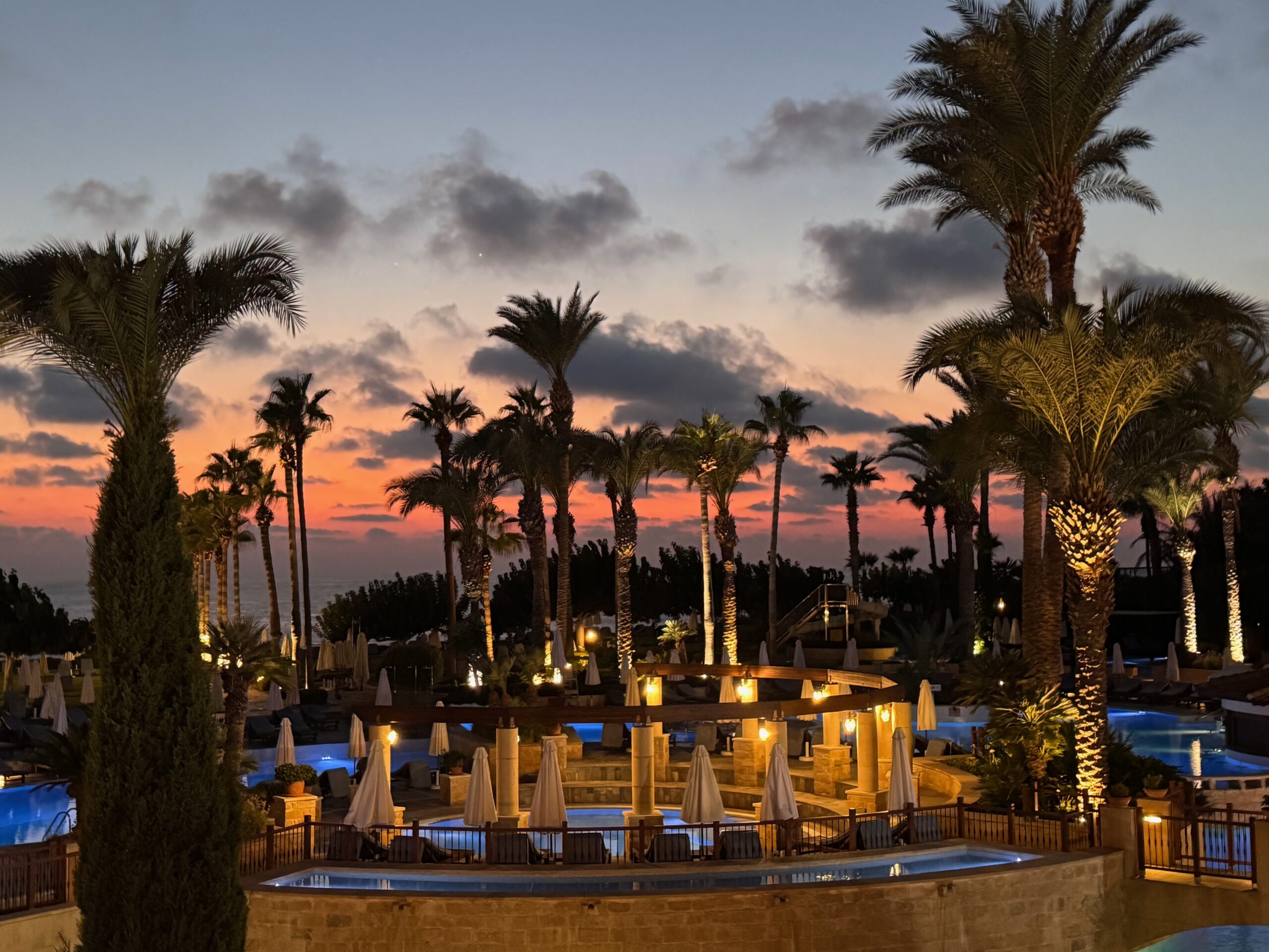 Die Stimmung im Hotel nach einer heissen Golfrunde bei 36 Grad im September ist genau so, wie man sich Ferien wünscht. Das Meer funkelt, während die Sonne langsam hinter den Palmen der weitläufigen Poollandschaft versinkt. Vom Zimmerbalkon oder mit einem kühlen Drink an der Bar erlebst du dieses Schauspiel hautnah – begleitet von kleinen zypriotischen Häppchen, die genauso süchtig machen wie das Panorama. Die Atmosphäre wird untermalt von sanfter Loungemusik, und wenn der Abend fortschreitet, sorgen Musiker live mit neu interpretierten Ed-Sheeran-Songs für romantische Gänsehaut. Klingt kitschig? Vielleicht. Aber ganz ehrlich – genau so fühlt es sich an.