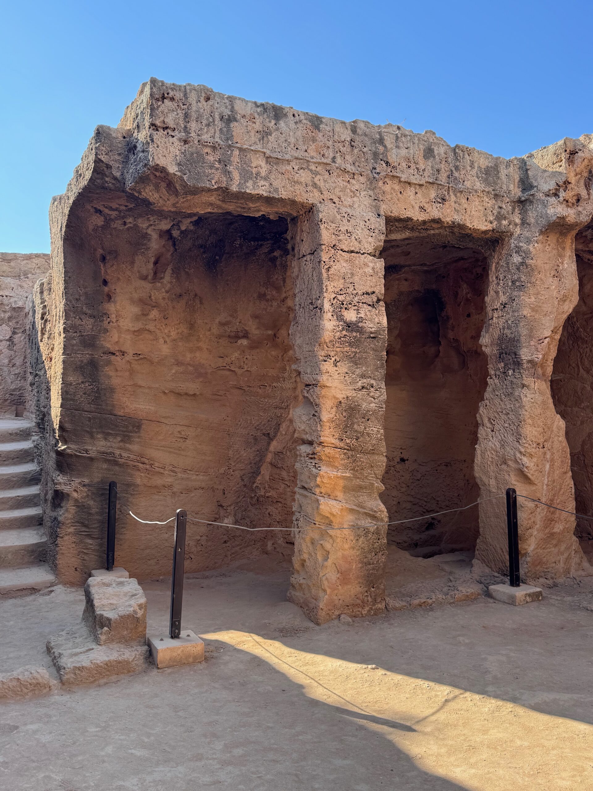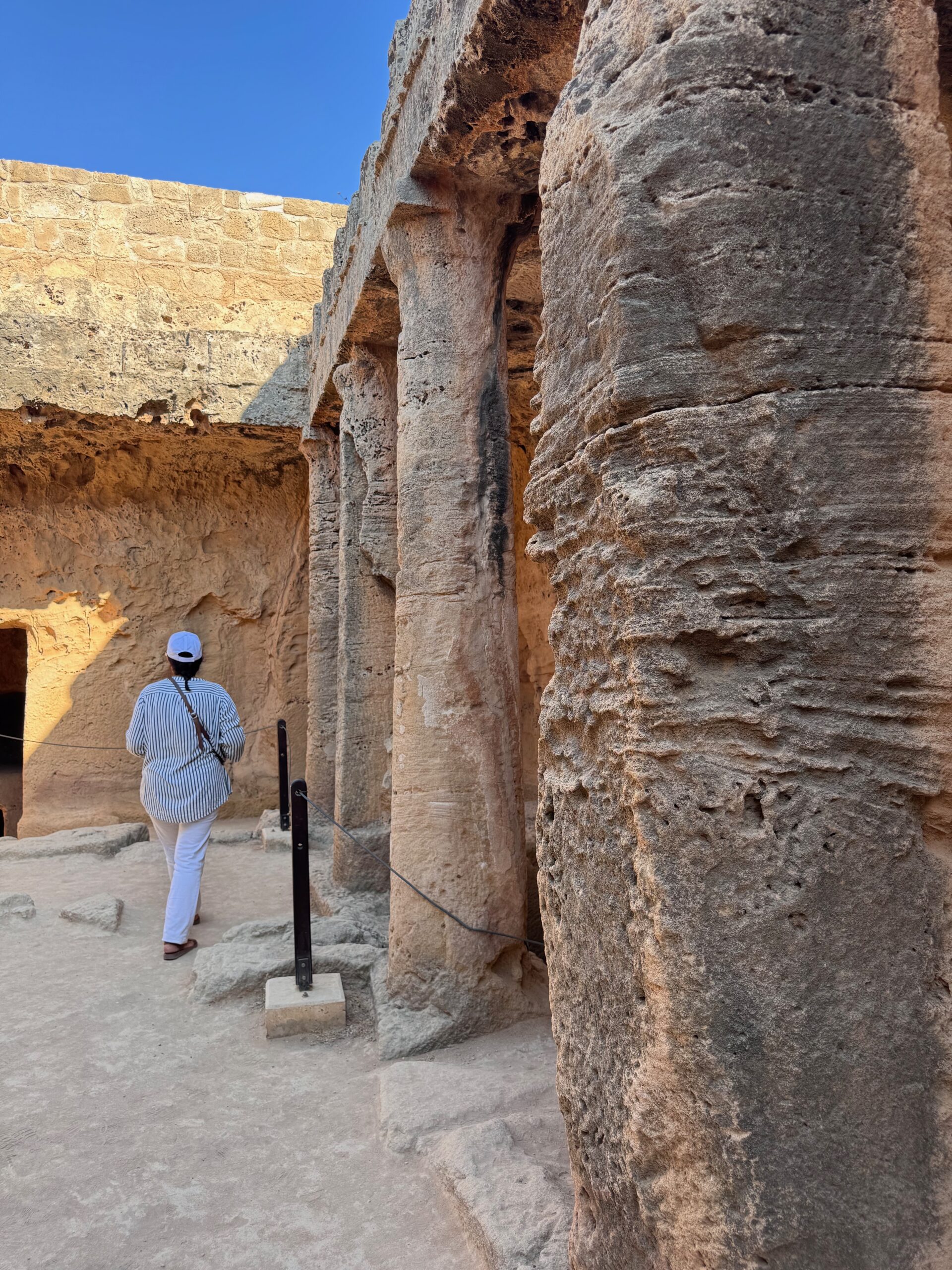 Nur ein paar Schritte vom Elysium Hotel entfernt liegen die Königsgräber von Nea Paphos – international bekannt als Tombs of the Kings. Zugegeben: Hier fanden keine Könige ihre letzte Ruhe, sondern hochrangige Beamte und Adlige der hellenistischen und römischen Zeit. Auf den ersten Blick wirkt die Anlage wie eine Ansammlung brauner, steinerner Vertiefungen. Doch beim Näherkommen offenbart sich ihre ganze Pracht: direkt in den Fels gehauen, mit dorischen Säulen, Atrien und fast palastartigen Strukturen.