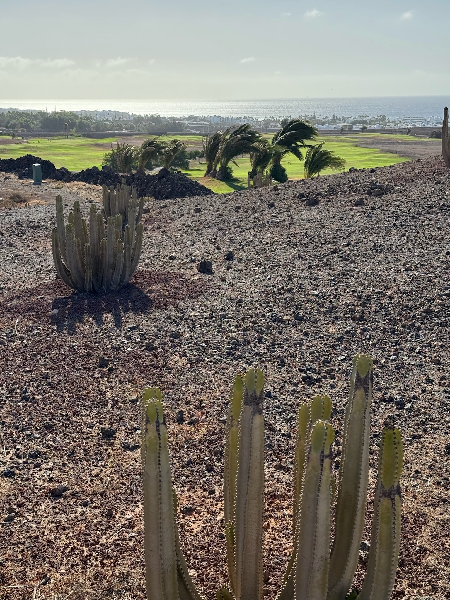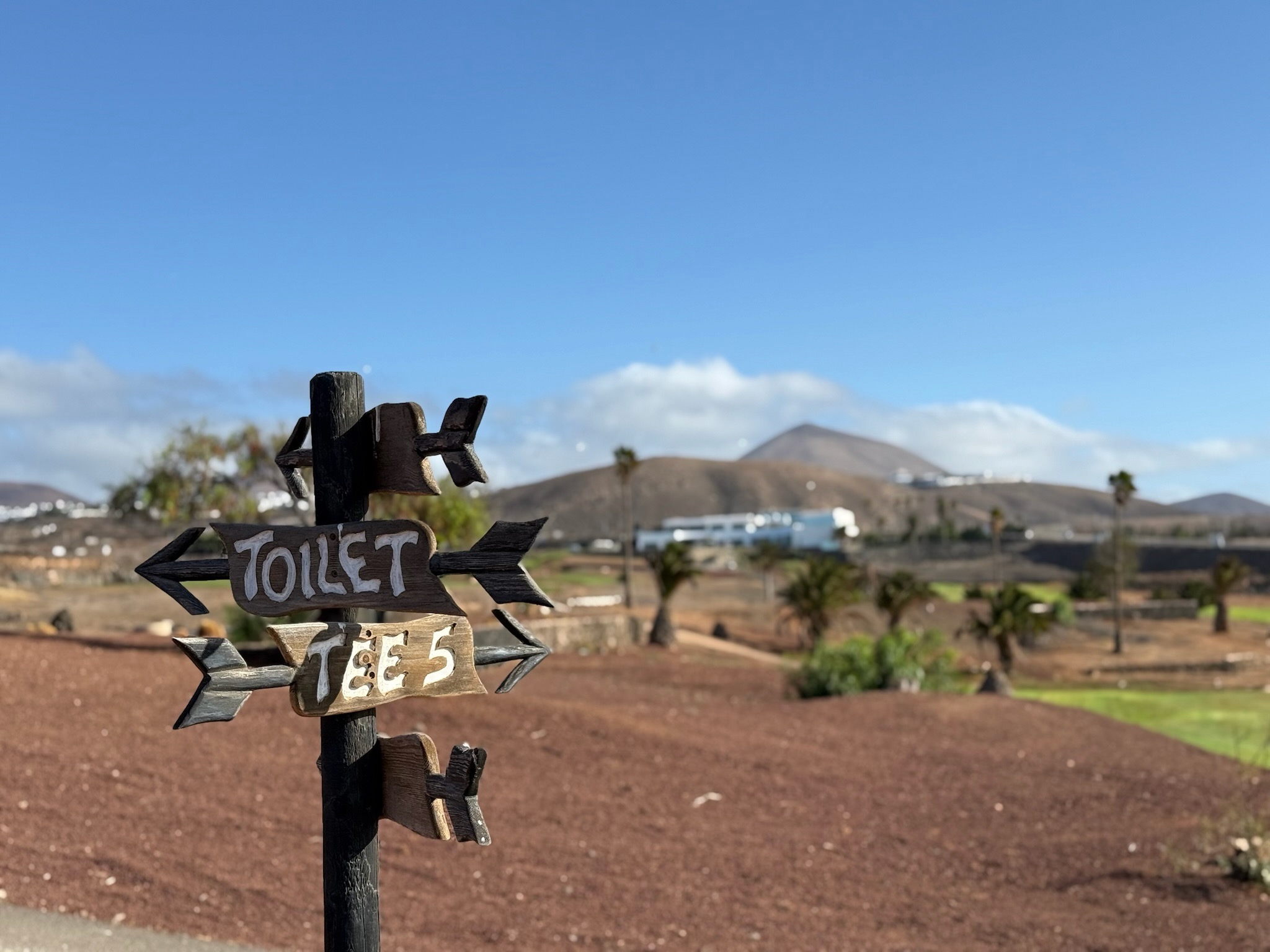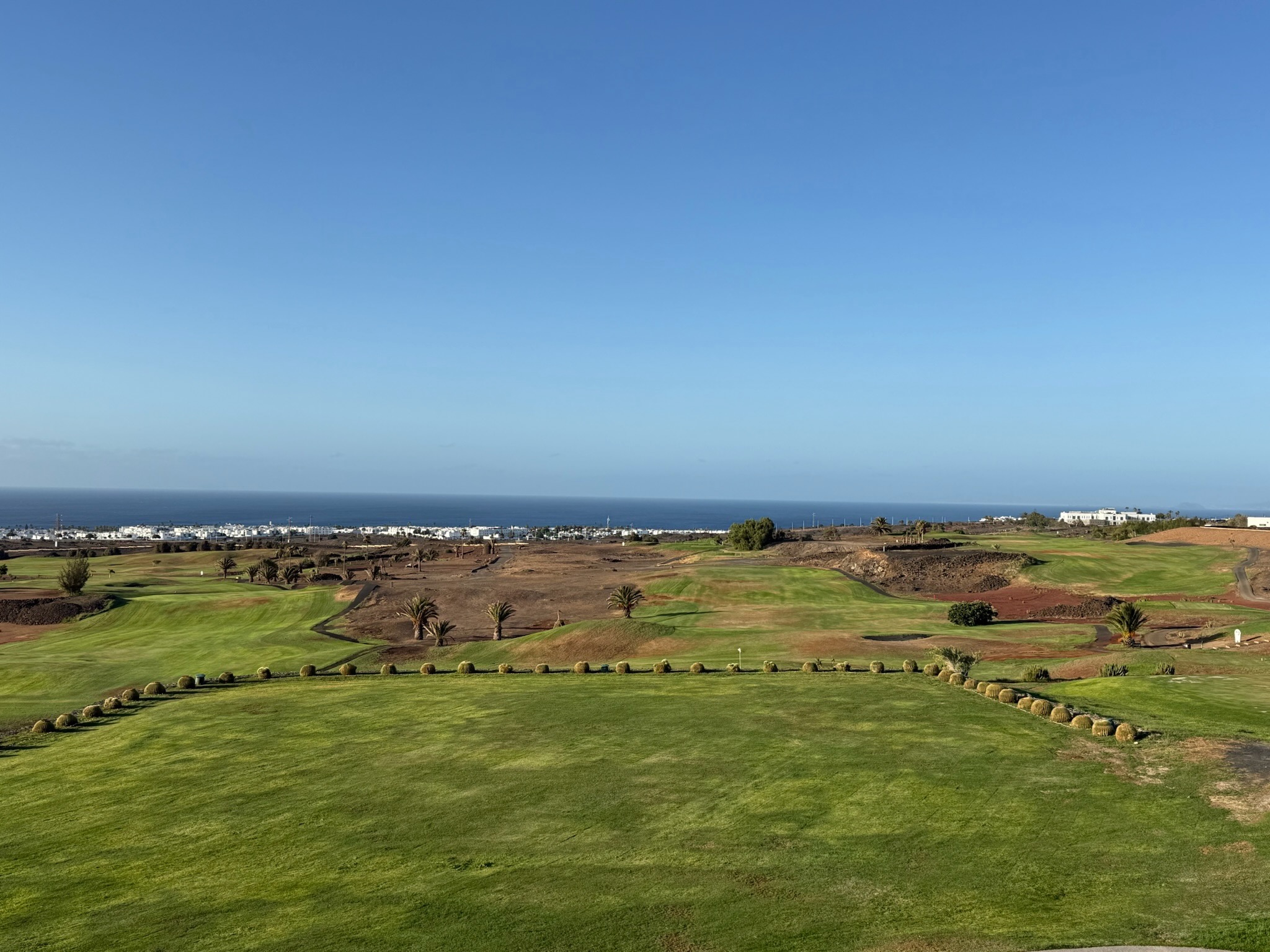 Im Süden der Insel, nur wenige Minuten vom Ferienort Puerto del Carmen entfernt, spielst du auf einem Kurs, der dir mit jedem Schlag ein Panorama schenkt: Der Atlantik glitzert in der Ferne, dunkle Vulkankegel ragen auf – und dazwischen zieht sich ein sattes Grün, das fast surreal wirkt. Dazu mischt sich der Wind, würzig und salzig, in die Morgenluft.