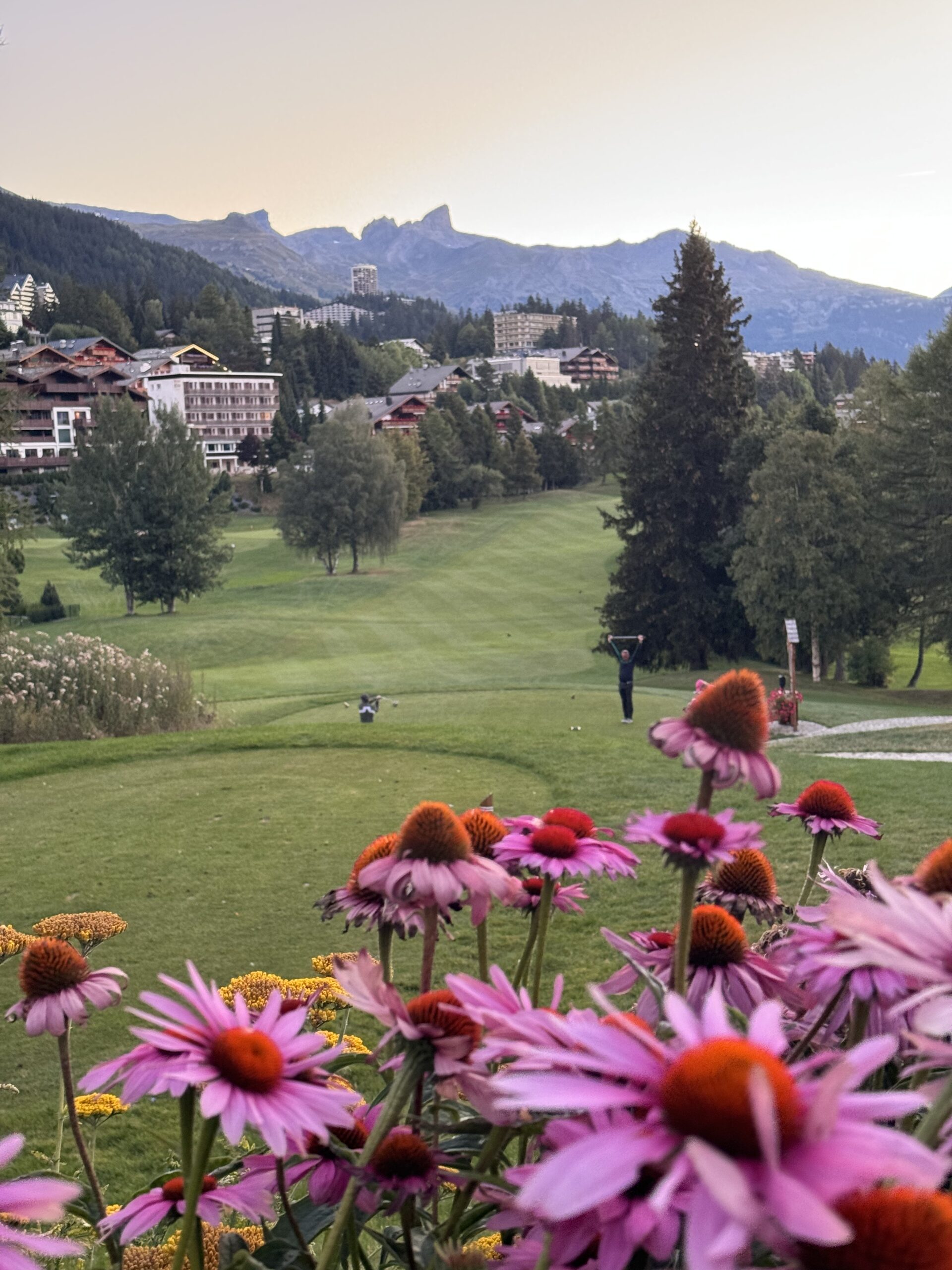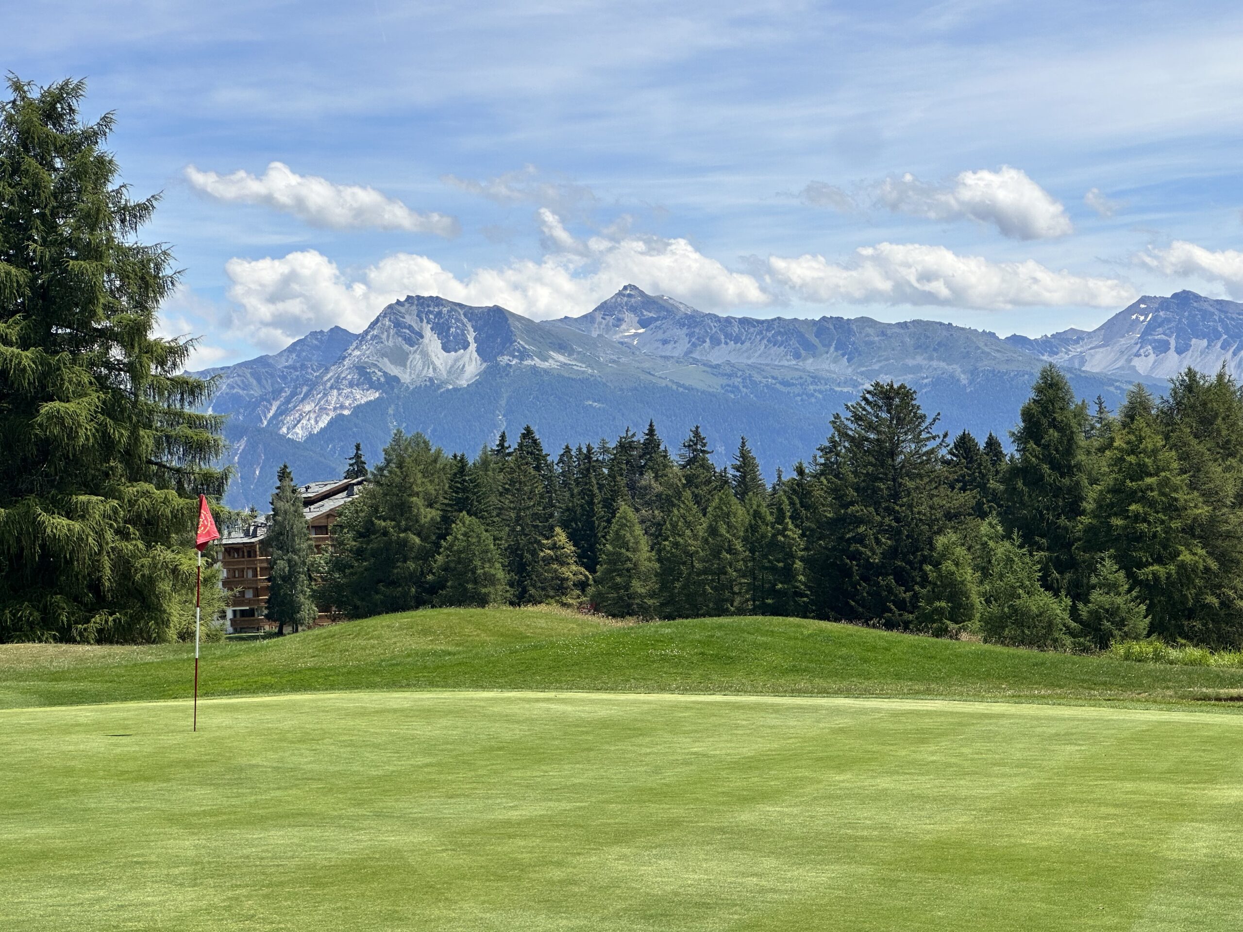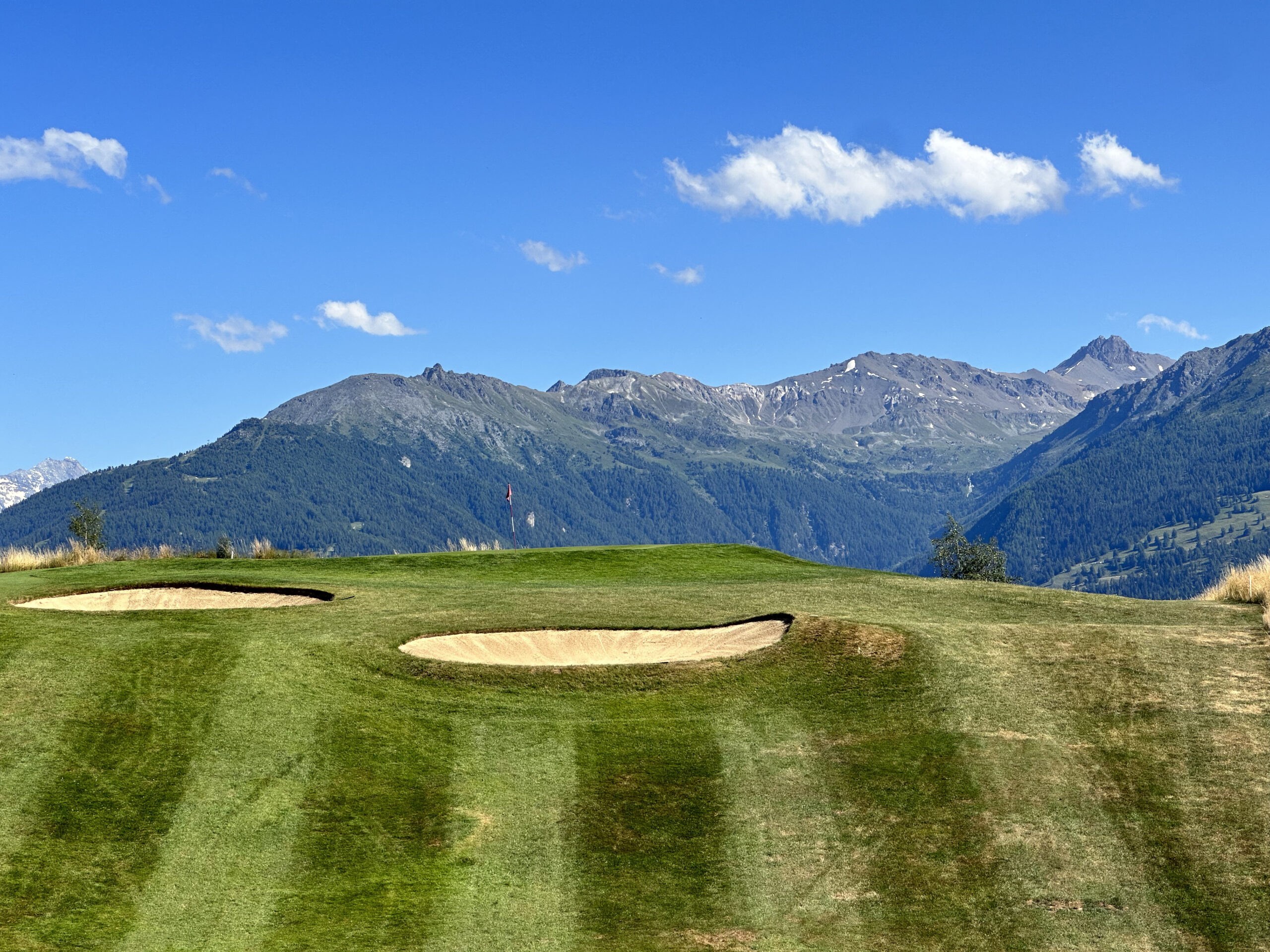 Der Himmel strahlt in einem perfekten Babyblau, und kleine Schäfchenwolken schweben dekorativ über dem saftigen Grün des Fairways. Mit jedem Schlag geniessen wir den unvergleichlichen Ausblick auf die südliche Alpenkette, wo sich Matterhorn und Mont Blanc in der Ferne präsentieren. Die schneebedeckten Gipfel wirken wie das Sahnehäubchen auf dieser Postkartenidylle.