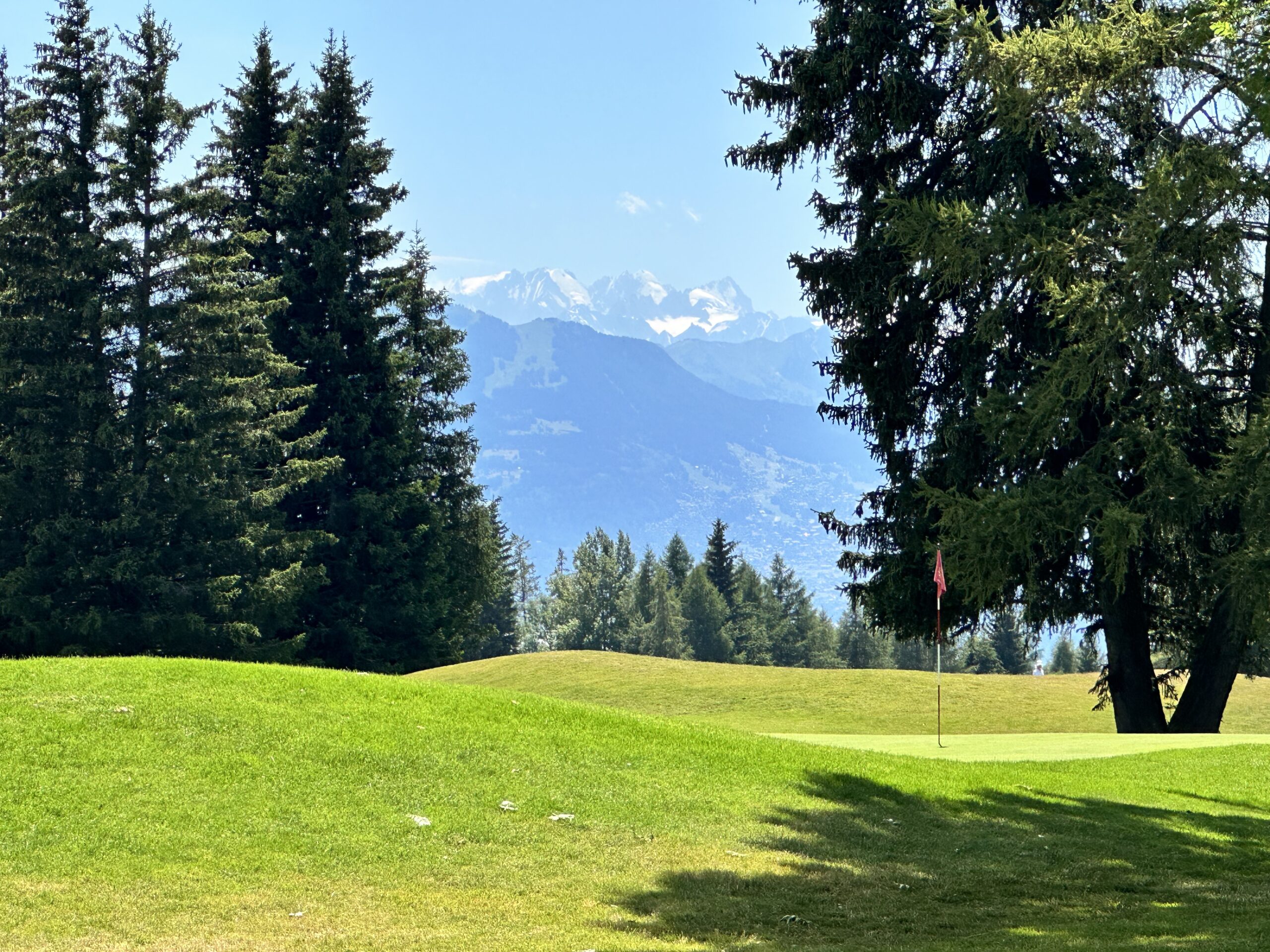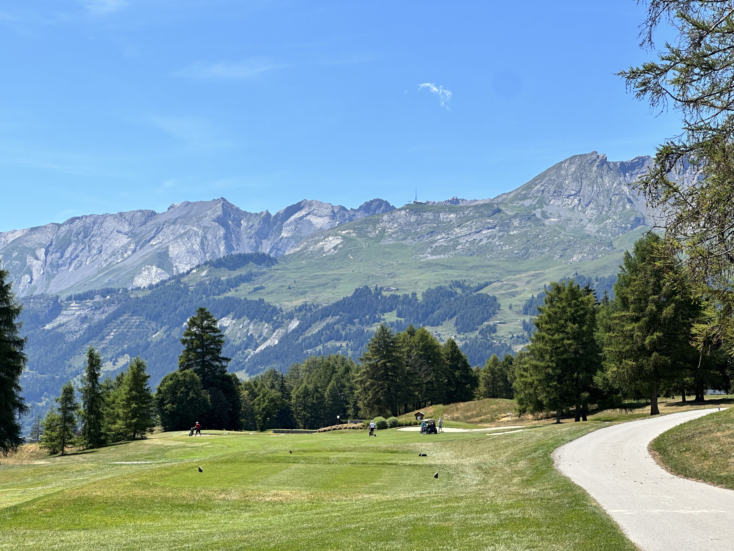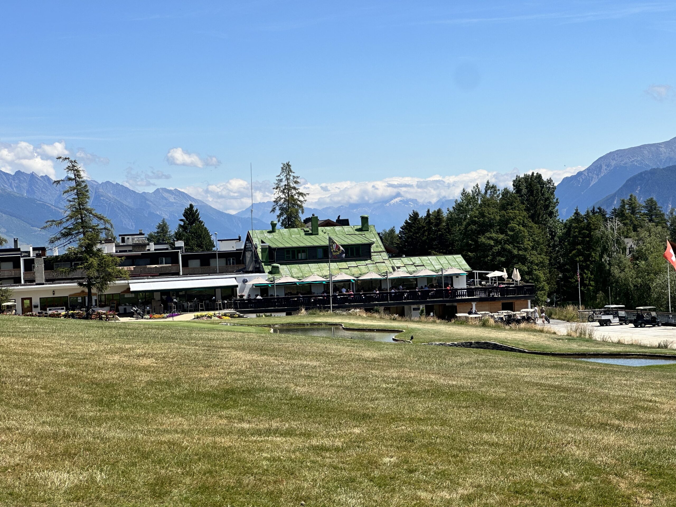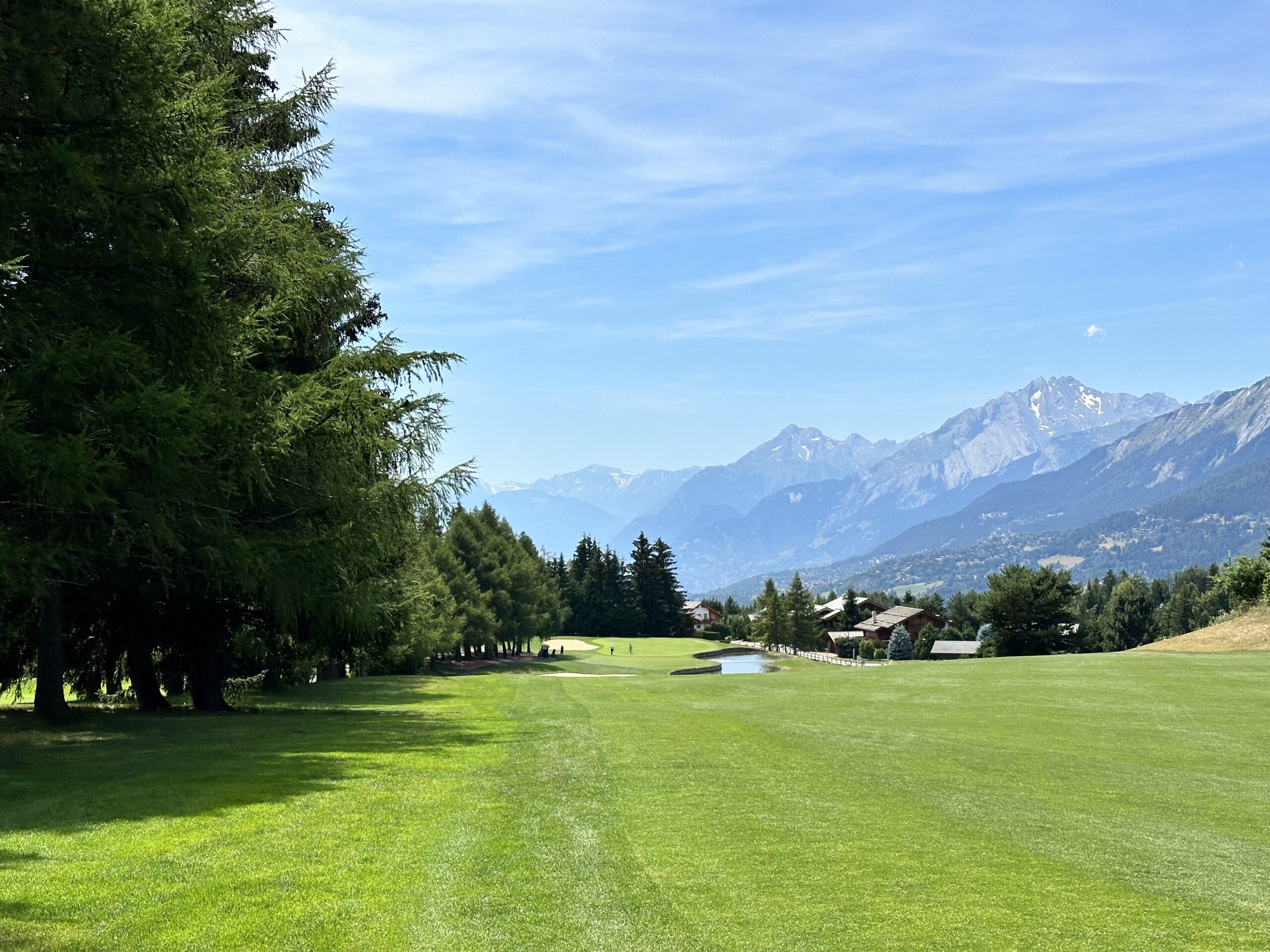 Der Himmel strahlt in einem perfekten Babyblau, und kleine Schäfchenwolken schweben dekorativ über dem saftigen Grün des Fairways. Mit jedem Schlag geniessen wir den unvergleichlichen Ausblick auf die südliche Alpenkette, wo sich Matterhorn und Mont Blanc in der Ferne präsentieren. Die schneebedeckten Gipfel wirken wie das Sahnehäubchen auf dieser Postkartenidylle.