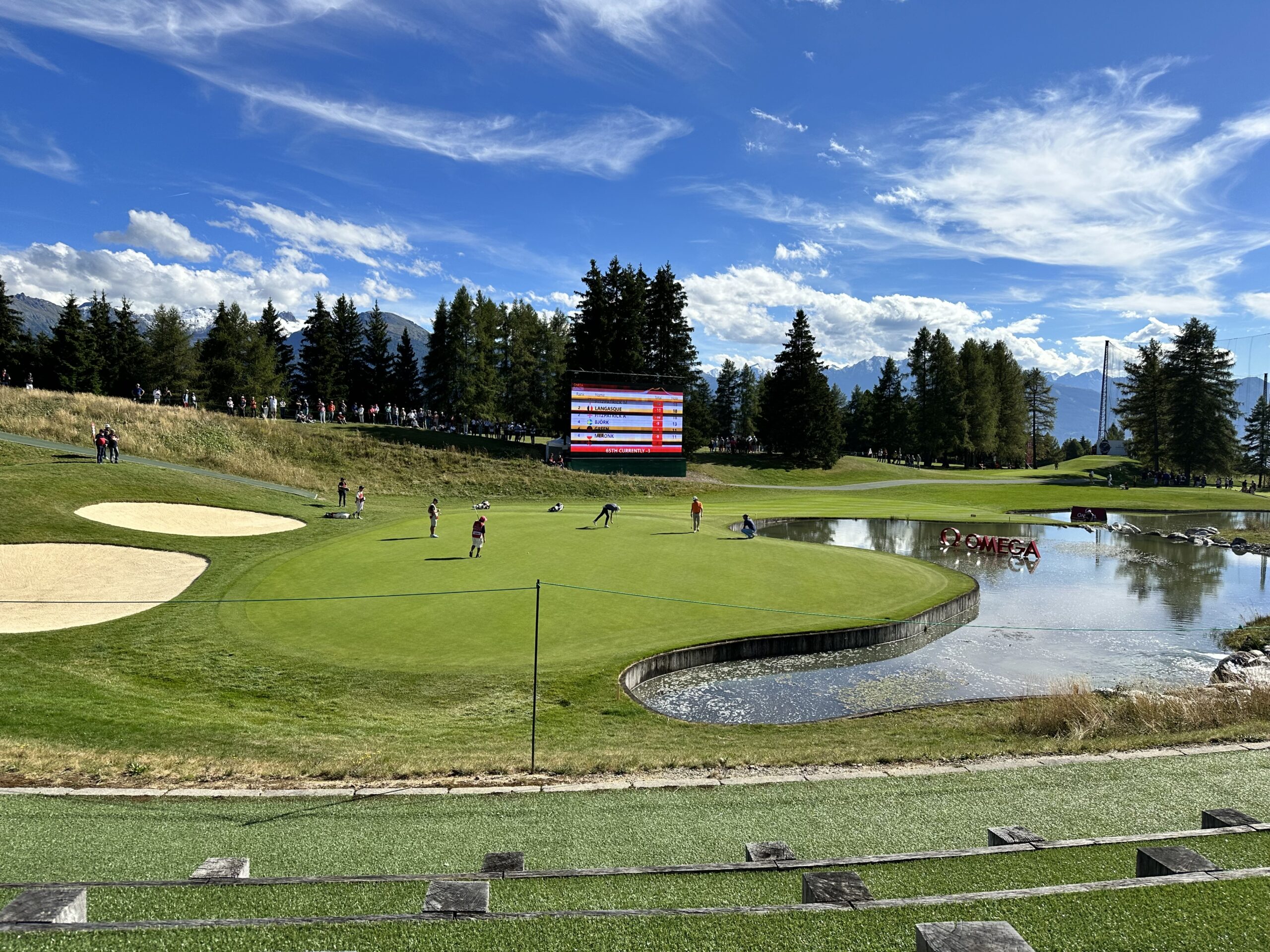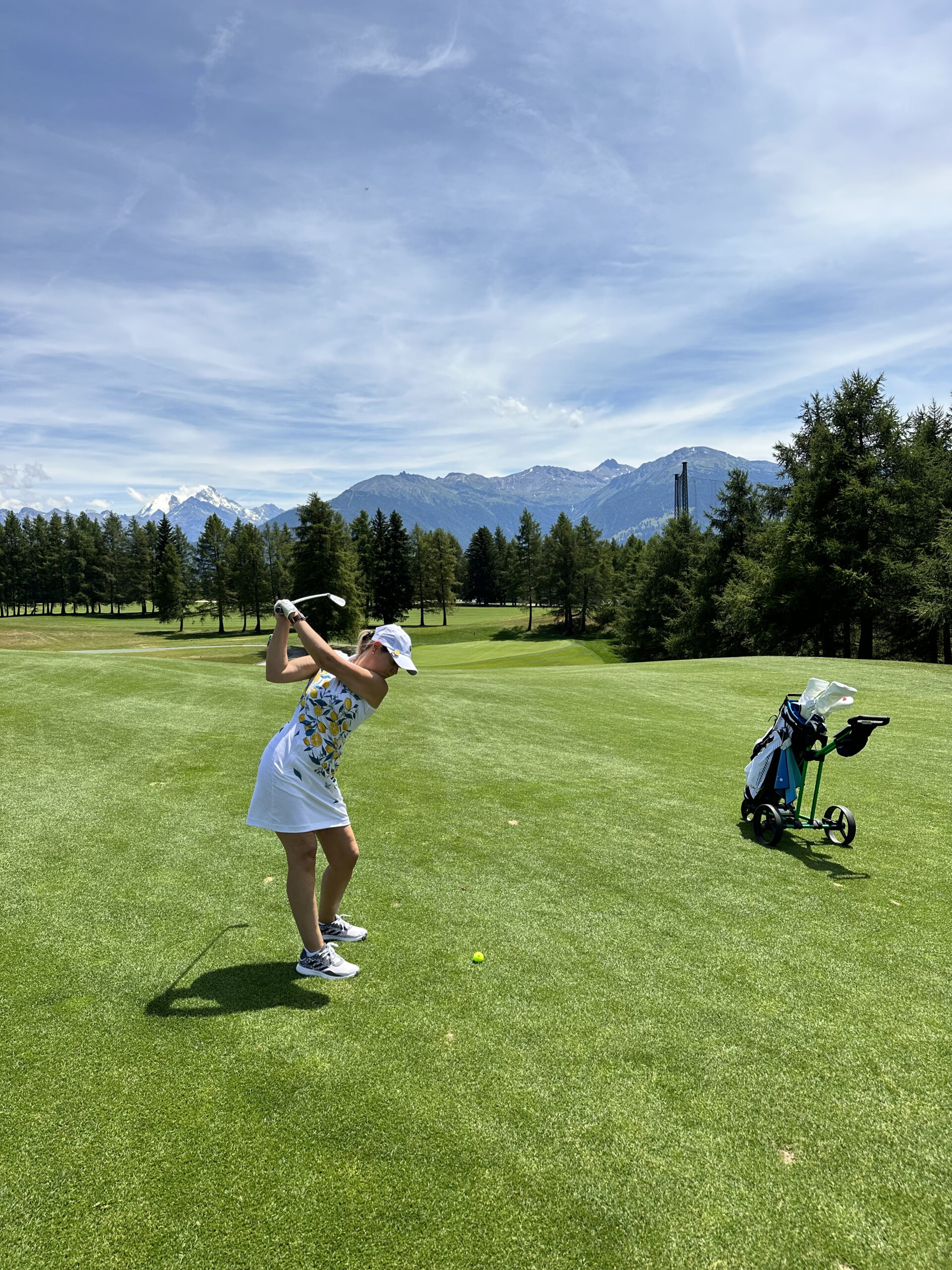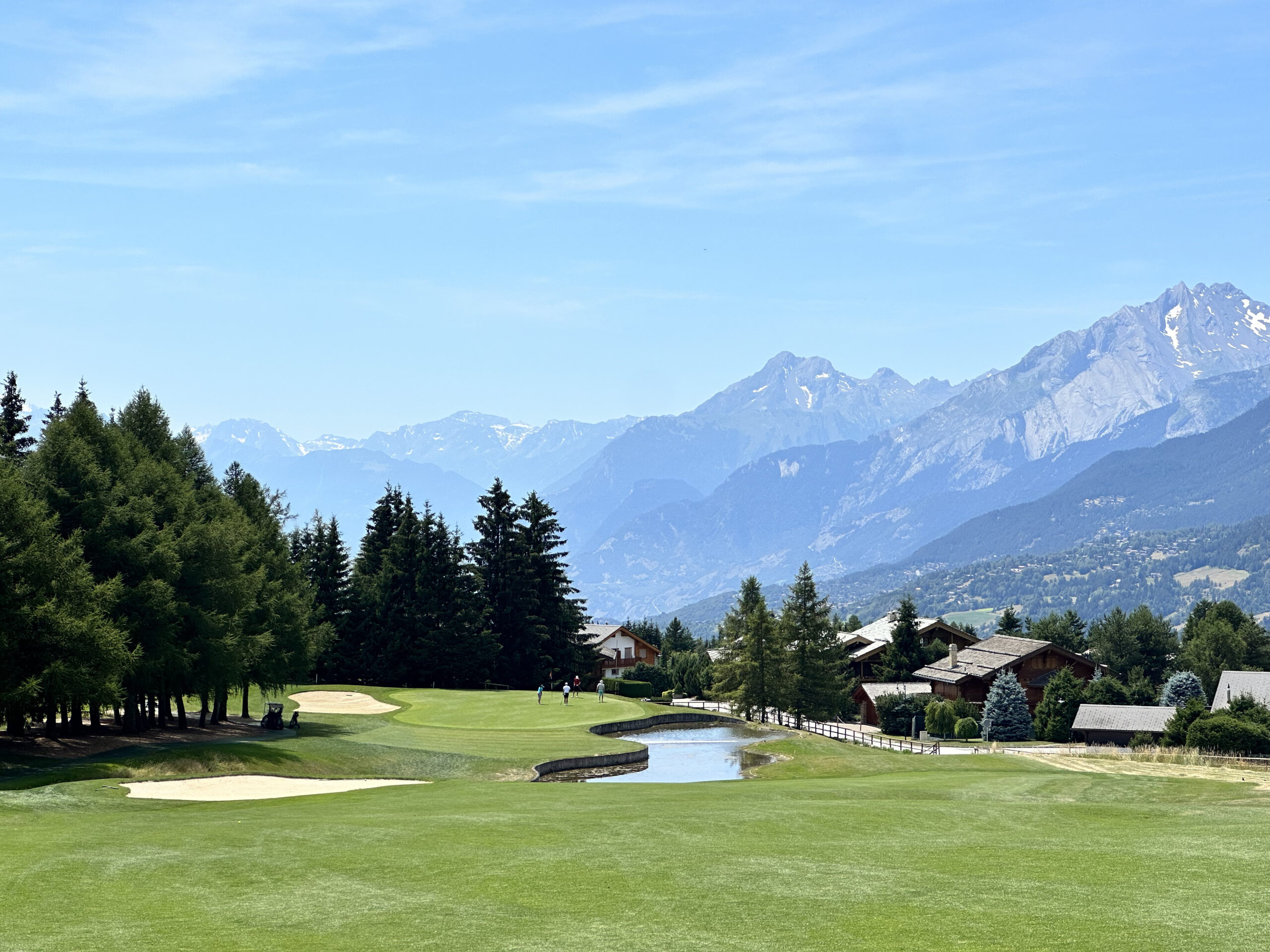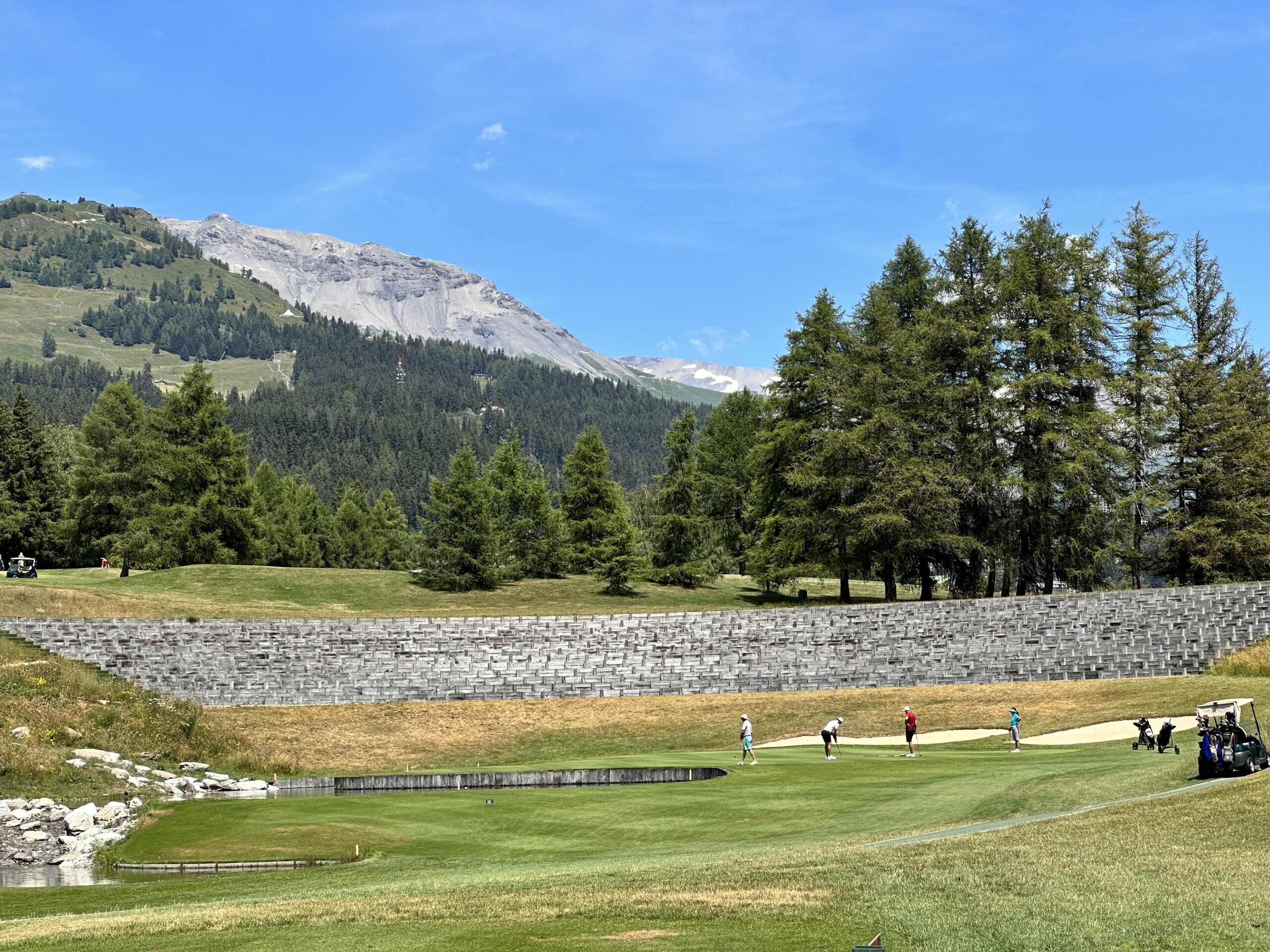 Der Himmel strahlt in einem perfekten Babyblau, und kleine Schäfchenwolken schweben dekorativ über dem saftigen Grün des Fairways. Mit jedem Schlag geniessen wir den unvergleichlichen Ausblick auf die südliche Alpenkette, wo sich Matterhorn und Mont Blanc in der Ferne präsentieren. Die schneebedeckten Gipfel wirken wie das Sahnehäubchen auf dieser Postkartenidylle.
