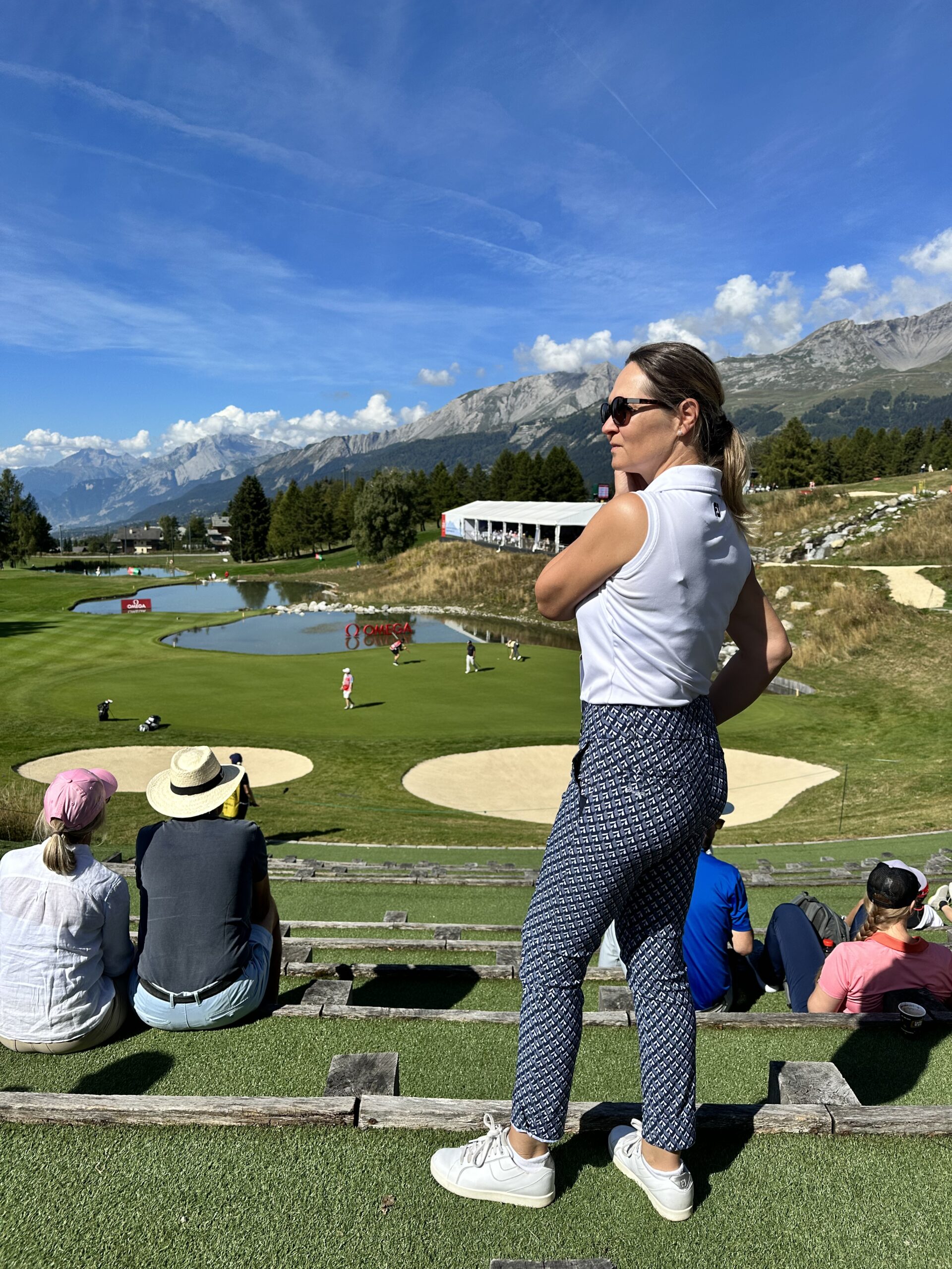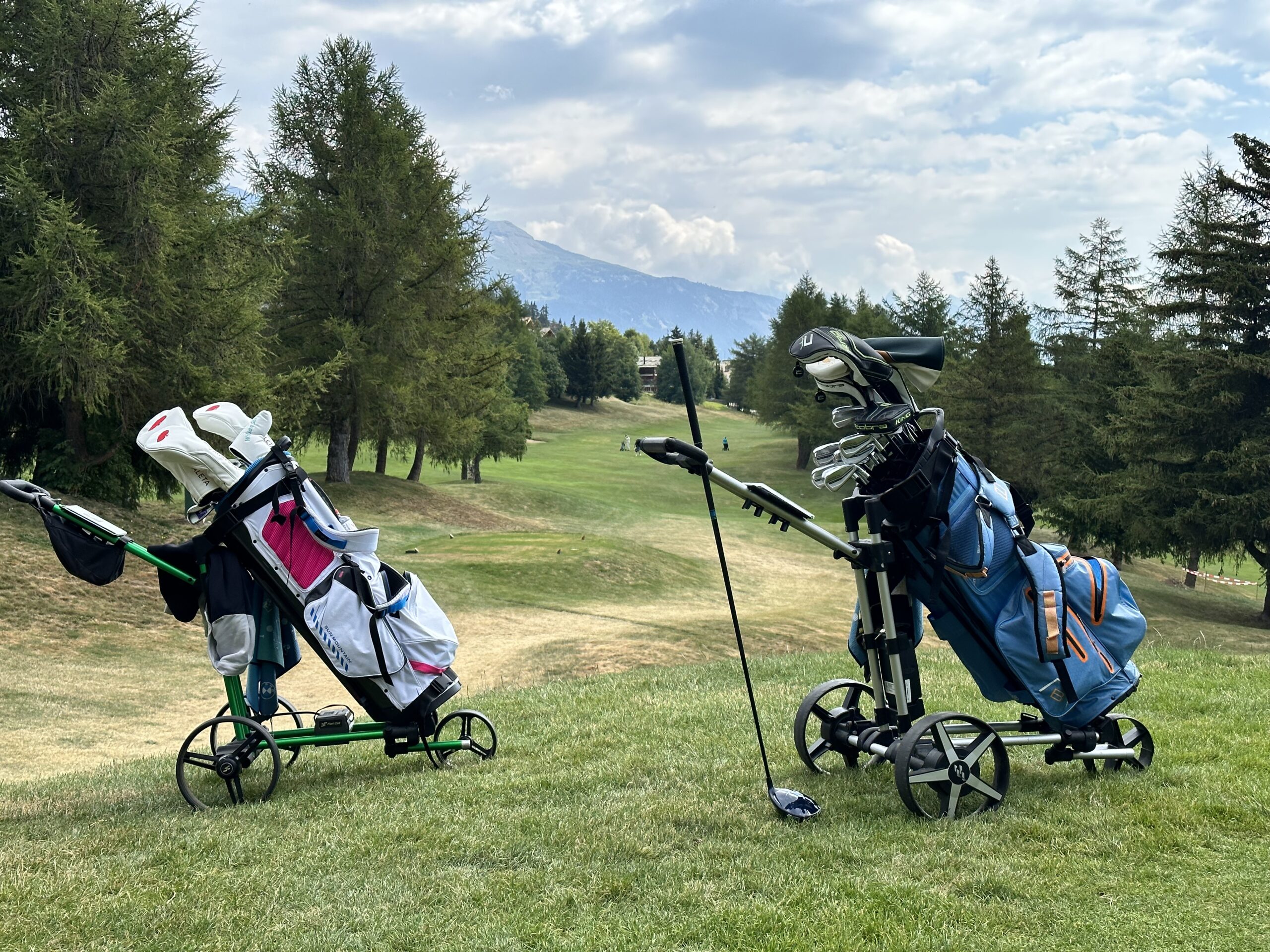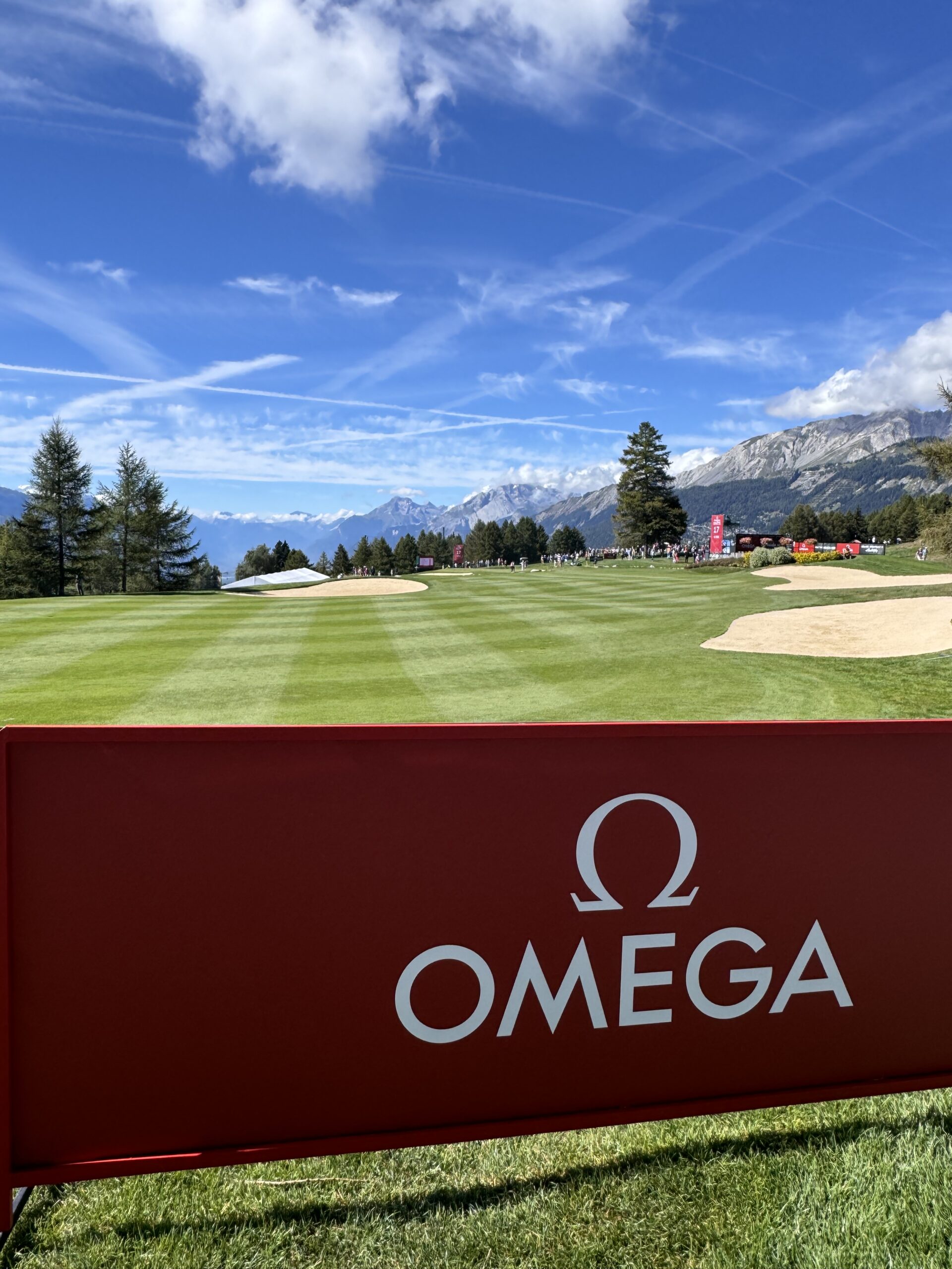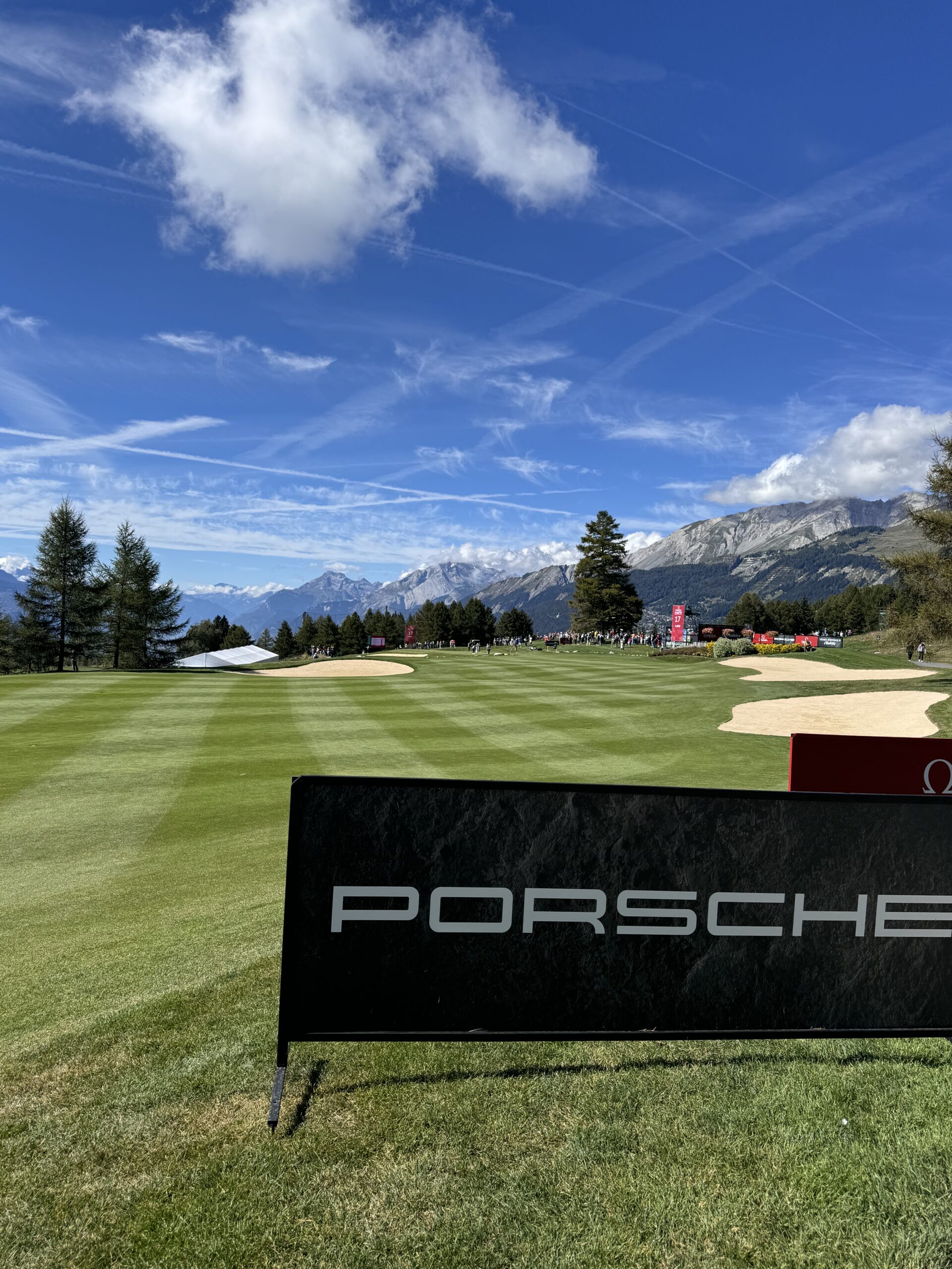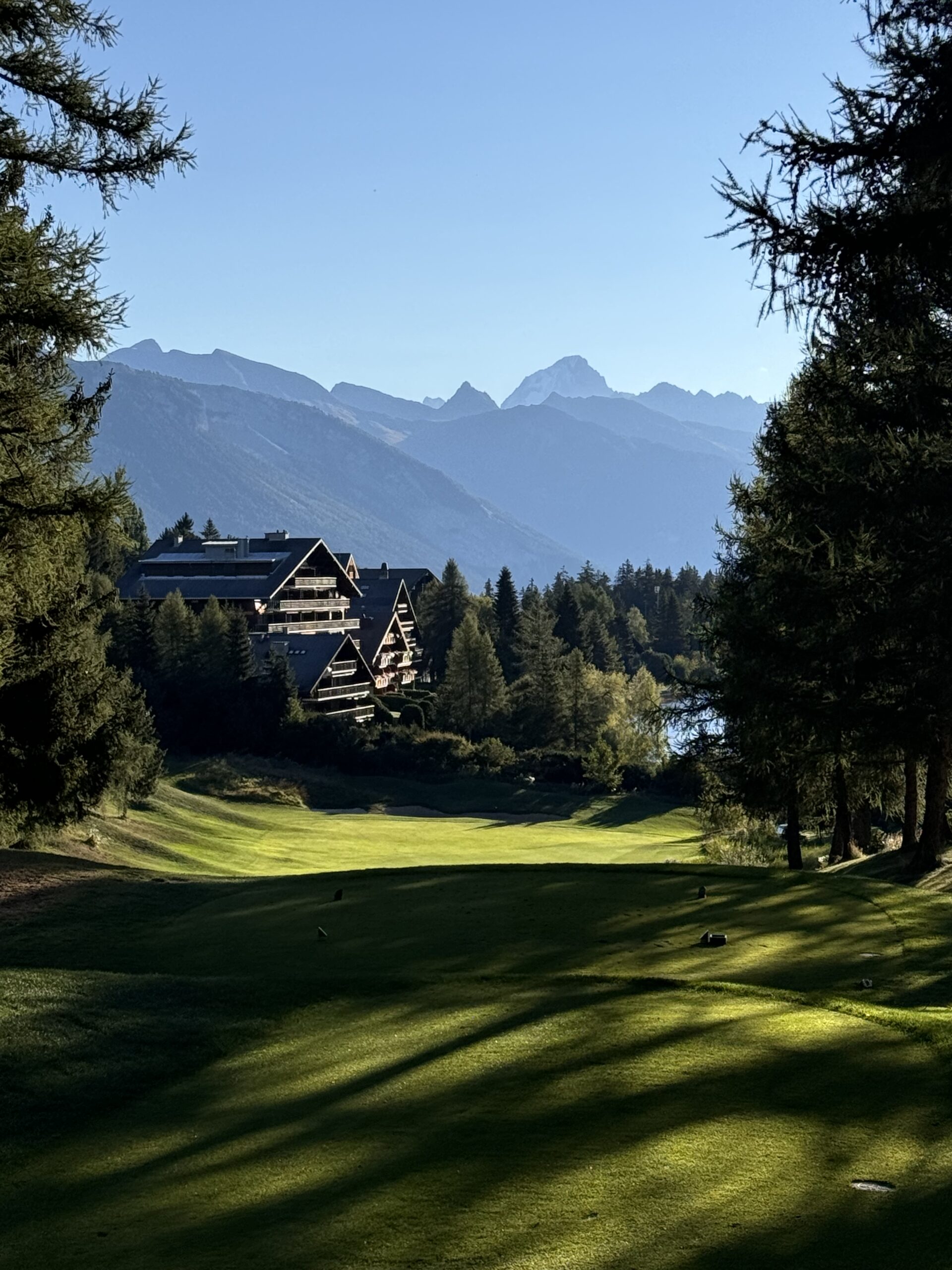 Der Himmel strahlt in einem perfekten Babyblau, und kleine Schäfchenwolken schweben dekorativ über dem saftigen Grün des Fairways. Mit jedem Schlag geniessen wir den unvergleichlichen Ausblick auf die südliche Alpenkette, wo sich Matterhorn und Mont Blanc in der Ferne präsentieren. Die schneebedeckten Gipfel wirken wie das Sahnehäubchen auf dieser Postkartenidylle.