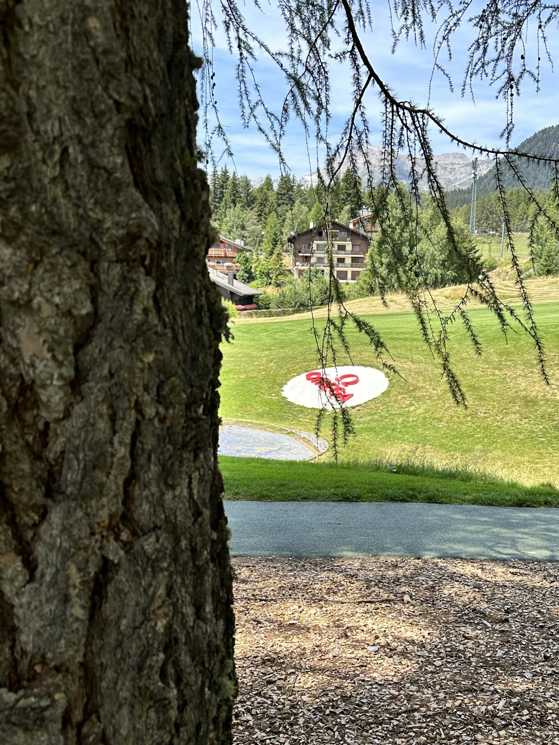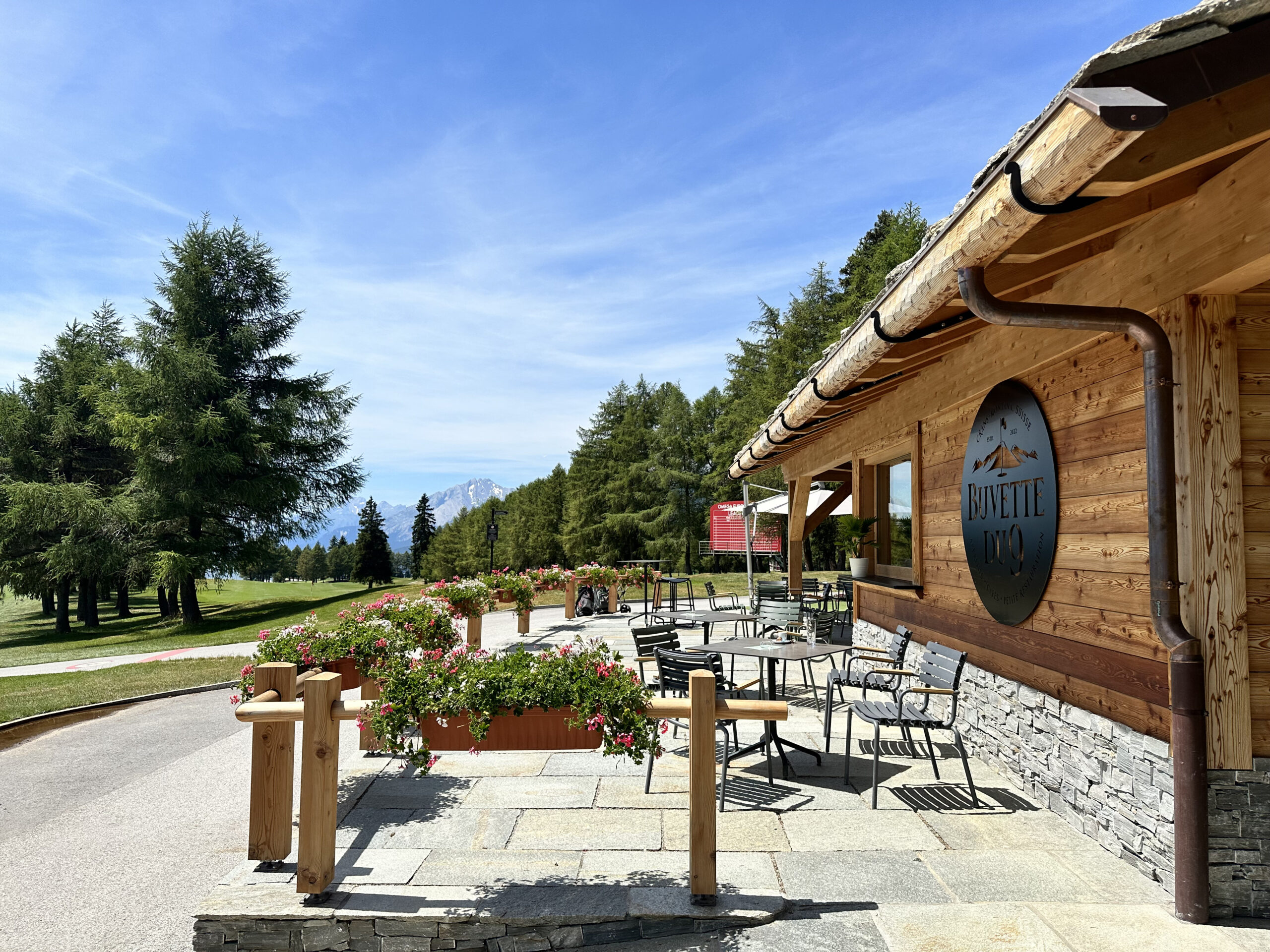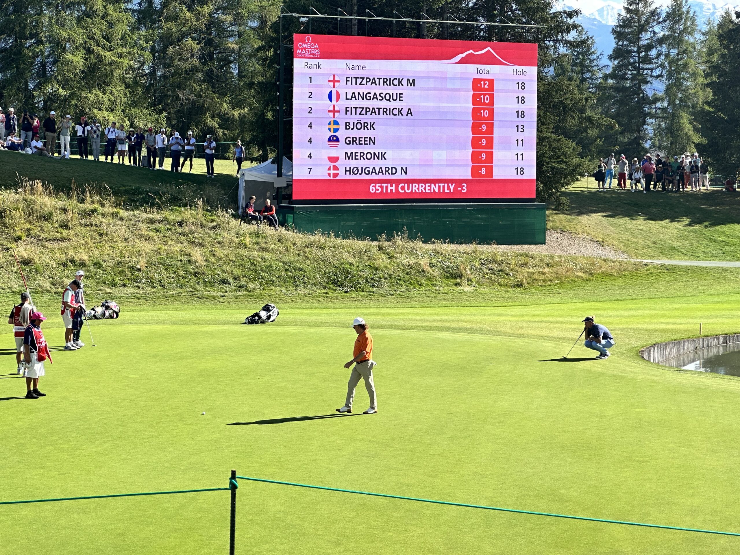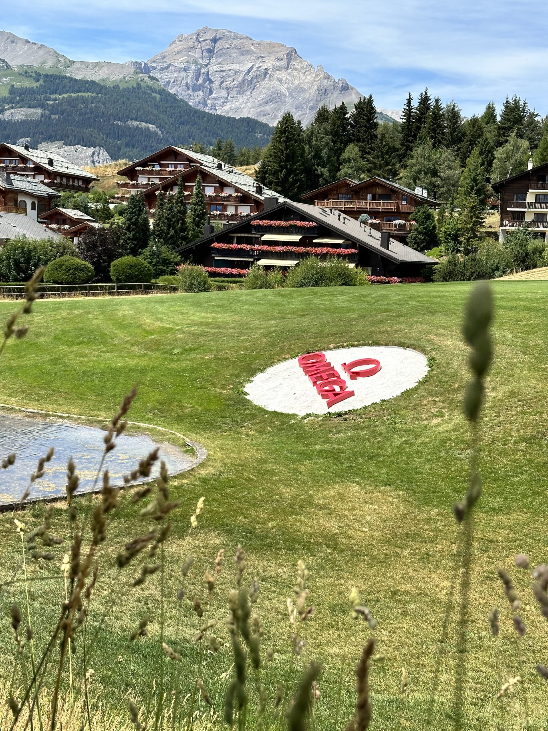 Der Himmel strahlt in einem perfekten Babyblau, und kleine Schäfchenwolken schweben dekorativ über dem saftigen Grün des Fairways. Mit jedem Schlag geniessen wir den unvergleichlichen Ausblick auf die südliche Alpenkette, wo sich Matterhorn und Mont Blanc in der Ferne präsentieren. Die schneebedeckten Gipfel wirken wie das Sahnehäubchen auf dieser Postkartenidylle.