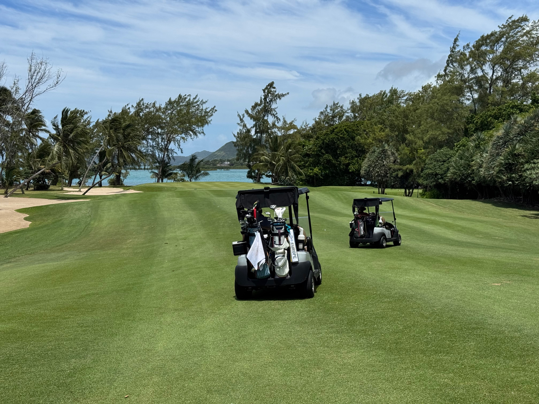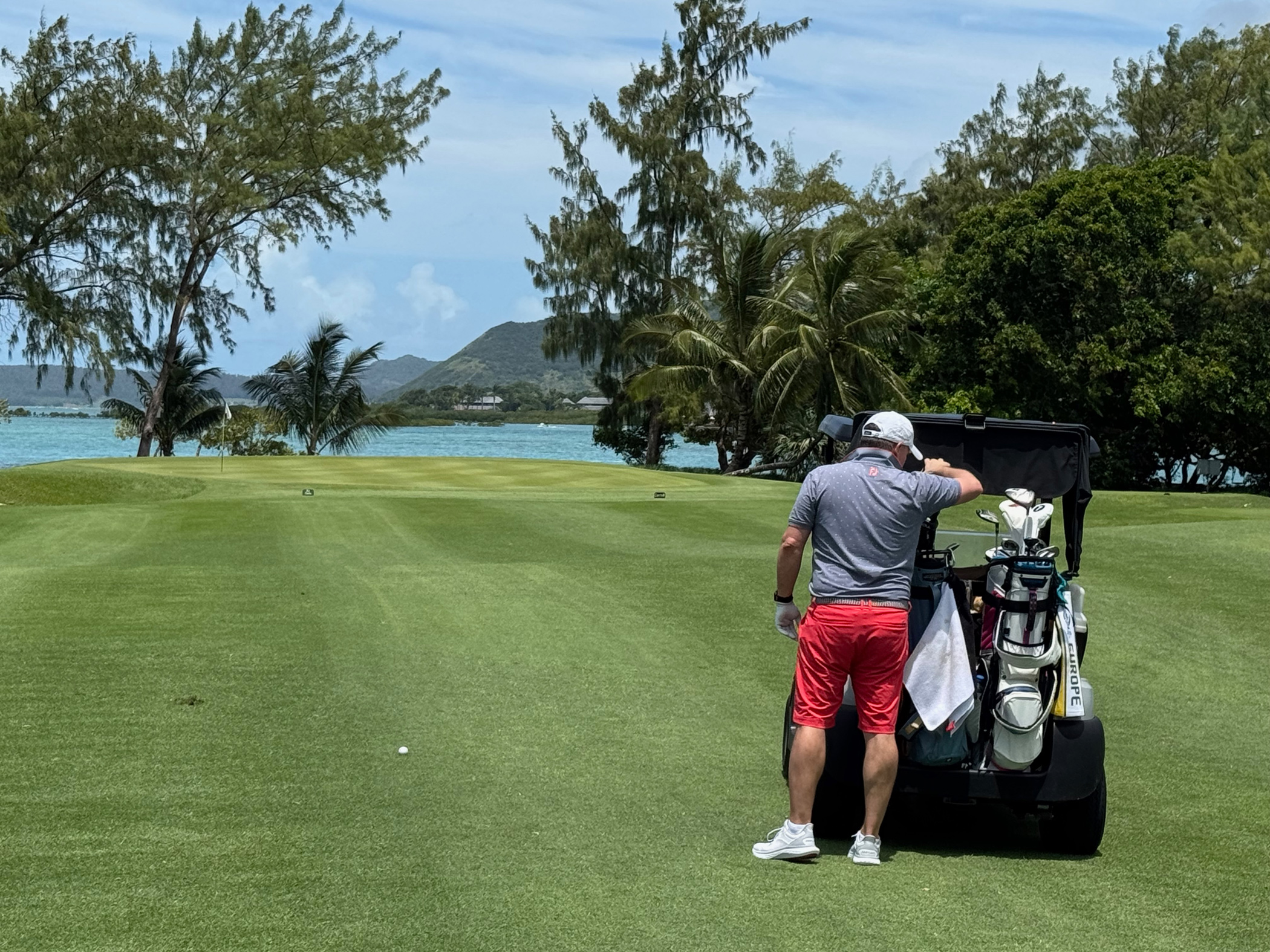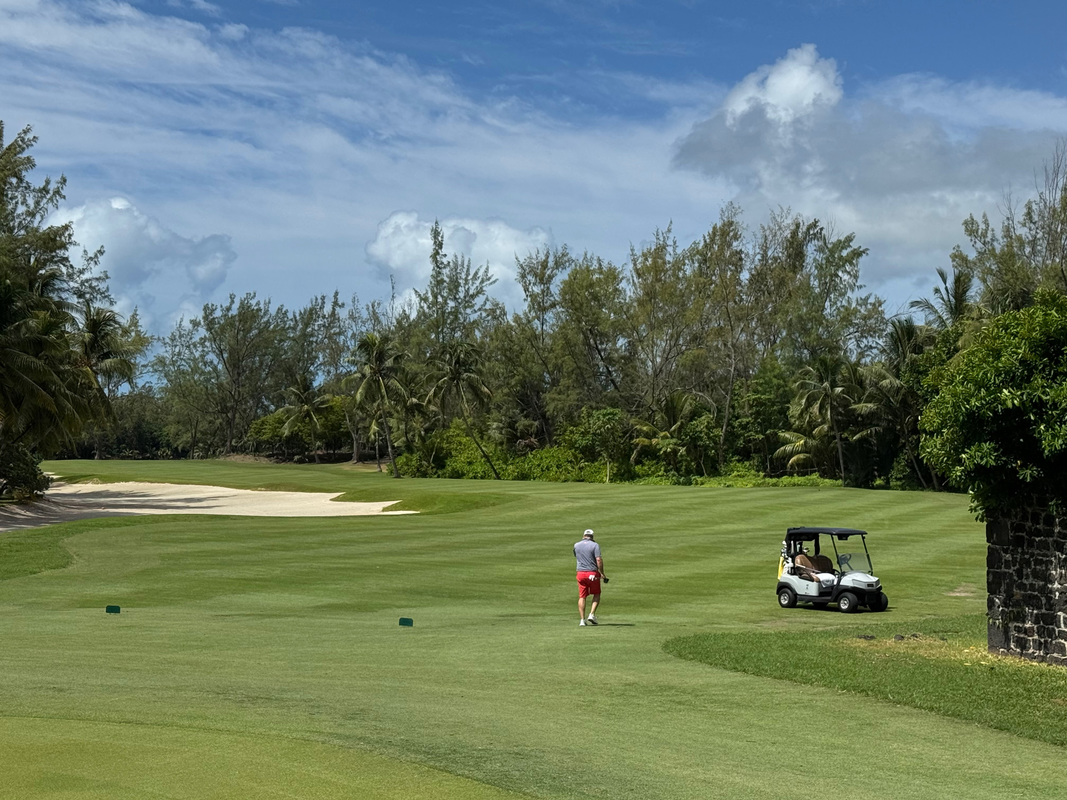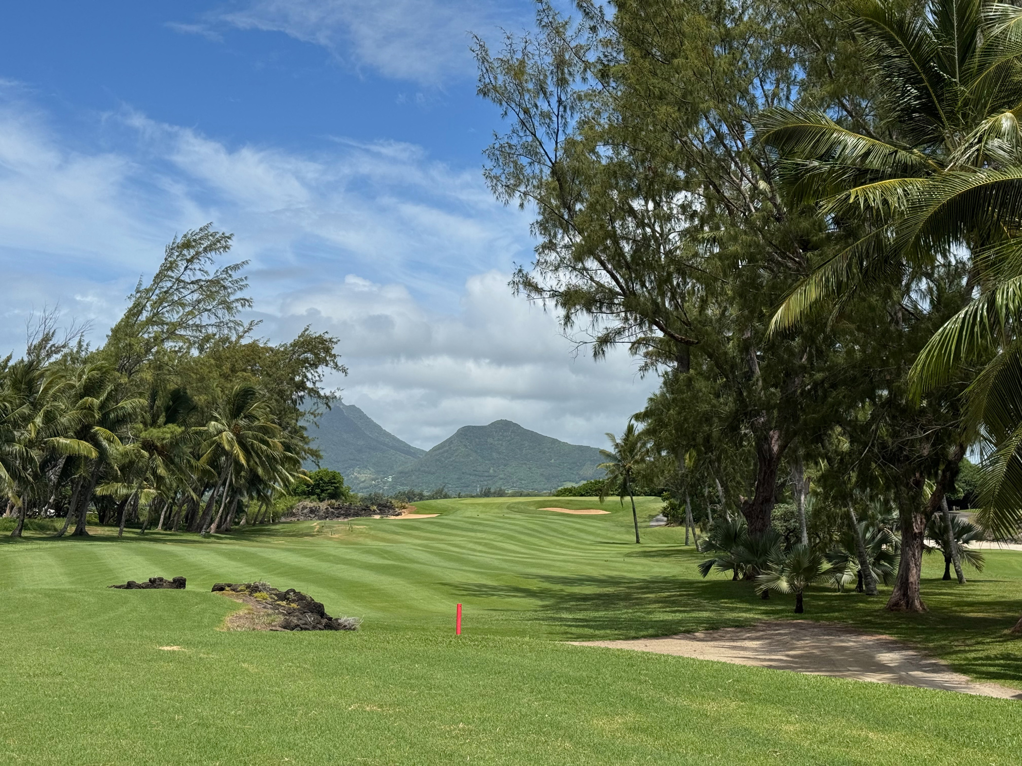 Die Fairways sind schmal, die Löcher oft blind, und das Gelände geht mal rauf, mal runter — du weisst nie wirklich, was dich als Nächstes erwartet. Dazu kommt der Wind, und der ist auf einer Insel mitten im Indischen Ozean keine Ausnahme, sondern die Regel.