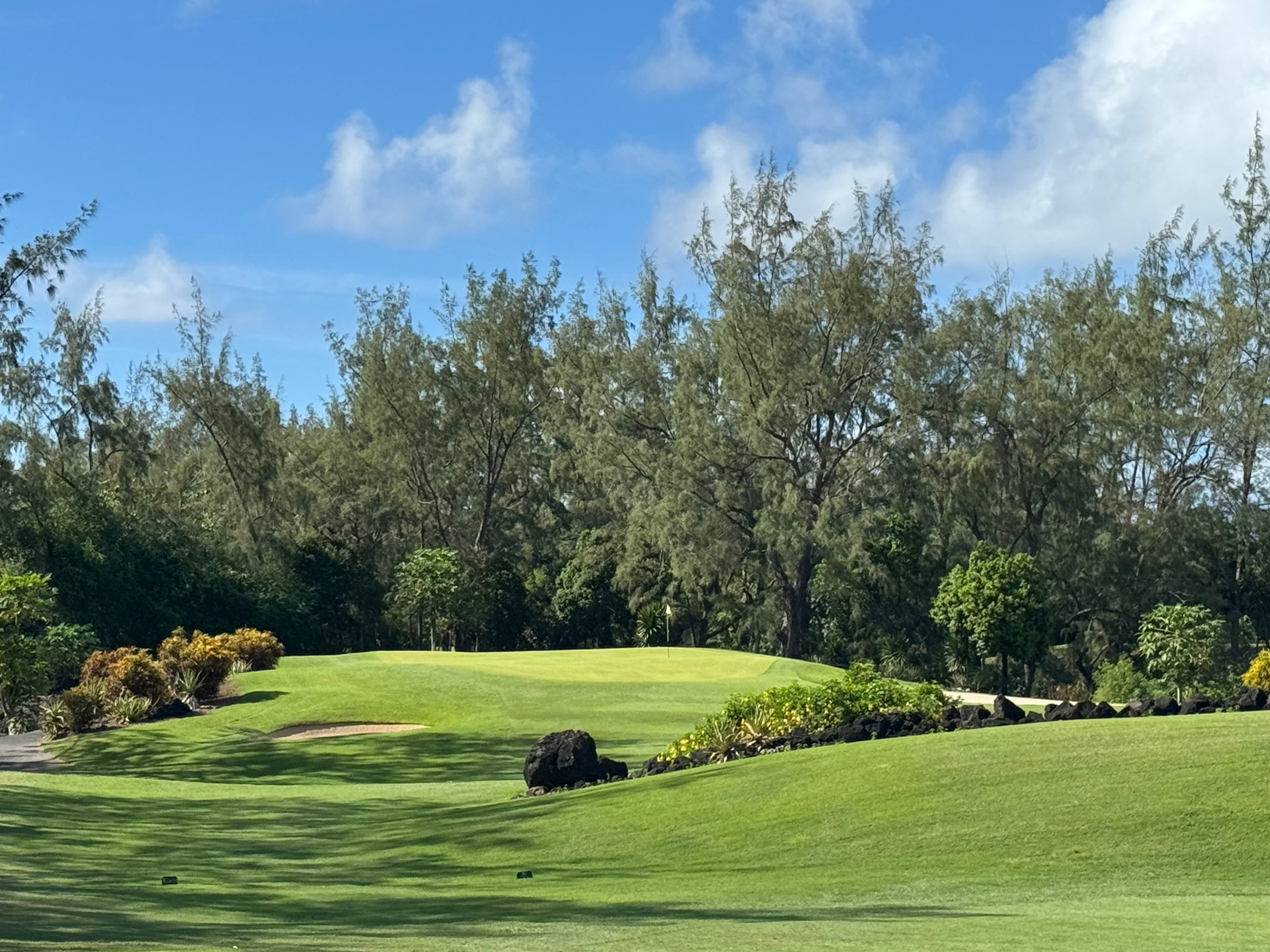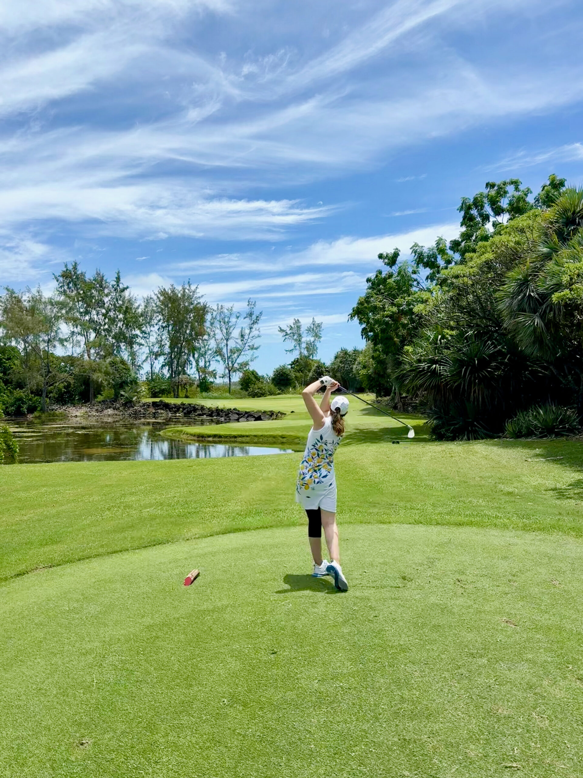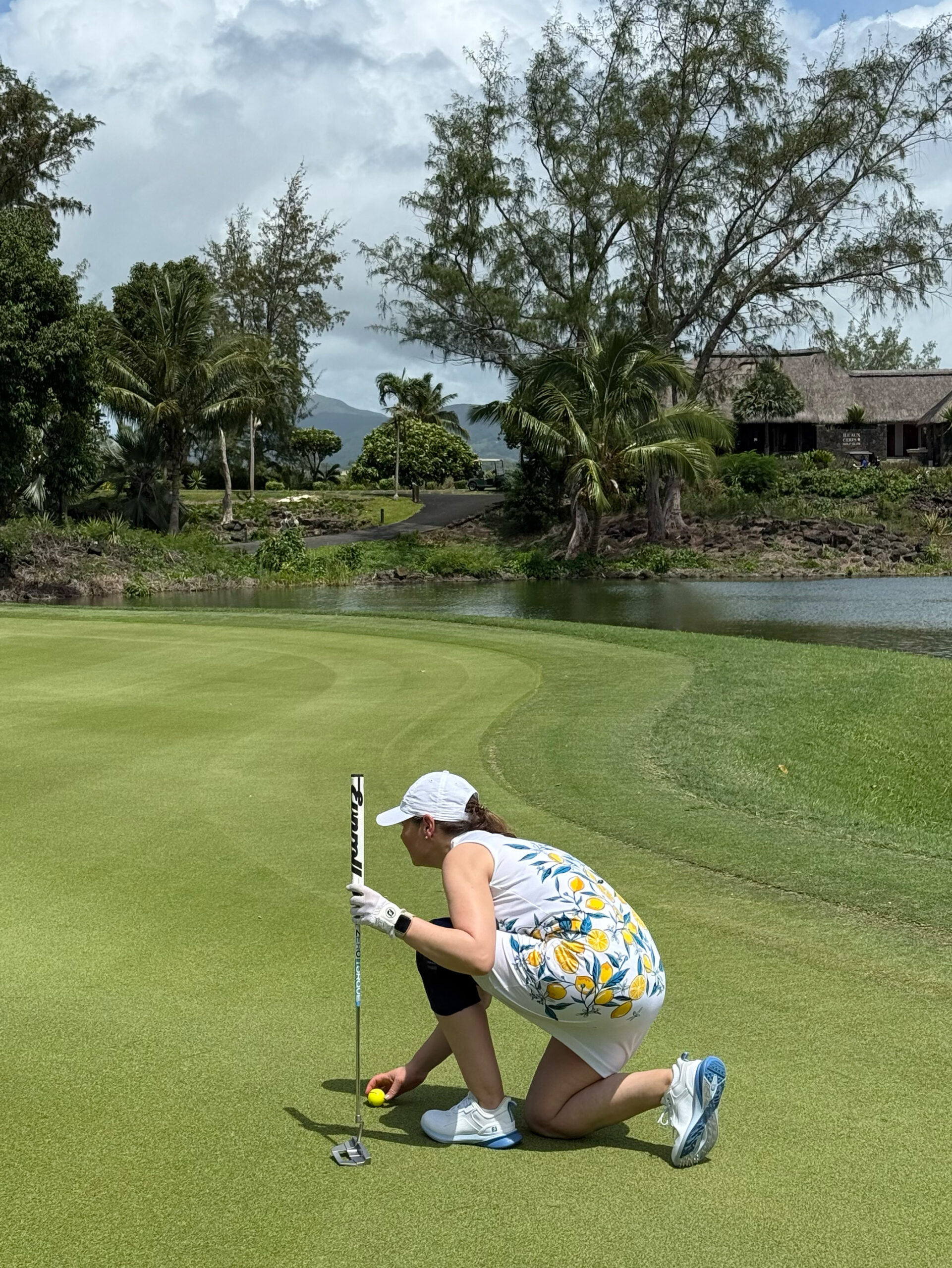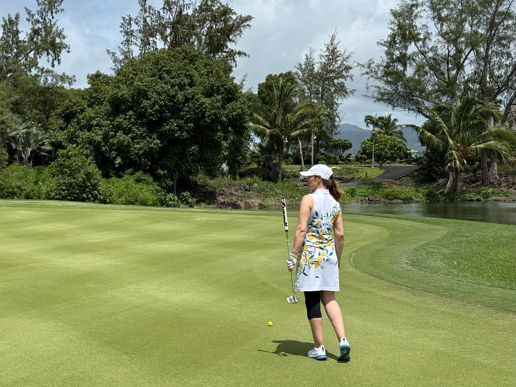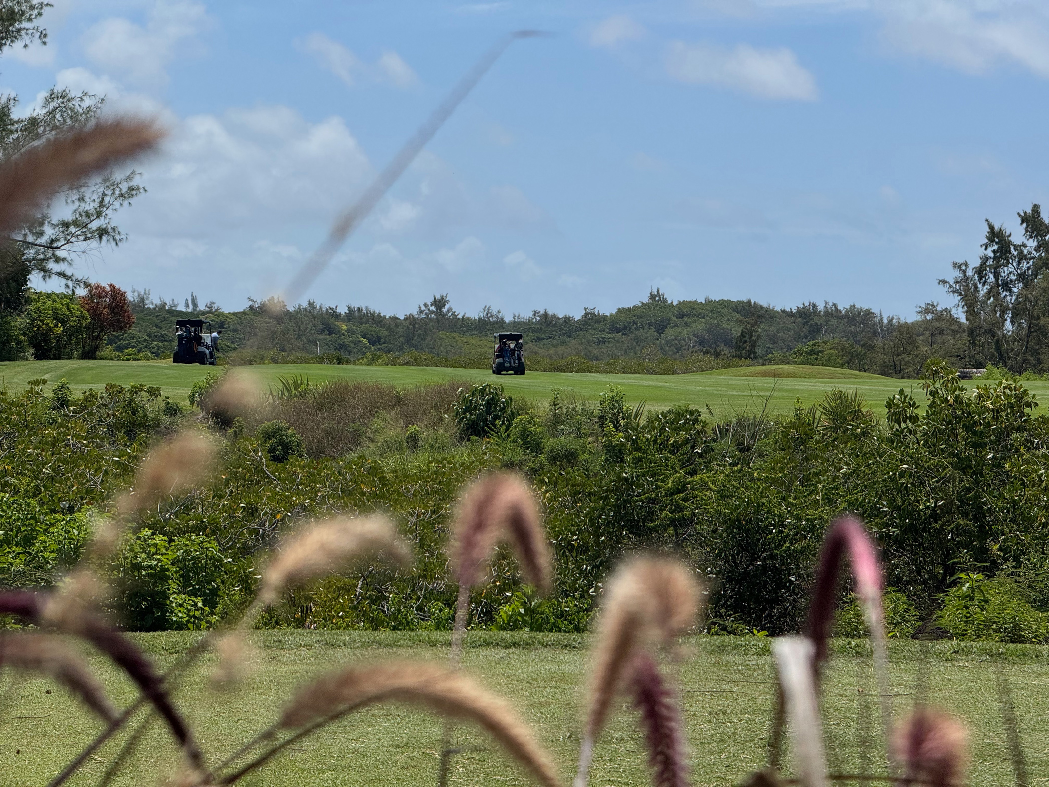 Die Fairways sind schmal, die Löcher oft blind, und das Gelände geht mal rauf, mal runter — du weisst nie wirklich, was dich als Nächstes erwartet. Dazu kommt der Wind, und der ist auf einer Insel mitten im Indischen Ozean keine Ausnahme, sondern die Regel.