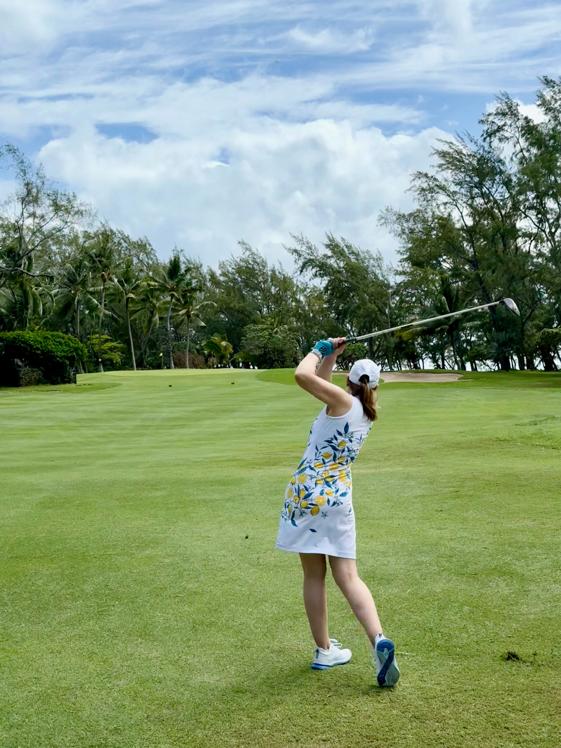 Und ja, man fällt erst einmal auf. Die anderen in Bikini und Badeshorts, wir noch im Golfer-Outfit. Umso schöner ist der Moment, wenn die Golfschuhe endlich aus sind und du die Zehen in den weichen, sonnenerwärmten Sand streckst. Auch das bekommt man nach einer Runde Golf nicht überall.