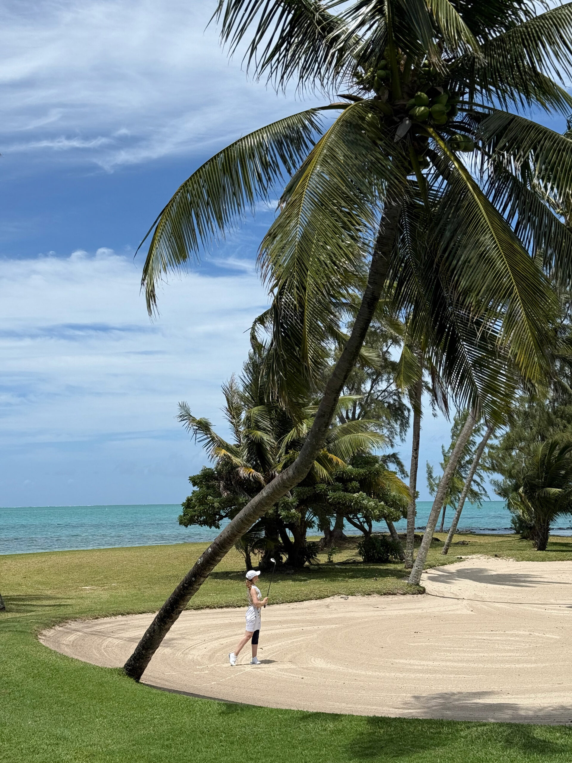 An Loch 7 wird selbst der Bunker plötzlich zur Begegnungszone. Denn was hier auf den ersten Blick wie eine gewöhnliche Waste Area aussieht, ist gleichzeitig Lebensraum für Einsiedlerkrebse, die sich in kleinen Löchern im Sand eingerichtet haben. Beim Schlag sorgte ich mich kurz, ob ich in fremde Immobilienverhältnisse eingreife.