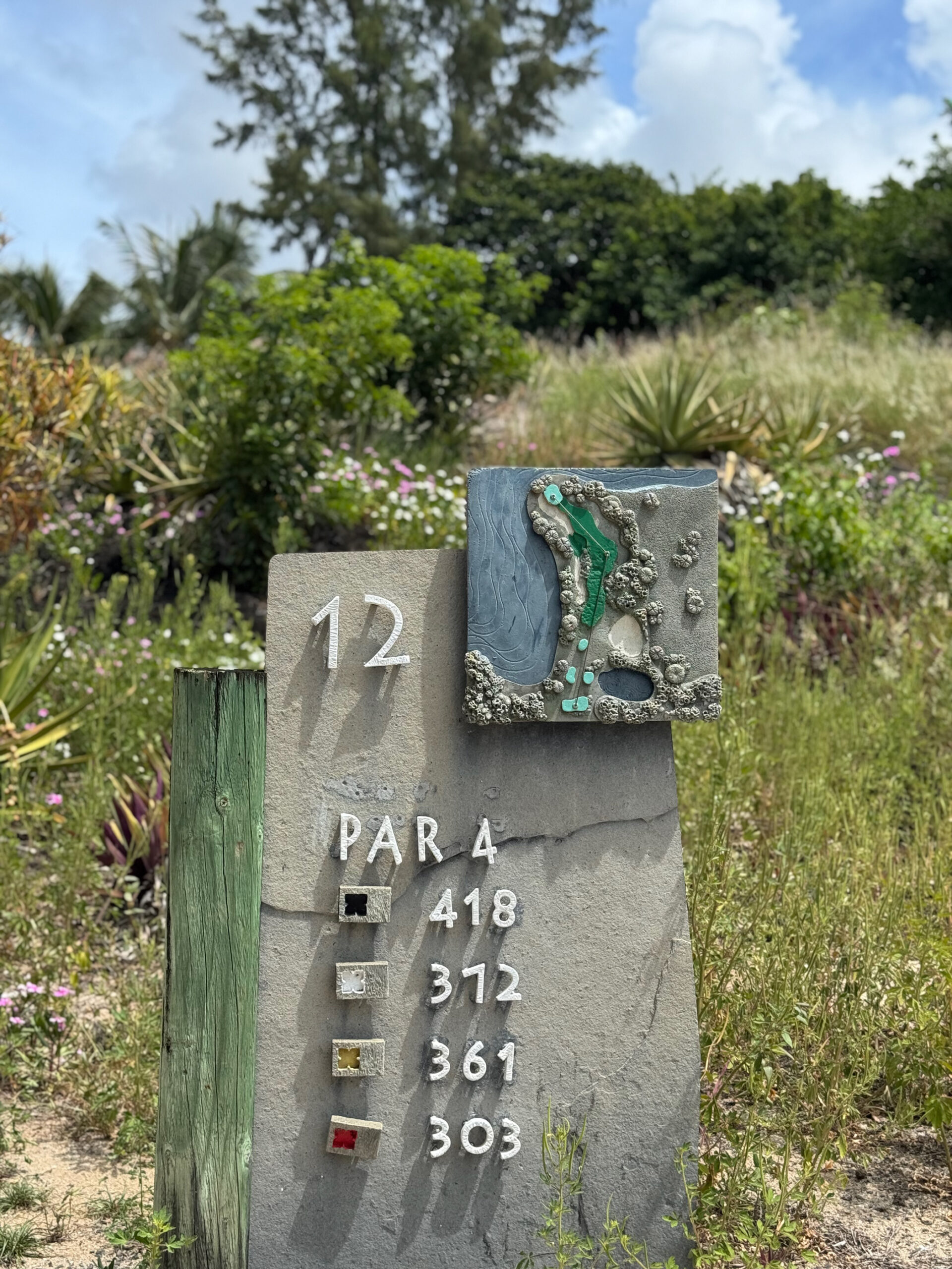 Die Lochtafeln am Île aux Cerfs sind aus Beton gegossen, mit feiner Reliefarbeit ich vermute aus Muscheln — winzige Bäume, Bunker, Schluchten. Und mittendrin sitzt türkisfarbenes Glas, das die Wasserflächen des jeweiligen Lochs zeigt.