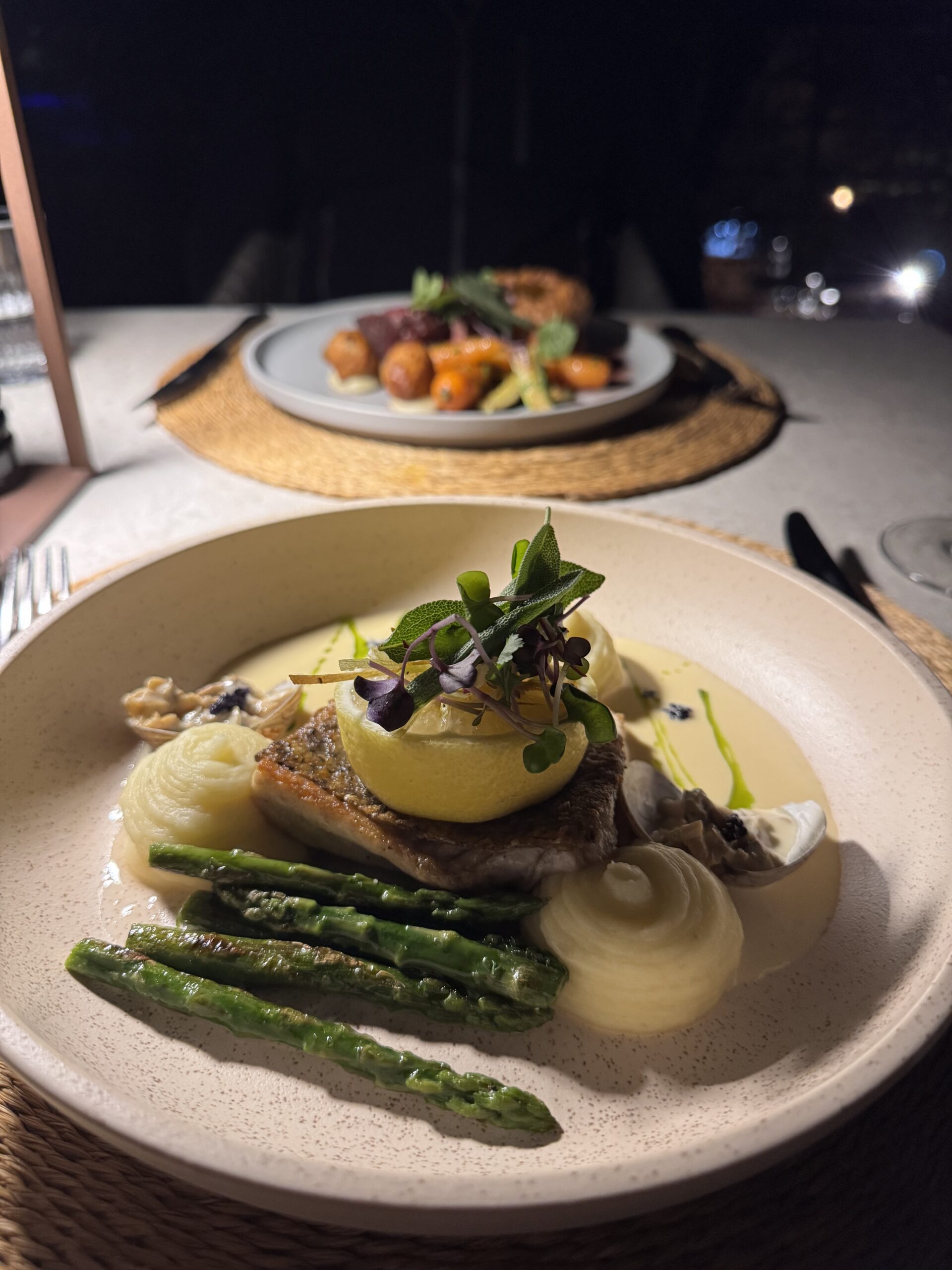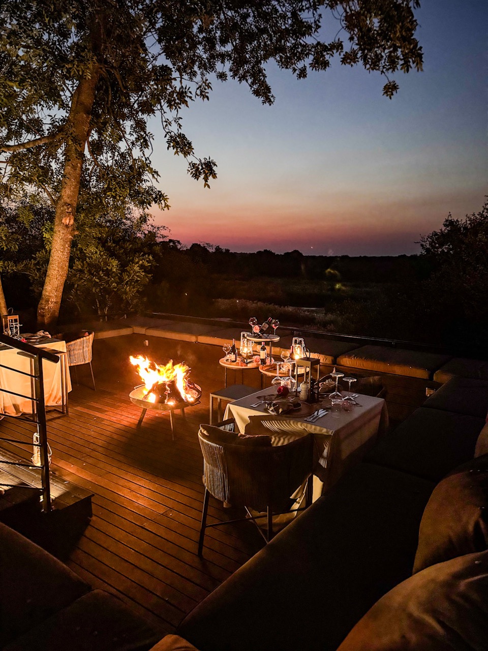 Das Dinner – draussen unter dem südafrikanischen Sternenhimmel, das Feuer knistert, ein Glas südafrikanischer Wein in der Hand und Gerichte auf dem Teller, die genauso gut in Kapstadt oder London serviert werden könnten. Mindestens drei Hauptgänge zur Auswahl, dazu raffinierte Vorspeisen, ein Dessert, das dich lächeln lässt – und für alle, die kein Fleisch mögen, gibt’s natürlich köstliche vegetarische Alternativen.