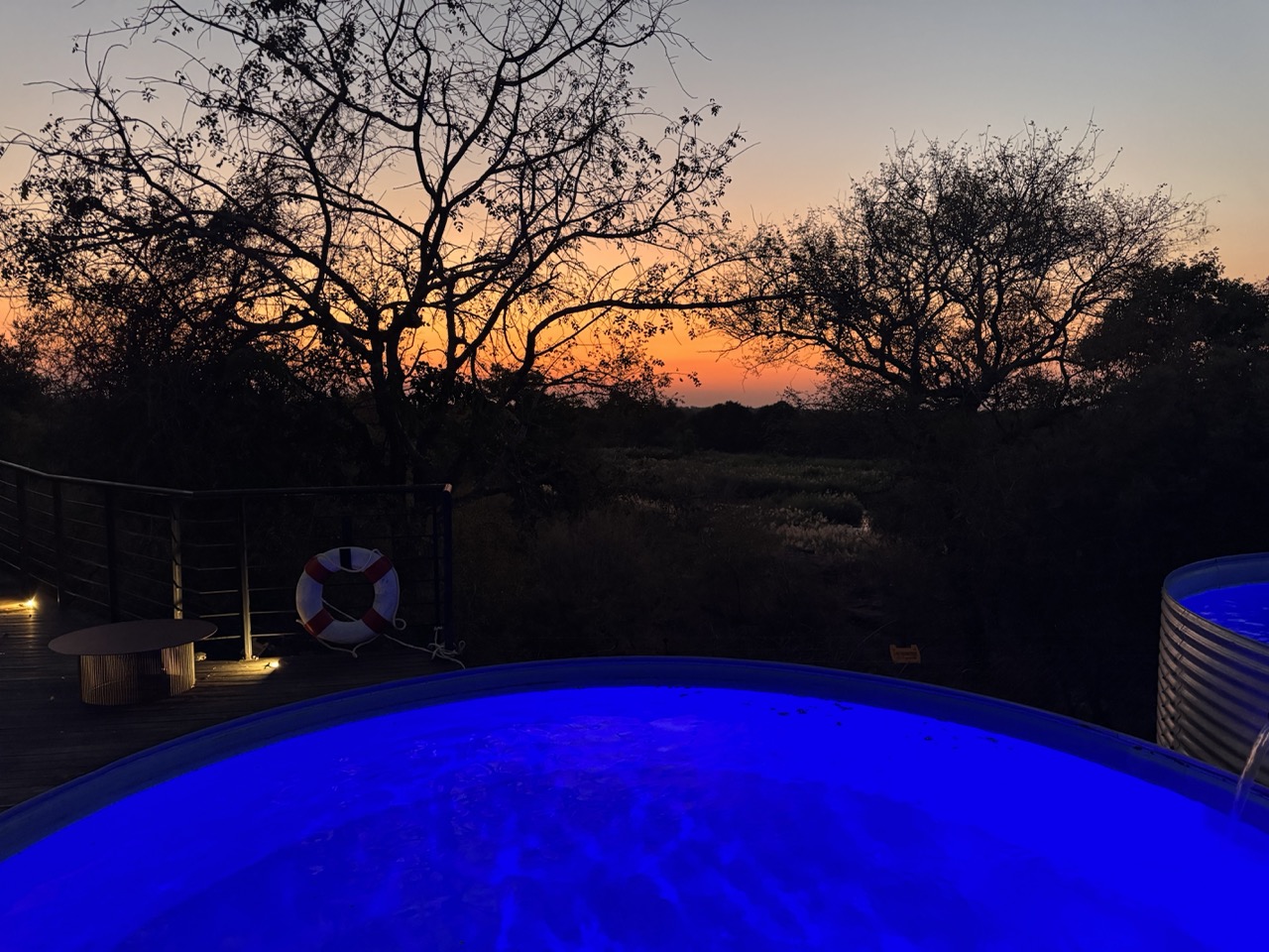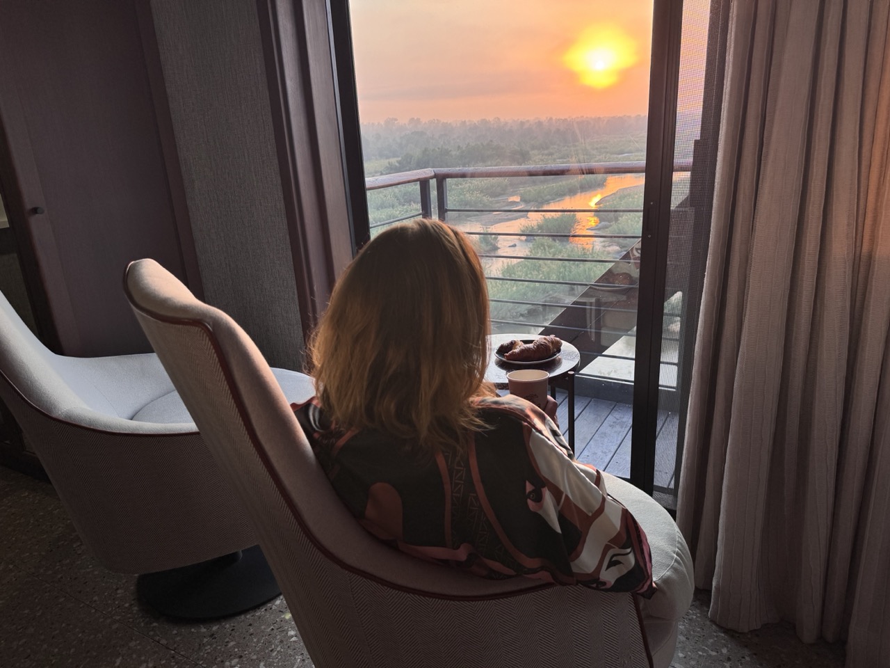 Mein Lieblingsplatz beim Sundowner ist der Lounge-Waggon mit Bar, Sonnendeck und Infinity-Pool auf Schienenhöhe – rund, erhöht, spektakulär, der den Eindruck vermittelt, über dem Fluss zu schweben. Du blickst hinab auf den Sabie River, wo Mama Hippo mit ihrem Nachwuchs dümpelt, und ein sechs Meter langes Krokodil im Wasser liegt, während du oben mit Gin Tonic in der Hand runterschaust und dich fragst, wie sich das eigentlich noch steigern lässt. Zu schade – das Wetter zeigt sich gerade von der frischeren Seite, und meine Bikini-Laune hält sich deshalb dezent zurück. Aber die hartgesottenen Influencer wagen sich ins kühle Nass, und wenn es nur für das perfekte Foto ist.