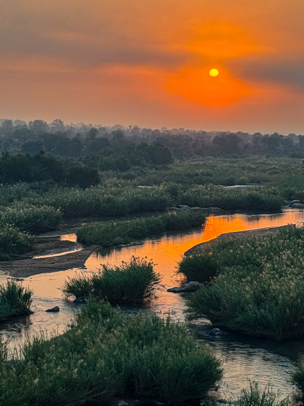Man hat das Gefühl, zu halluzinieren – so surreal schön ist es hier. Die Sonne versinkt langsam, und der Himmel beginnt, in allen Orange- und Rosatönen zu leuchten. Auch der Klang der Natur ist alles andere als leise: das Zirpen der Zikaden, der Wind, der durch das Schilf rauscht, das Grunzen der Hippos unten im Wasser, die vielen Vögel mit ihrem Abendlied.