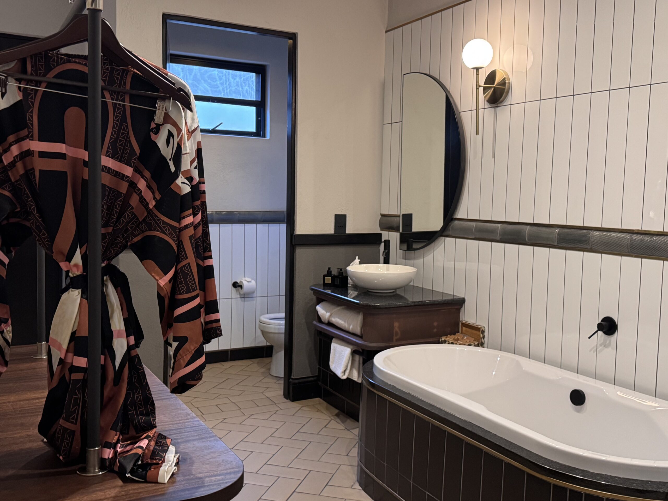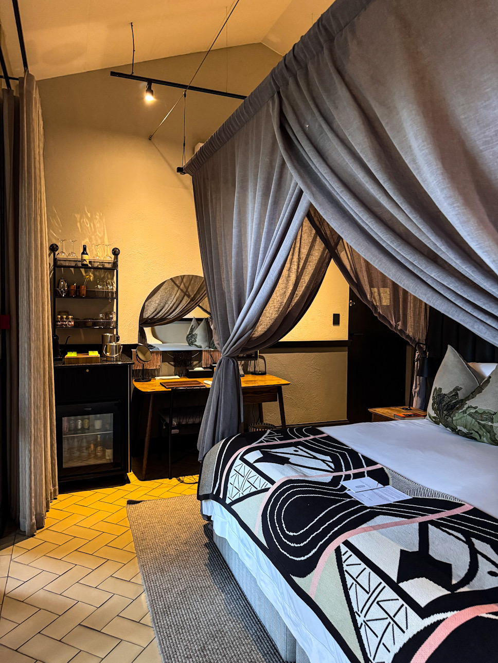 Dahinter: das Schlafzimmer mit Kingsize-Bett, Regendusche und Lounge-Ecke. Warme Erdtöne, grafische Muster, Naturmaterialien – alles in diesem Raum erzählt von Stil mit Substanz. Der Teppich erinnert an Elefantenpfade, die Decke an warmen Sand. Und in der Minibar? Gin. Natürlich südafrikanisch.