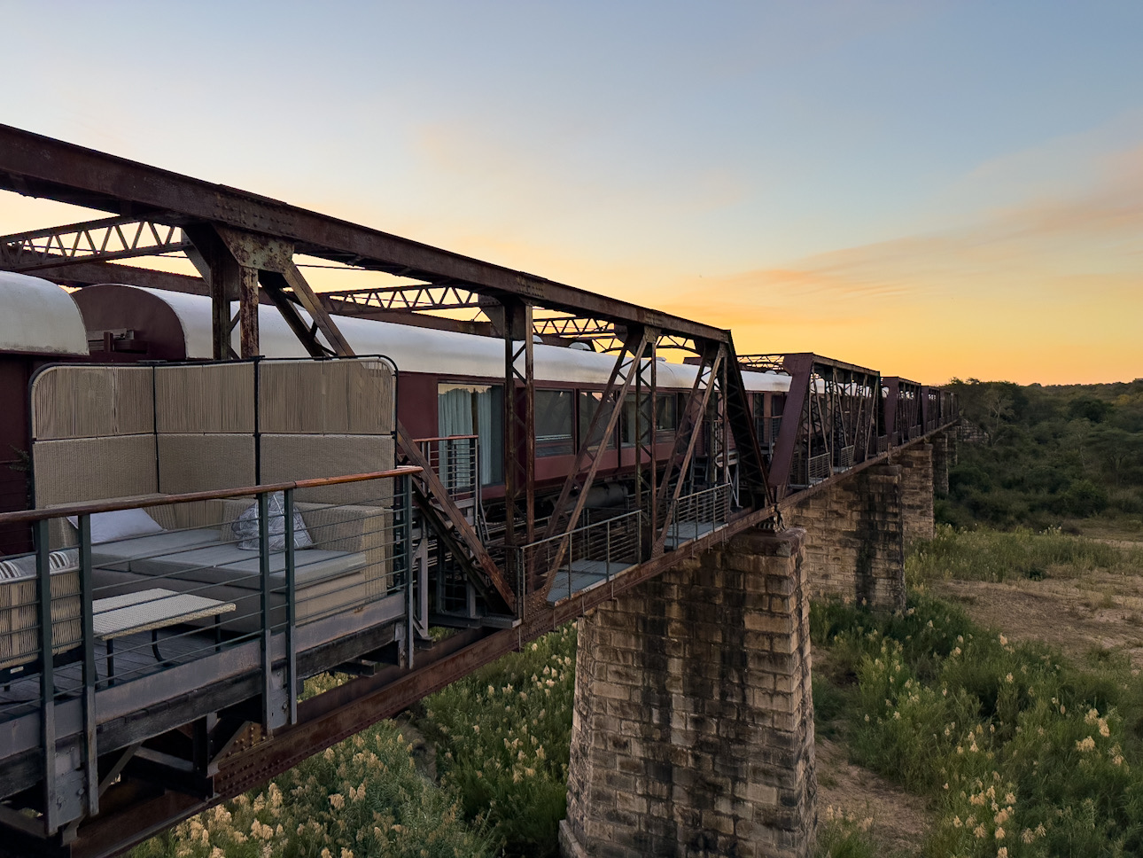 Das Kruger Shalati ist kein gewöhnliches Safari-Hotel, sondern ein umgebauter Zug auf der historischen Selati-Brücke über den Sabie-Fluss. Ein Ort, an dem Safari-Geschichte, Luxus und spektakuläre Natur aufeinandertreffen.