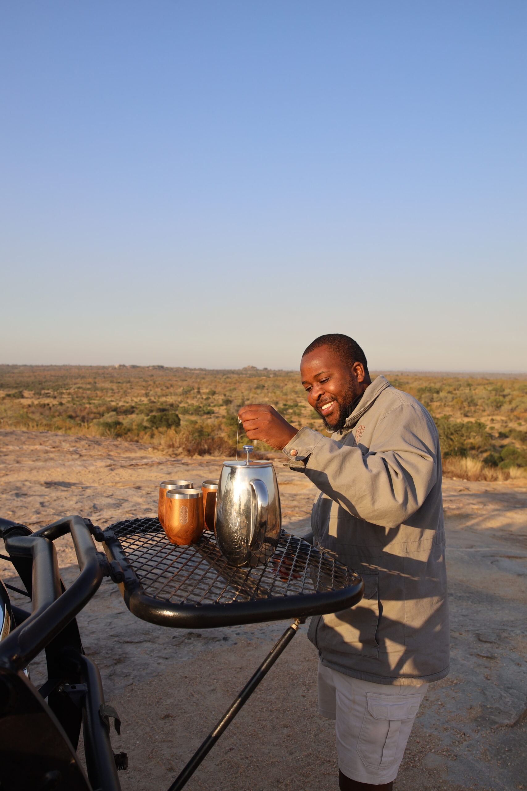 Ich finde, nichts im Leben übertrifft diesen Moment, wenn sich das erste Licht des Tages über das Buschland oder die Savanne legt, während du auf dem Rücksitz eines offenen Safari-Fahrzeugs sitzt – eingehüllt in eine warme Decke, mit Wärmflasche auf den Knien, die Kamera im Anschlag, der Kaffee in einem Becher noch dampfend in der Hand.