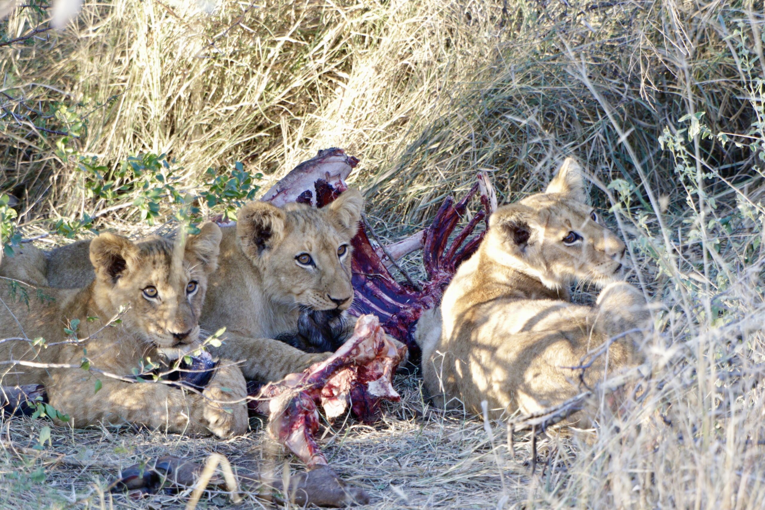 Das ist keine Doku auf dem National Geographic Channel. Das ist echt. Eine Löwenmama mit drei Kleinen – gerade mal fünf Monate alt. Eines davon, erzählt Ross, ist adoptiert. Sie liegen direkt vor uns, keine drei Meter entfernt. Mama döst, genervt vom Trubel, während ihre drei kleinen Rabauken sich am frischen Mahl laben.