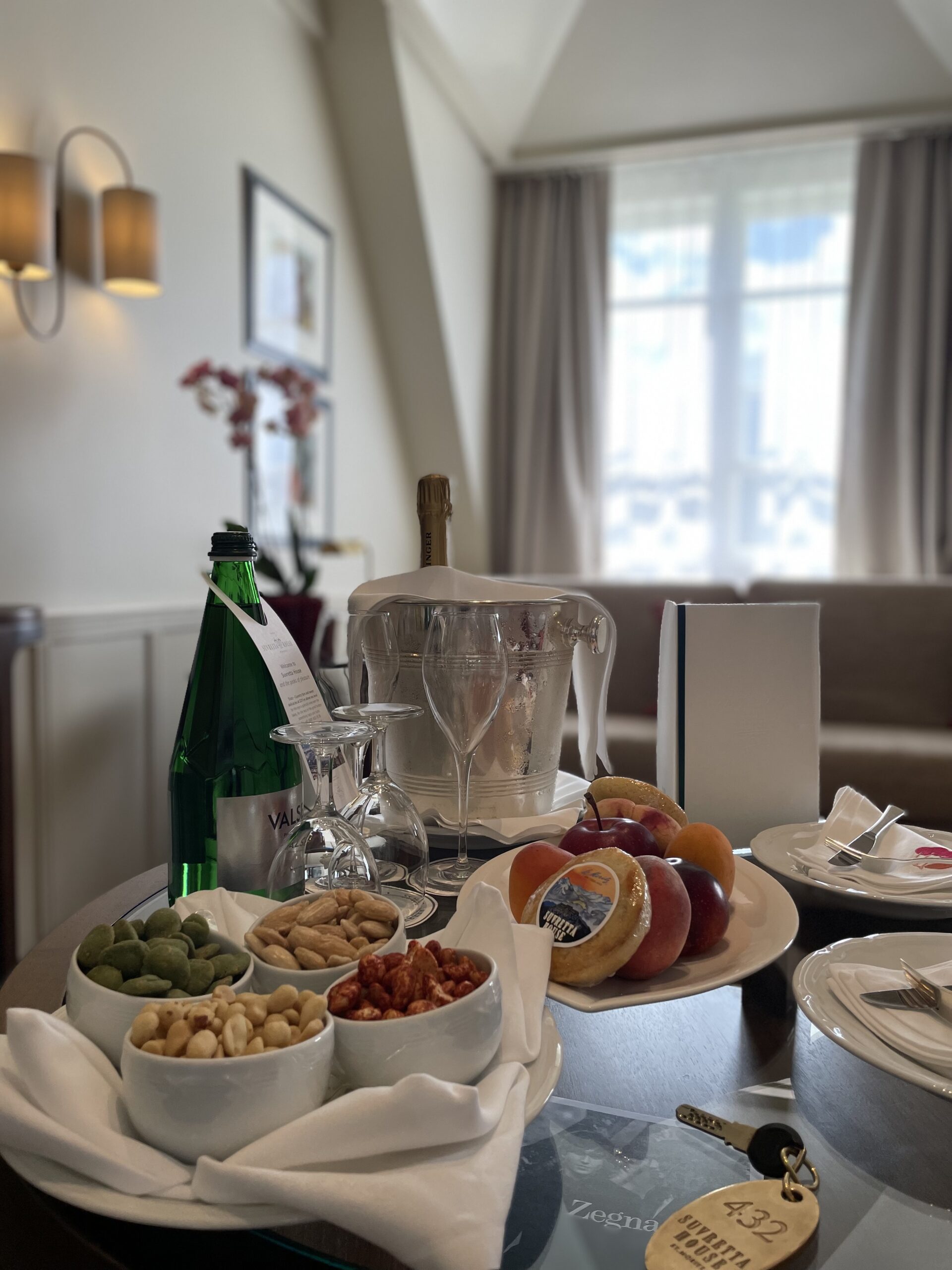 Die Suite selbst war hell, stilvoll und funktional eingerichtet: ein komfortables Doppelbett, ein Sofa, zwei Sessel mit Tisch – perfekt, um nach der Golfrunde nochmal kurz die Füsse hochzulegen oder die Route für den nächsten Tag zu planen. Eine liebevolle, handgeschriebene Begrüssung, dazu Champagner, frisches Obst, ein lokaler Kuchen und ein bisschen Schweizer Schokolade empfingen uns – kleine Gesten, die sofort Wärme und Wertschätzung vermitteln.