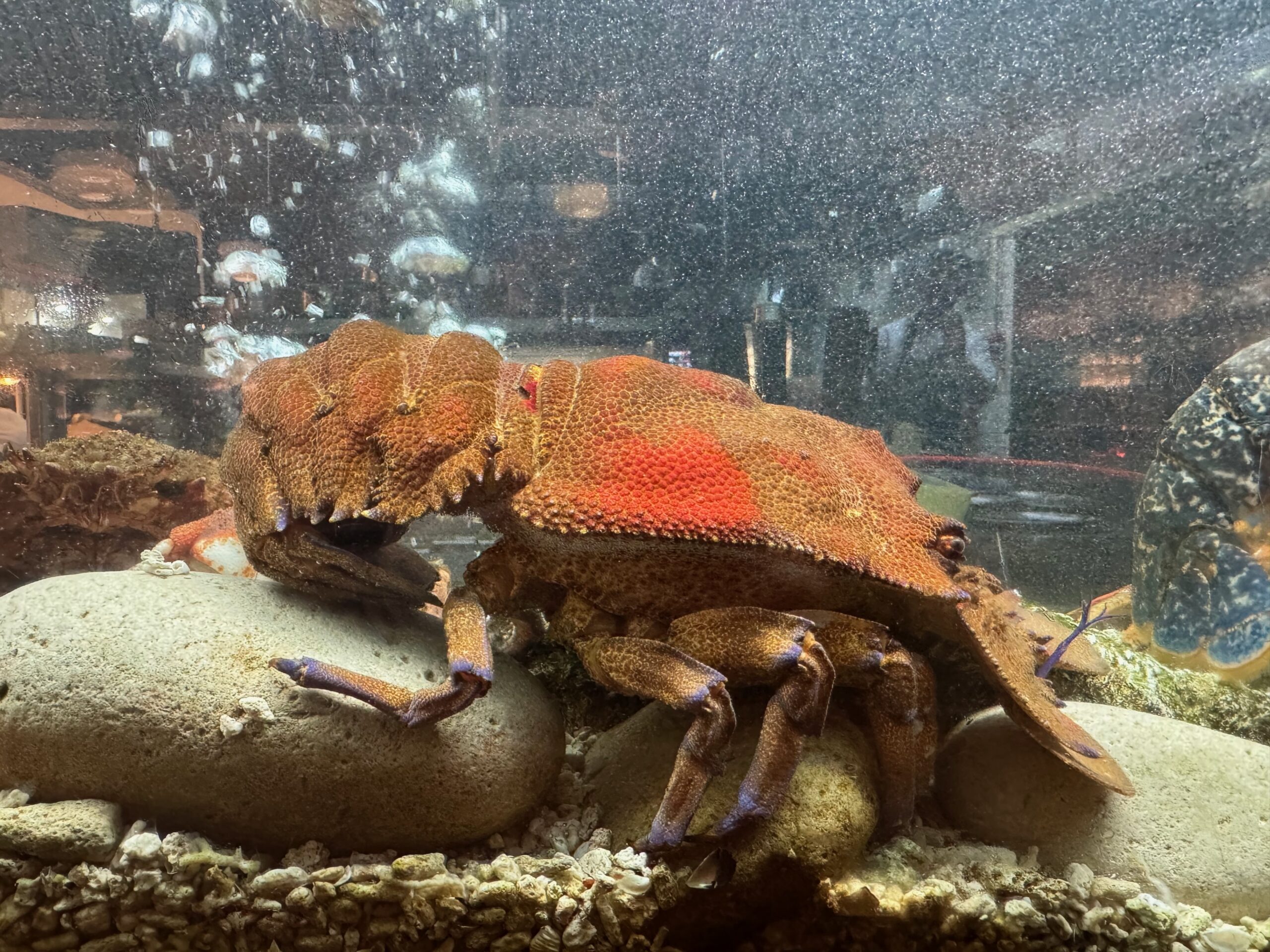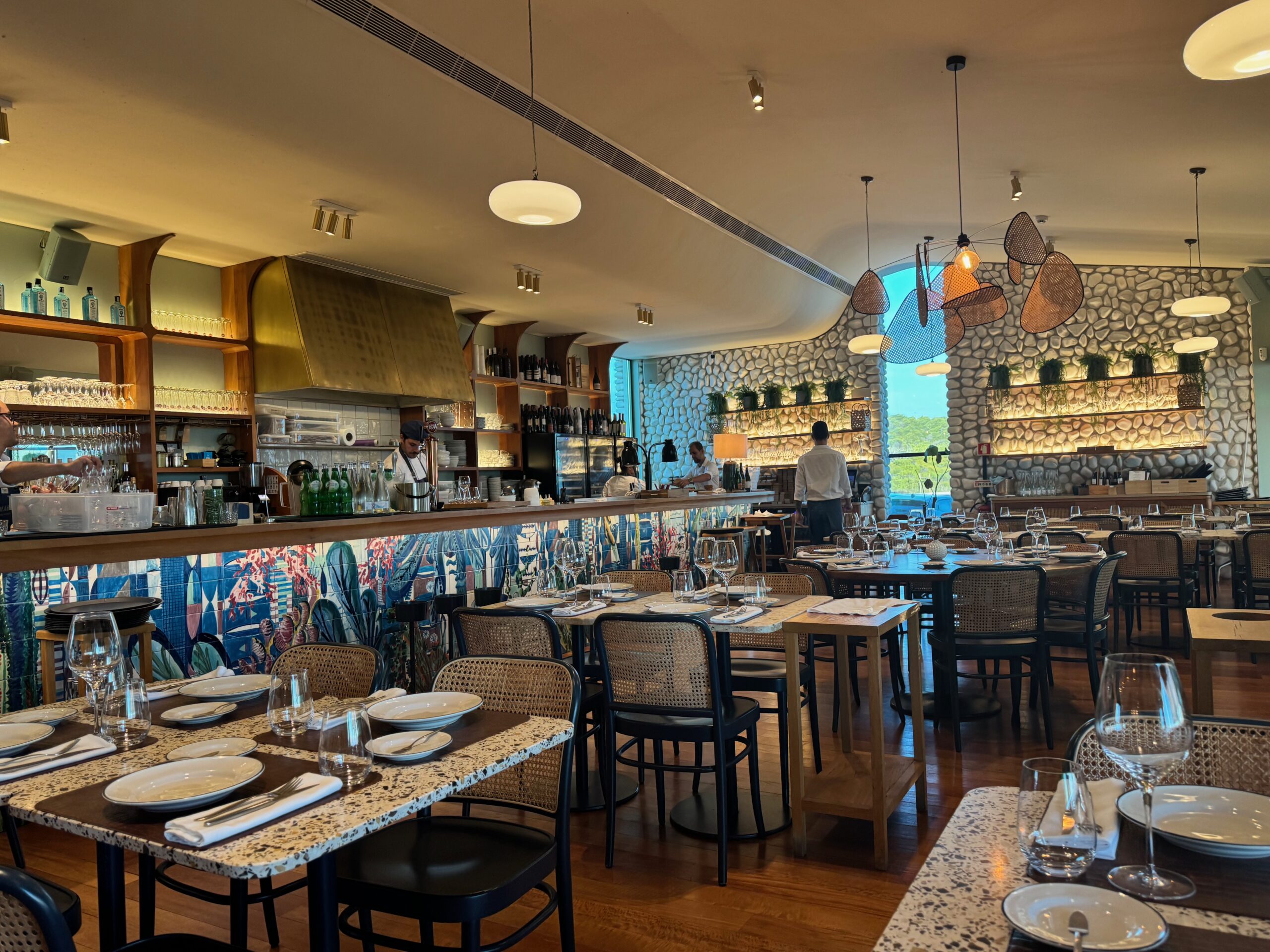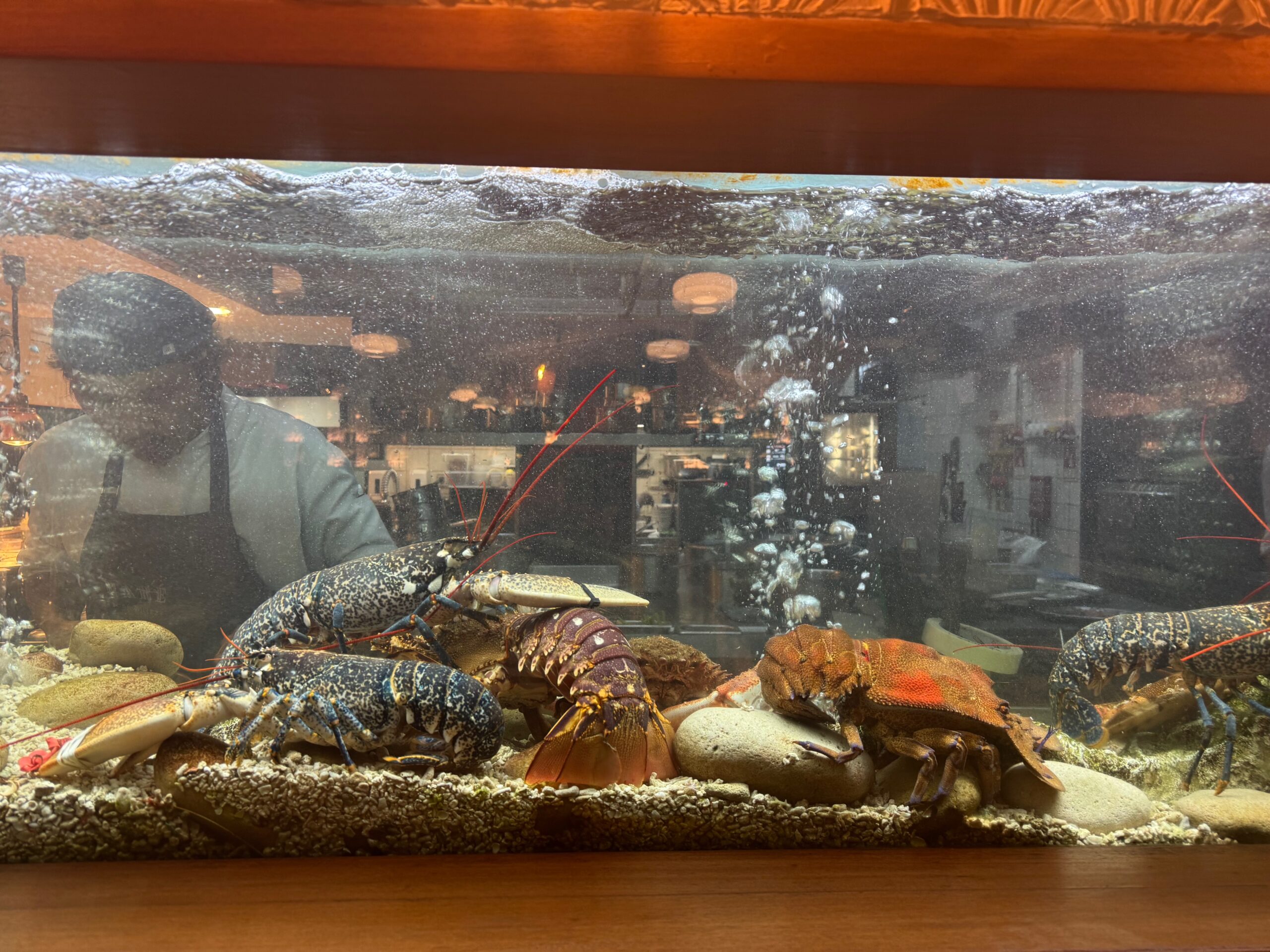 Vor der Tür glänzen die Sportboliden im rotgoldenen Dämmerlicht. Drinnen rauscht die Stimmung wie die Brandung vor der Terrasse: Jeder Tisch ist besetzt, die Atmosphäre lebendig, aber zugleich elegant. Sofort ins Auge fallen die lebenden Riesen-Krebse, Langusten und Hummer im Aquarium. Direkt dahinter die offene Küche, wo man die Köche beobachten kann. Das Publikum ist so vielfältig – von Geschäftsleuten, die den Abend stilvoll ausklingen lassen, über Paare beim Dinner-Date bis hin zu Locals, die den Laden längst als Garant für Qualität kennen. Junge Gesichter, erfahrene Feinschmecker, Touristen wie Einheimische.