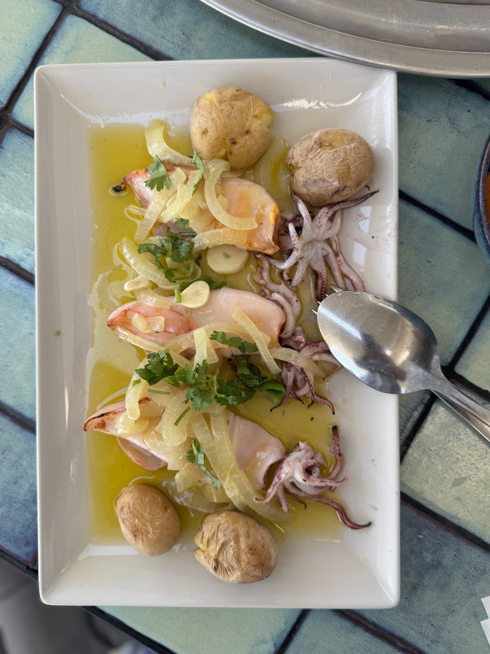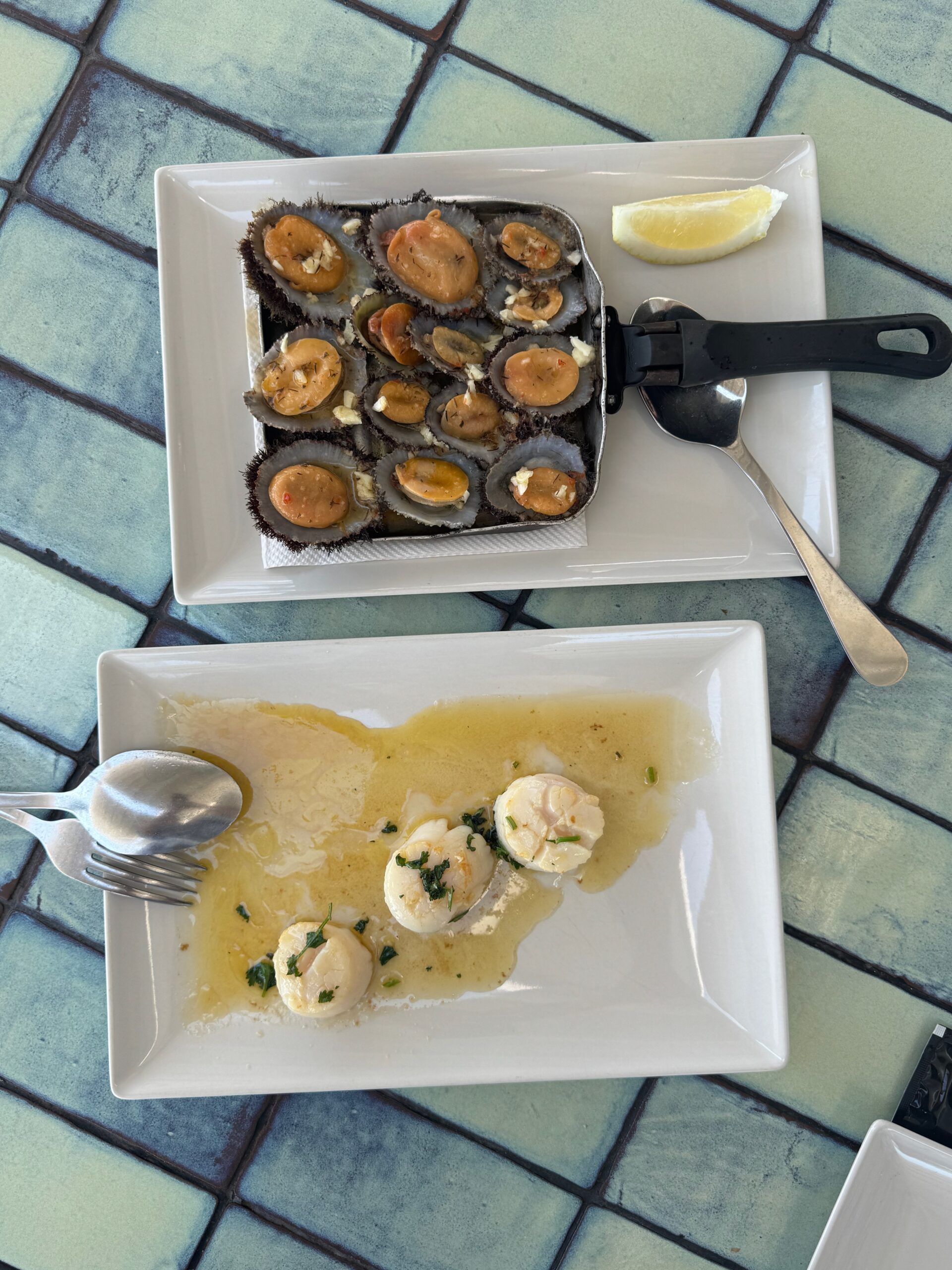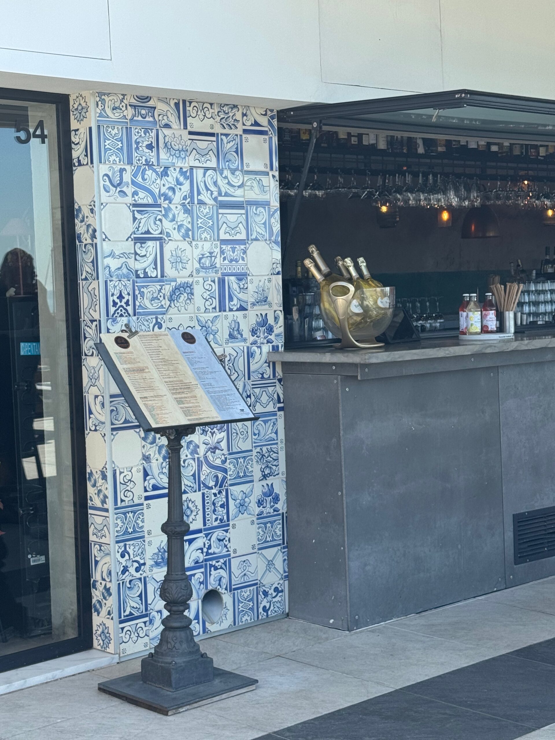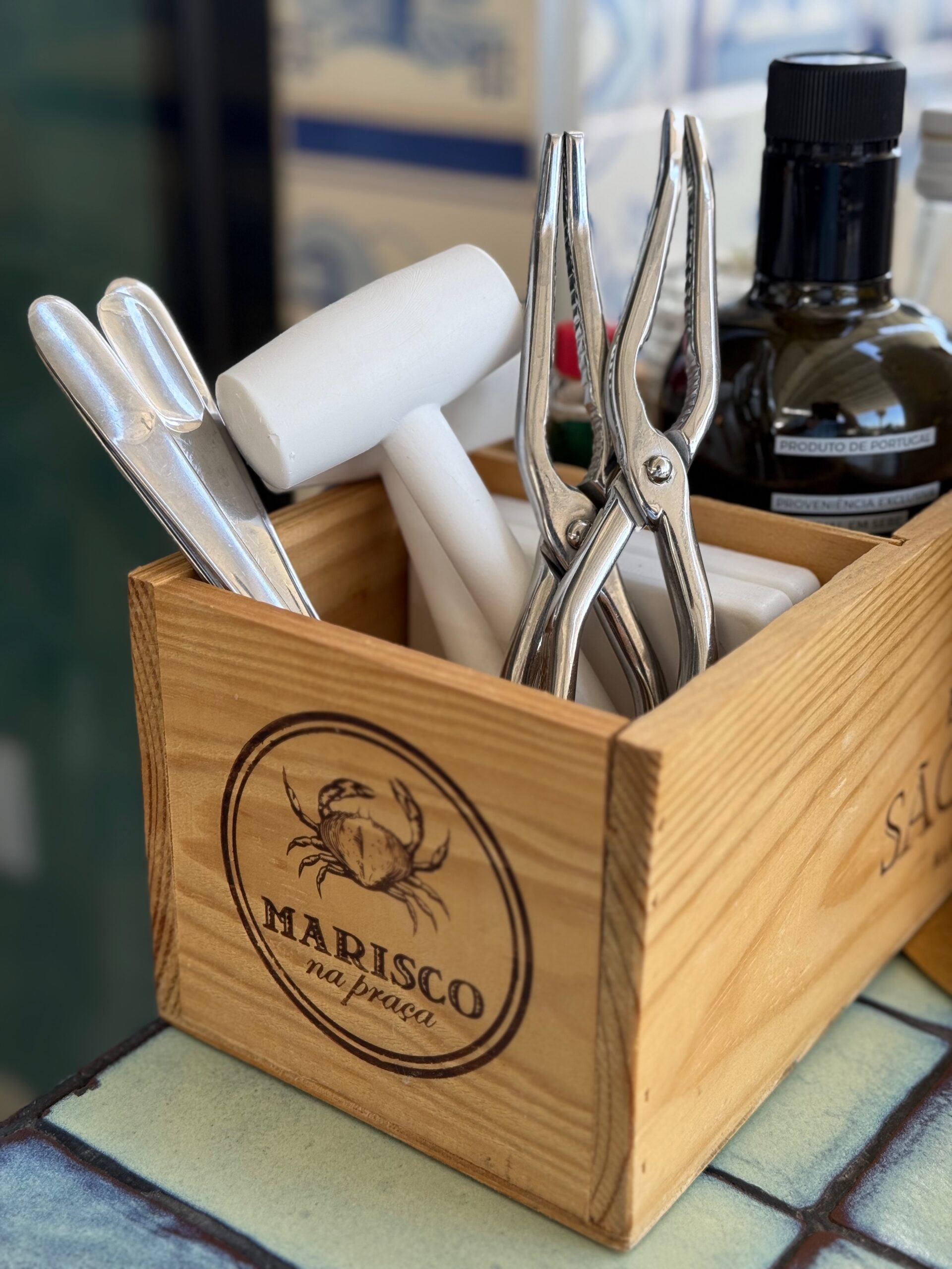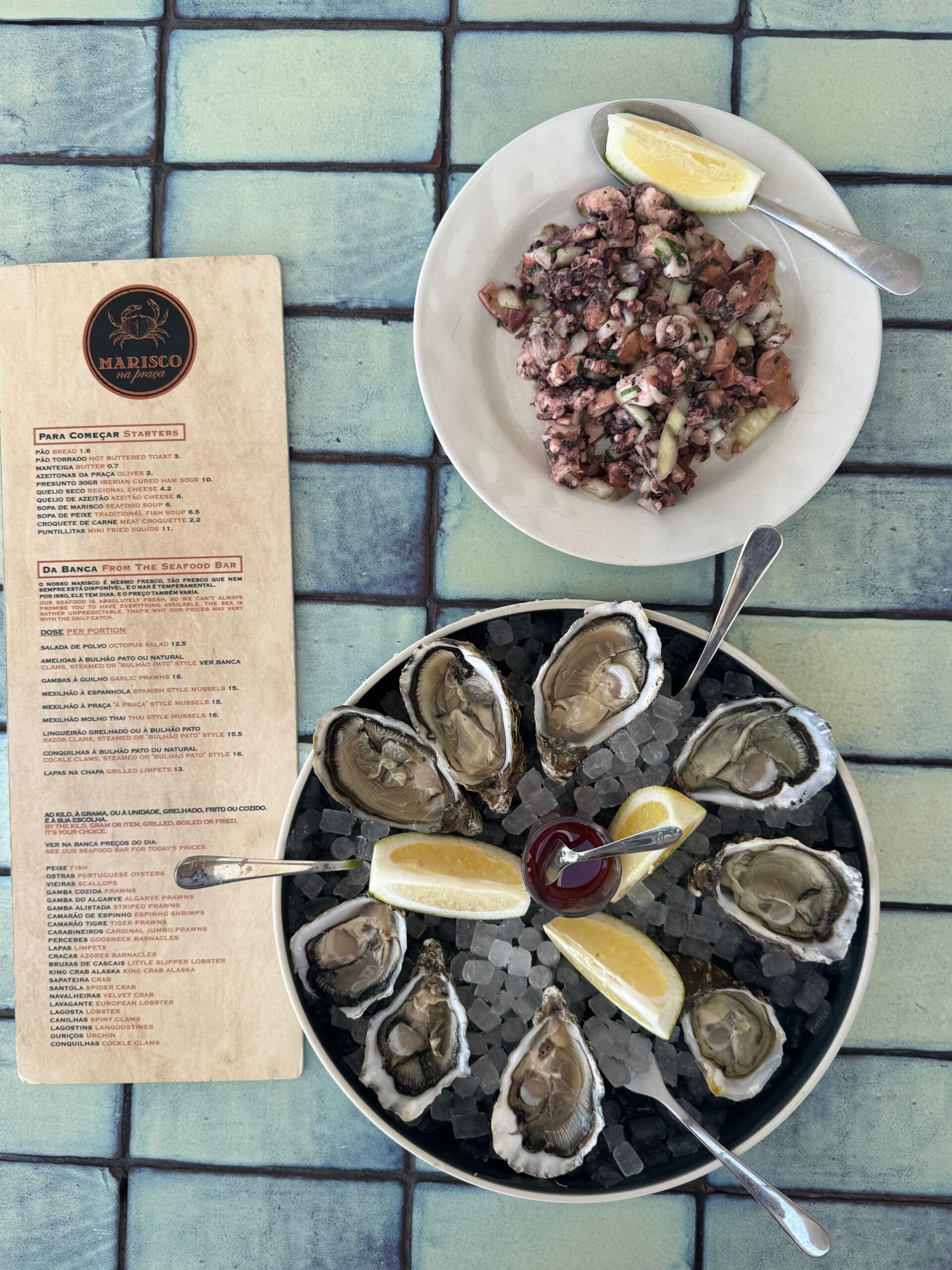 Innen zeigt sich das Marisco na Praça modern – ohne weisse Tischdecken, dafür mit ehrlichem, bodenständigem Charme. Draussen sitzt du auf robusten Holzbänken, türkisblau gefliest wie das Meer vor der Tür – eine Schlichtheit, die sofort Sympathie weckt. Die Atmosphäre ist locker, lässig und zugleich authentisch. Doch lass dich vom entspannten Setting nicht täuschen: Die Küche spielt in einer ganz anderen Liga. Hier zählt Qualität – und sie beweist, dass Luxus oft in der Einfachheit liegt. Luxus im Marisco na Praça bedeutet nicht Kristallgläser oder gestärkte Servietten, sondern die Perfektion verschiedener Austernsorten oder die Freude, eine frisch aufgebrochene Krabbe direkt am Tisch zu geniessen.
