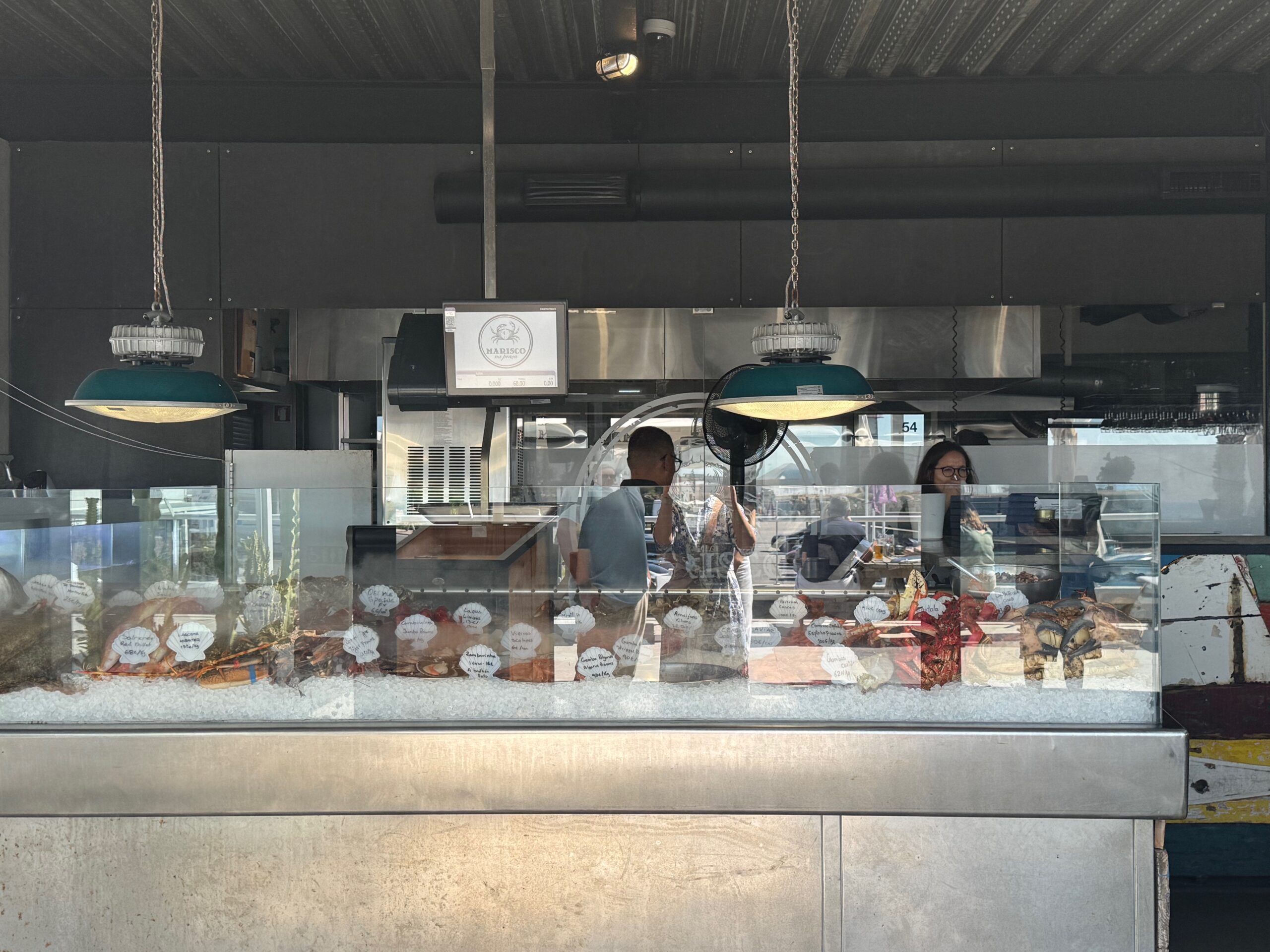Im Marisco na Praça suchst du dir deinen Fang des Tages direkt am Eingang an der Auslage aus – ob nach Kilo, Gramm oder Stück, ganz wie du willst. Auf dem Display findest du ausschliesslich das, was das Meer genau an diesem Tag hergegeben hat – fangfrisch, unverfälscht und ohne Umwege. Deine Wahl wird gewogen, in die Küche gebracht und dort zubereitet. Keine Sorge: hier wandern keine lebenden Tiere über die Theke.
