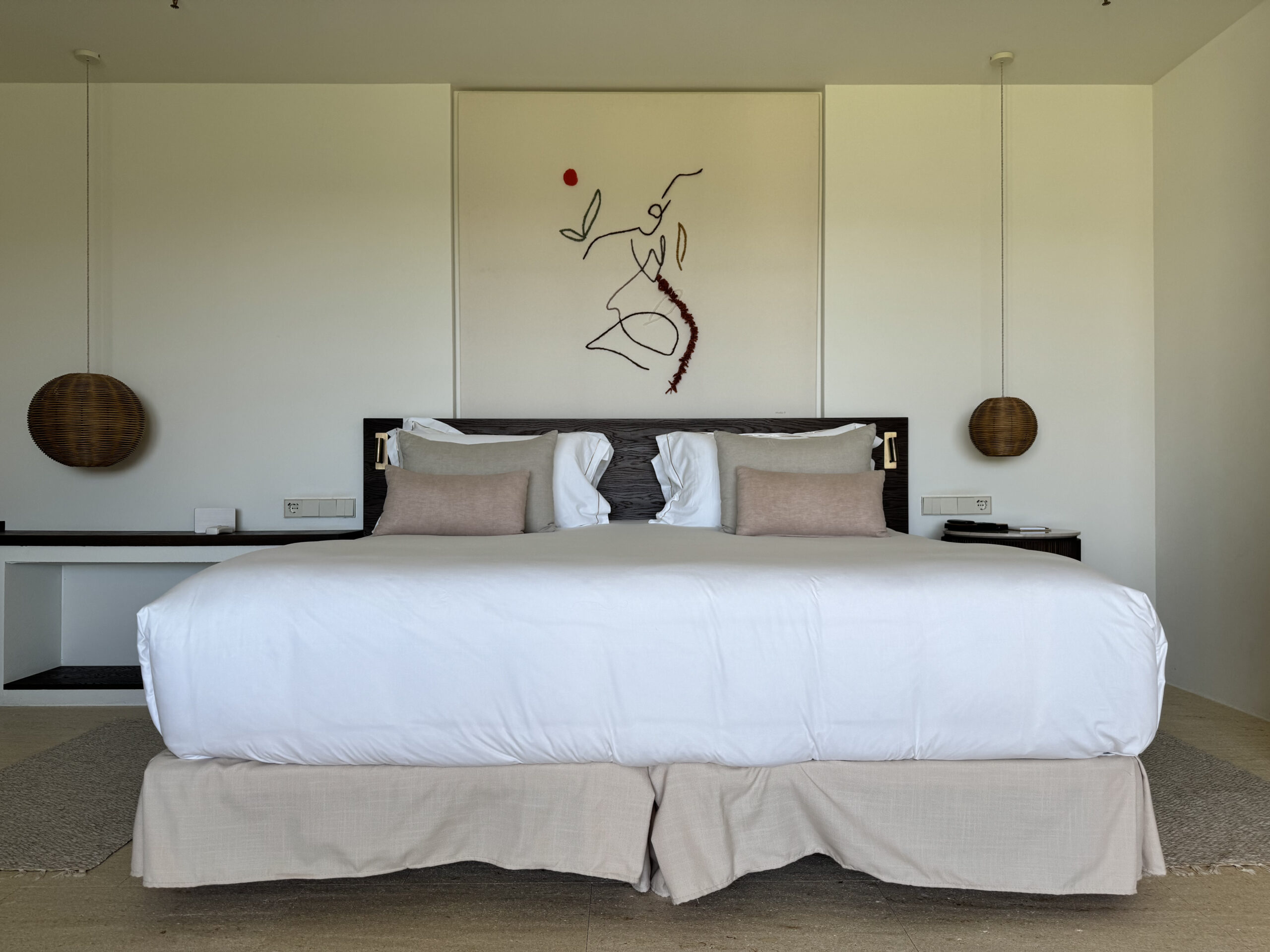Das Interieur ist erdig, bodenständig und lässig – irgendwie andalusisch und doch so clean. Sanfte Beige- und Weisstöne treffen auf perfekt abgestimmte Stoffe. Die Designer setzten auf echtes Holz statt Furnier und Naturfliesen aus Korallenstein statt Zementfliesen. Alles besteht aus naturbelassenen Werkstoffen. Das siehst und fühlst du sofort. Es ist schick, aber keineswegs überkandidelt. Der Dresscode ist flexibel – ob in Stilettos oder Sneakers, hier passt alles. Selbst die Mitarbeiter fügen sich mit farblich harmonierenden Leinen-Outfits in das natürliche Ambiente des Hauses ein. Überall im Hotel findest du regionale Kunstwerke, die in unerwarteten Ecken Akzente setzen. Dazwischen wiegen sich bunte Blumen in der sanften Brise, die vom nur fünf Kilometer entfernten Meer herüberweht.