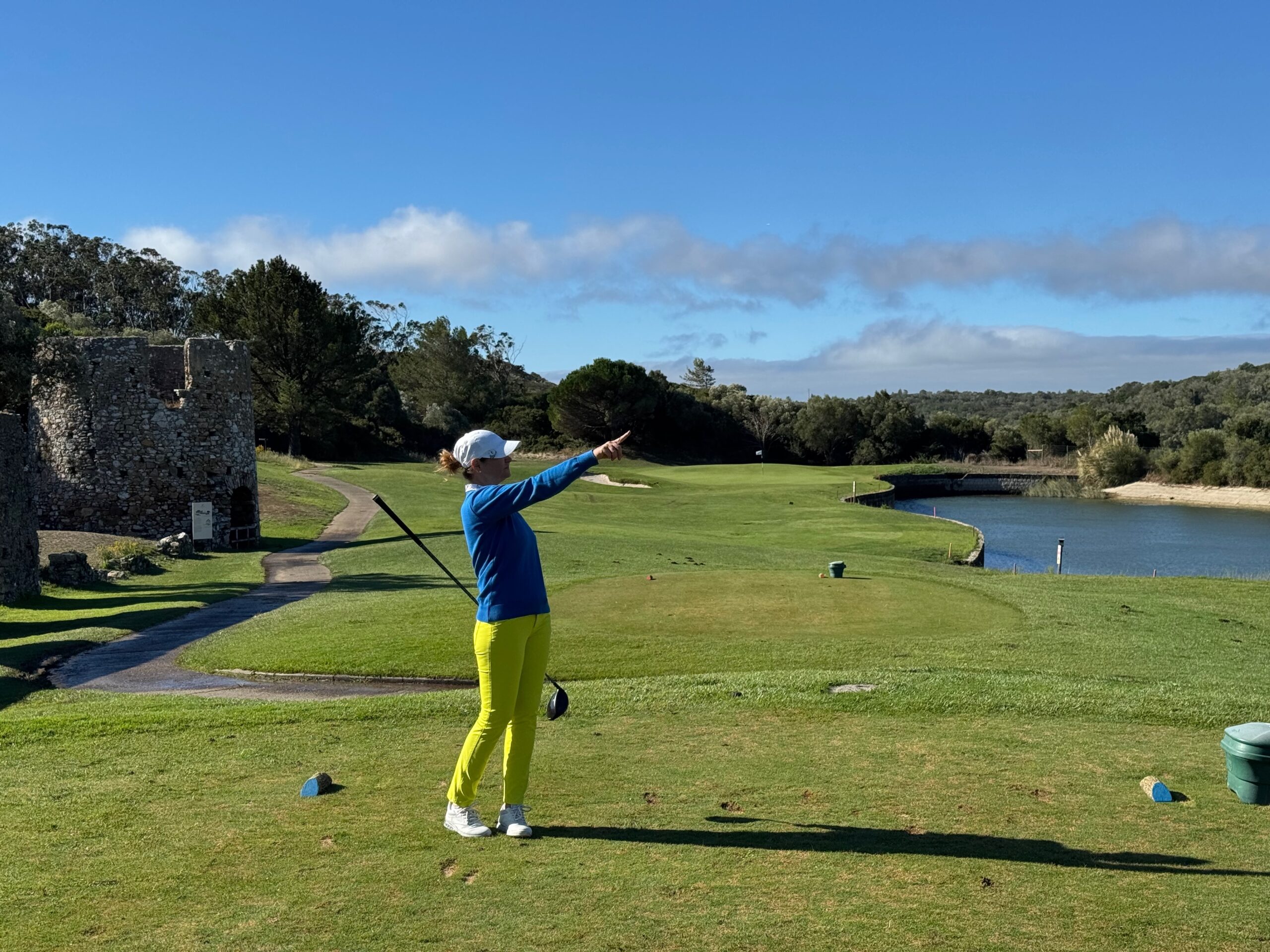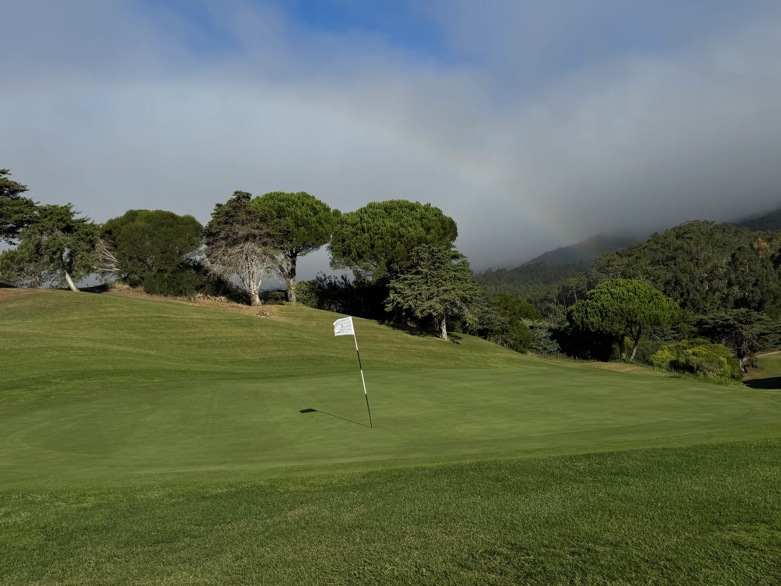 Das Lichtspiel aus Sonne und Schatten, Wolken, Regen – und ein Regenbogen – war unser ständiger Begleiter. Fast hätten wir vergessen, dass nebenan auf der der alten F1-Rennstrecke in Estoril gerade das Classic lief. An Loch 12 siehst du von diesem Abschlag aus rechts die Rennstrecke.