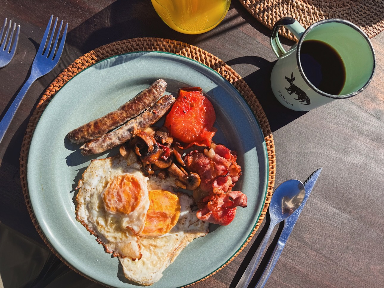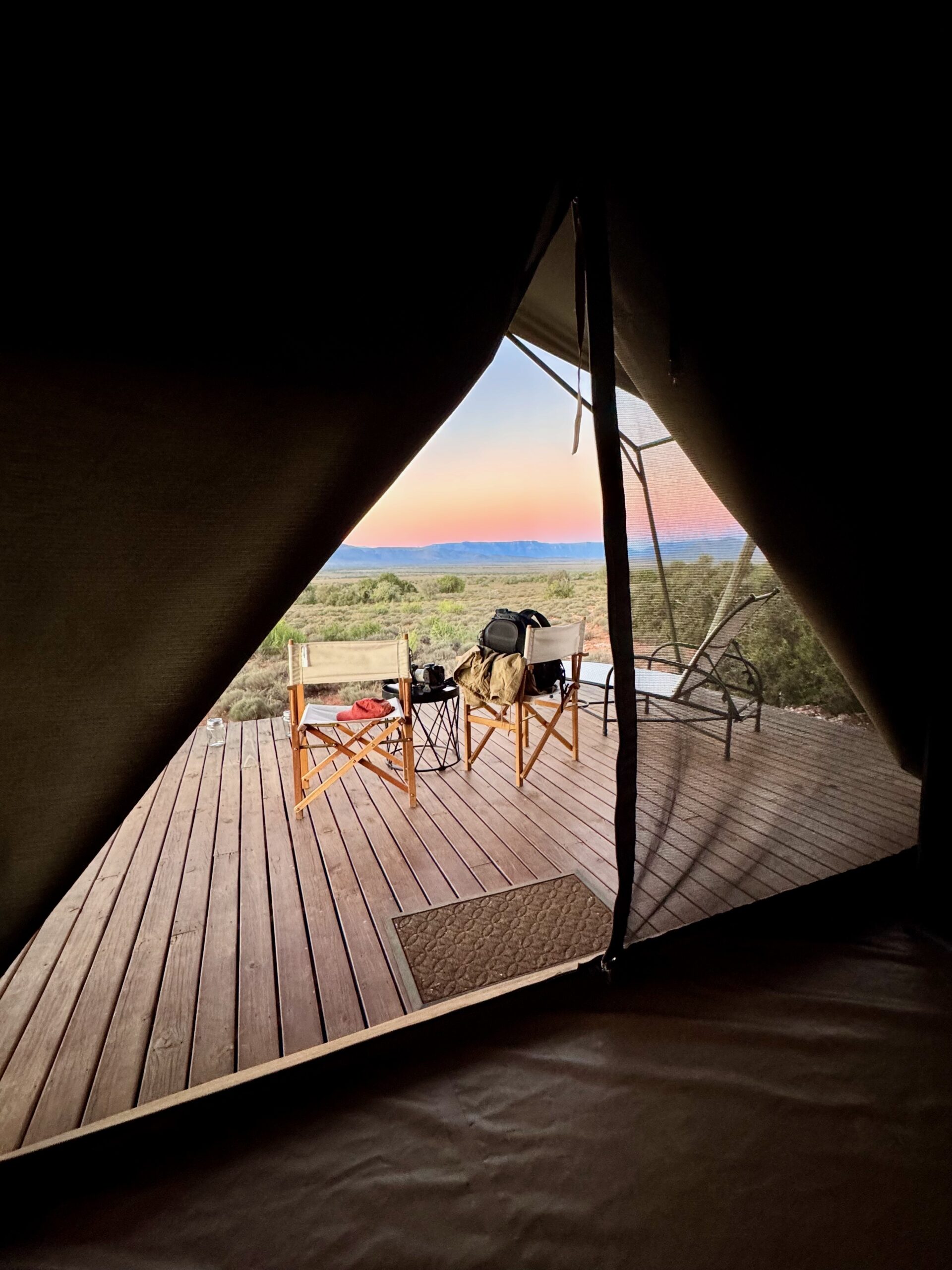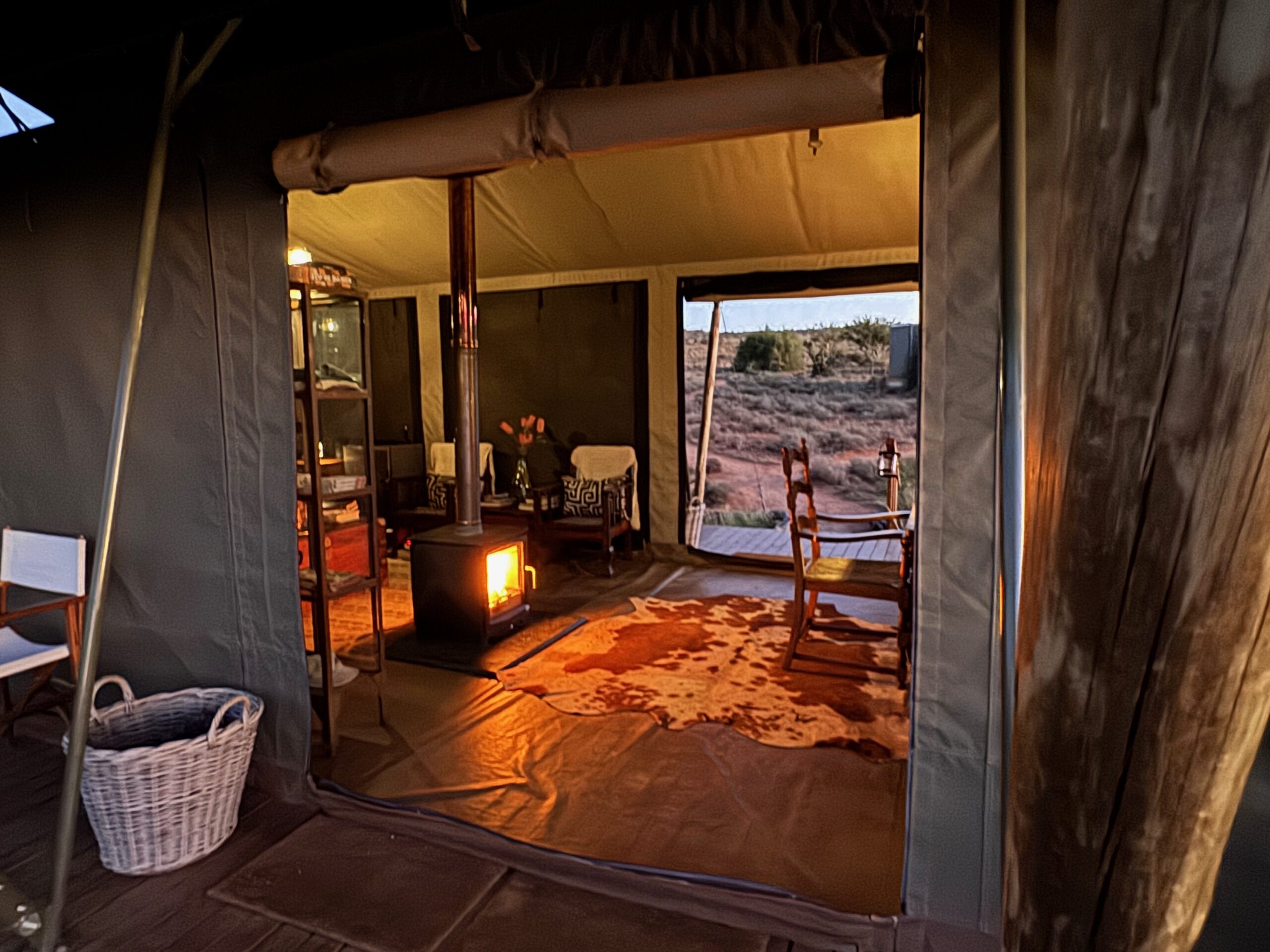 Dein Zelt fühlt sich an wie eine Hommage an die ersten Pioniere: Eisenbett, liebevolle Details, handgemachte Möbel aus der Region. Sogar die Betten – selbst entworfen und vor Ort gefertigt, wie Ruloff stolz erzählt. Es gibt spülbare Toiletten, eine Freiluftdusche (heisses Wasser auf Wunsch – bei 10 Grad draussen verzichtest du aber gerne). Im gusseisernen kleinen Ofen knackt das Holz – und statt Strom gibt es eine warme Wärmflasche und flackerndes LED-Licht neben dem Bett. Als Gute-Nacht-Gruss: eine kleine Lindt-Kugel auf dem Kissen. Ein Stück Schweizer Heimat mitten in der Karoo.