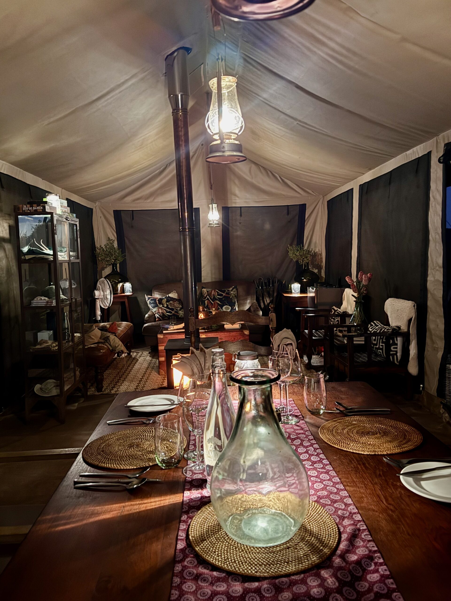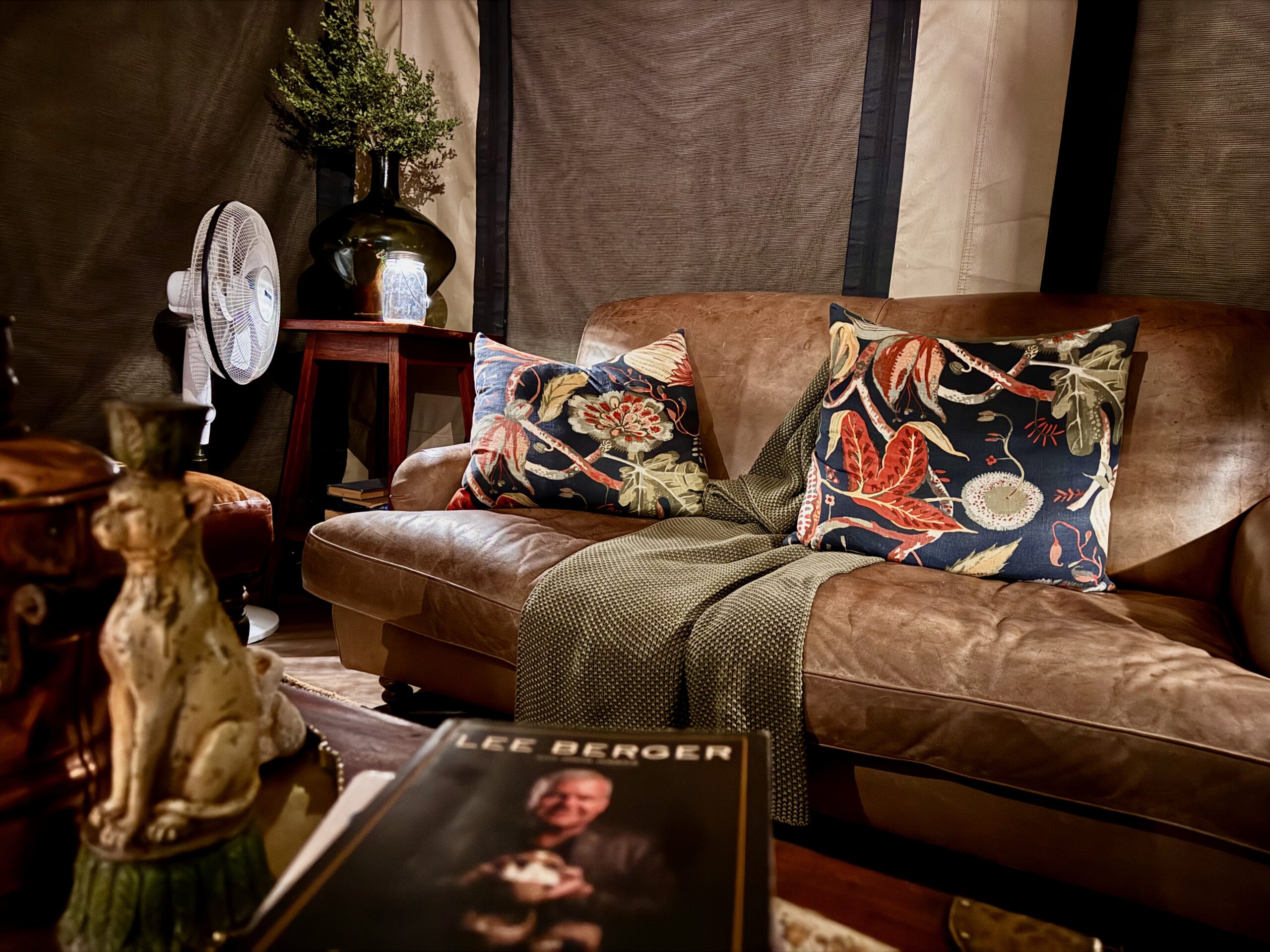 Frühstück, Lunch und Dinner gibt es im Gemeinschaftszelt des Plains Camp im Samara Karoo Reserve. Im Innern herrscht eine warme, fast nostalgische Stimmung. Das Ledersofa mit bestickten Kissen und einer grob gewebten Decke lädt zum Versinken ein. Bücher mit Geschichten aus der afrikanischen Wildnis liegen auf dem Tisch. Das ganze Luxus Safari Camp wird von Kerzenlicht und Öllampen beleuchtet – es gibt keinen Strom, dafür aber viel Atmosphäre.