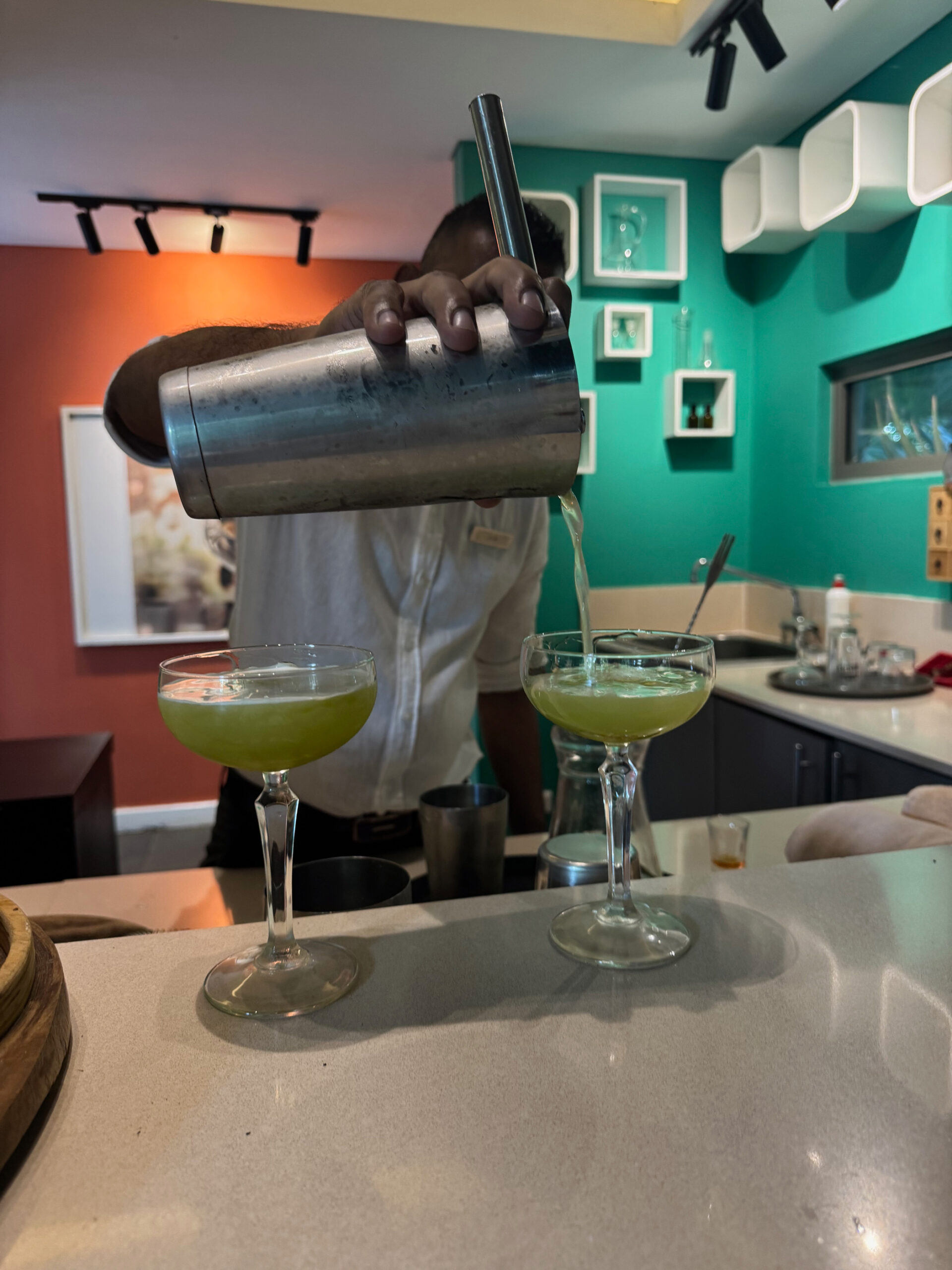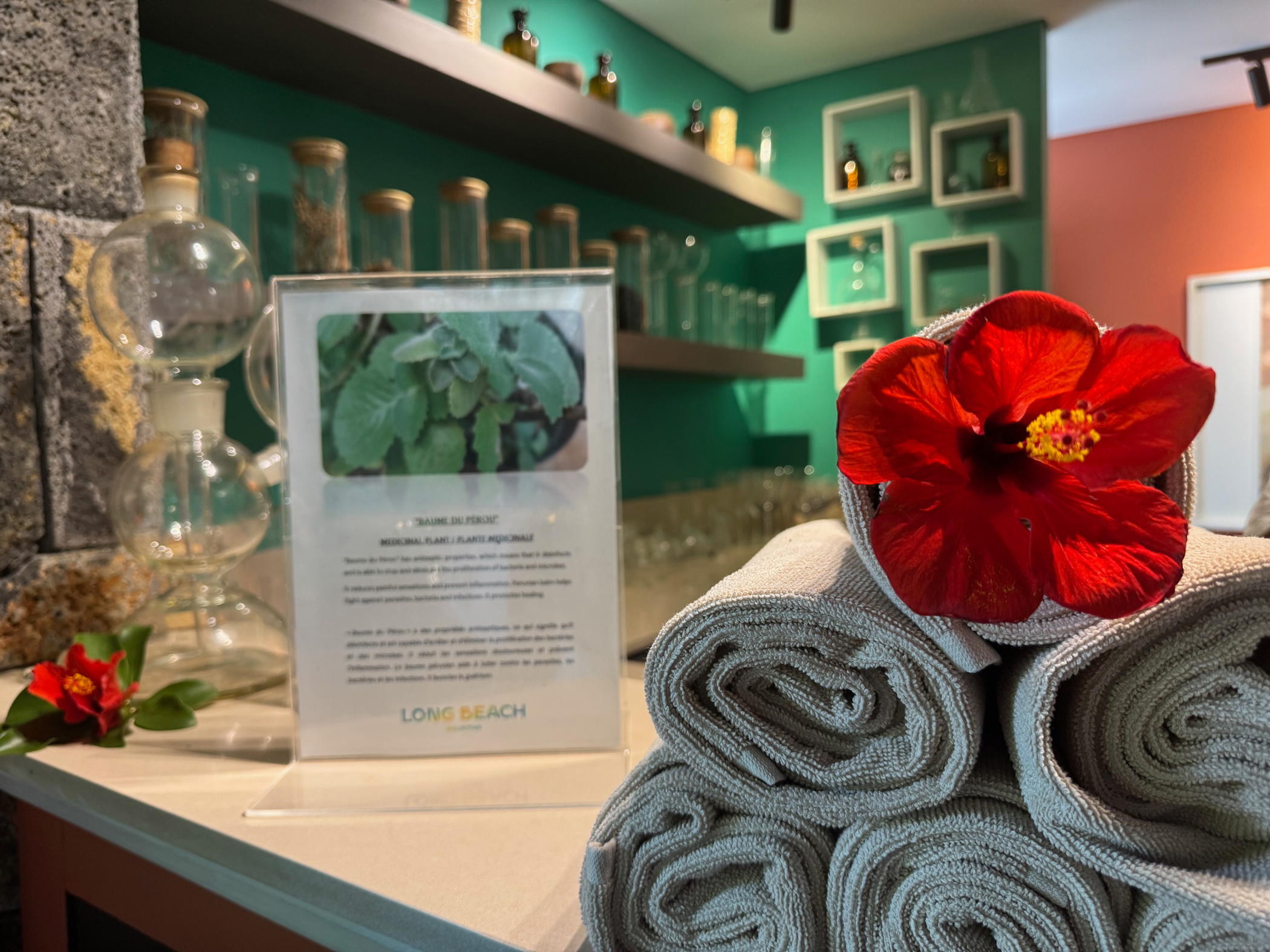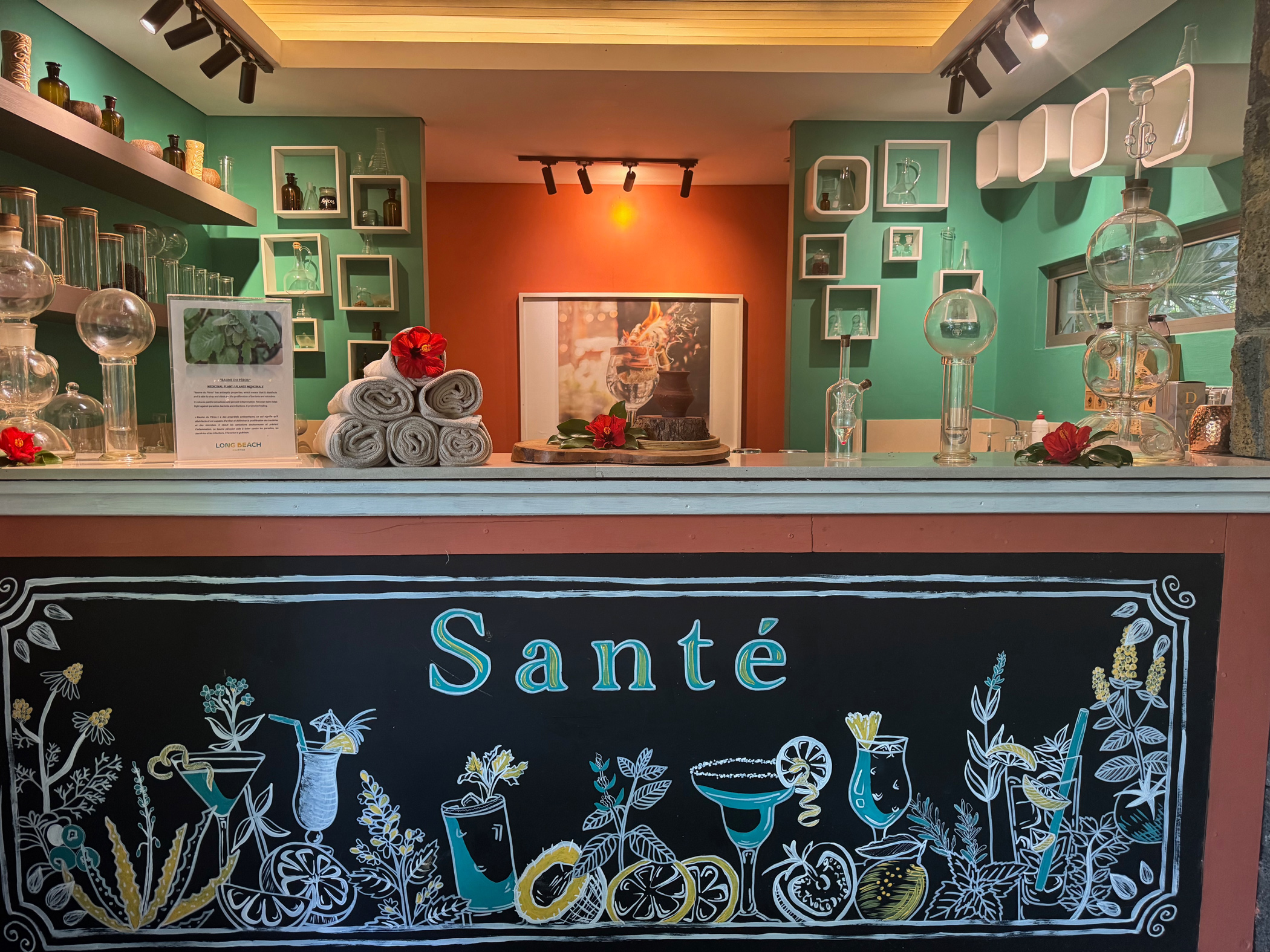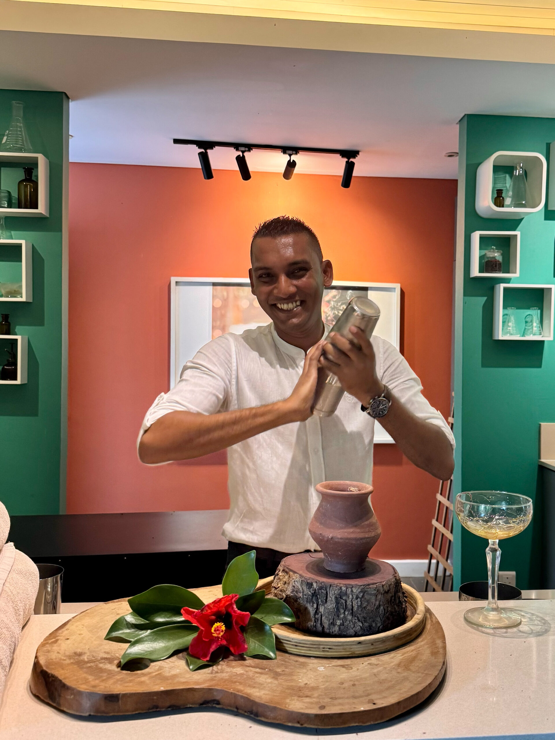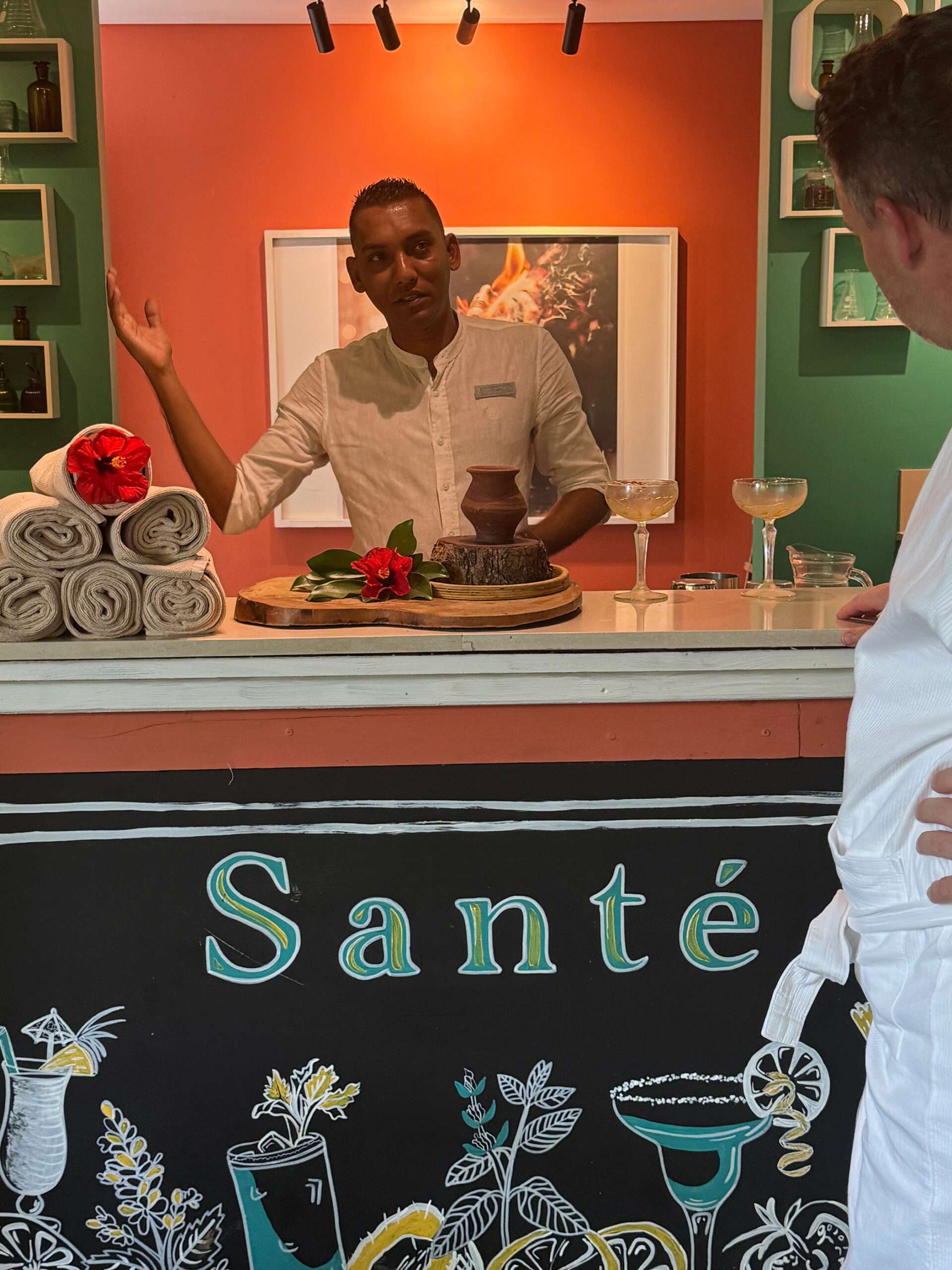 Das Santé Lab — so nennen sie es hier — geht weiter als klassische Mixologie. Es verbindet handwerkliches Shaken mit den heilenden Eigenschaften mauritianischer Botanicals. Vini erklärt, während er arbeitet: was Zitronengras für den Kreislauf tut, warum Rosmarin den Kopf klar macht, was das Thai-Blatt so besonders macht.