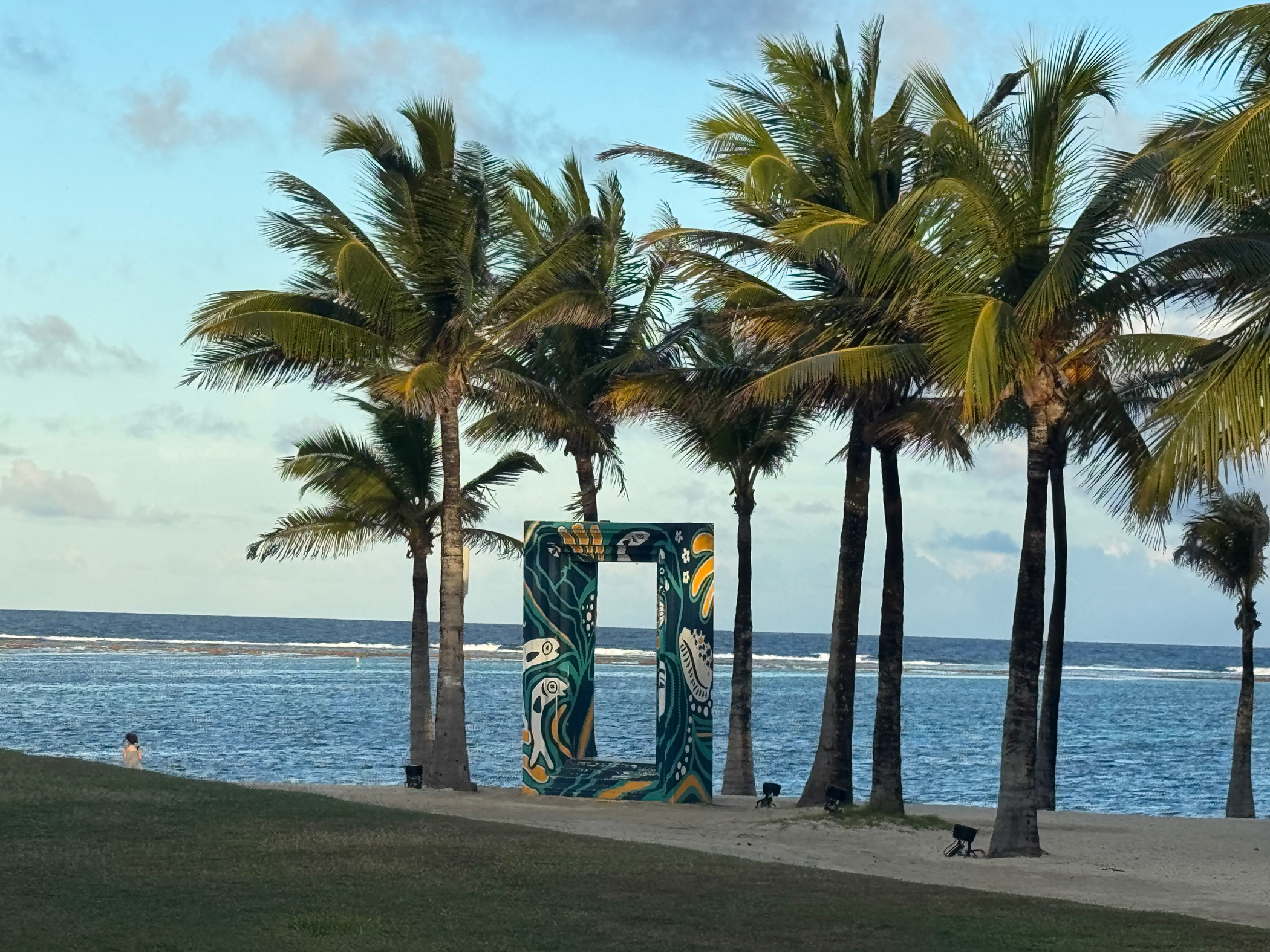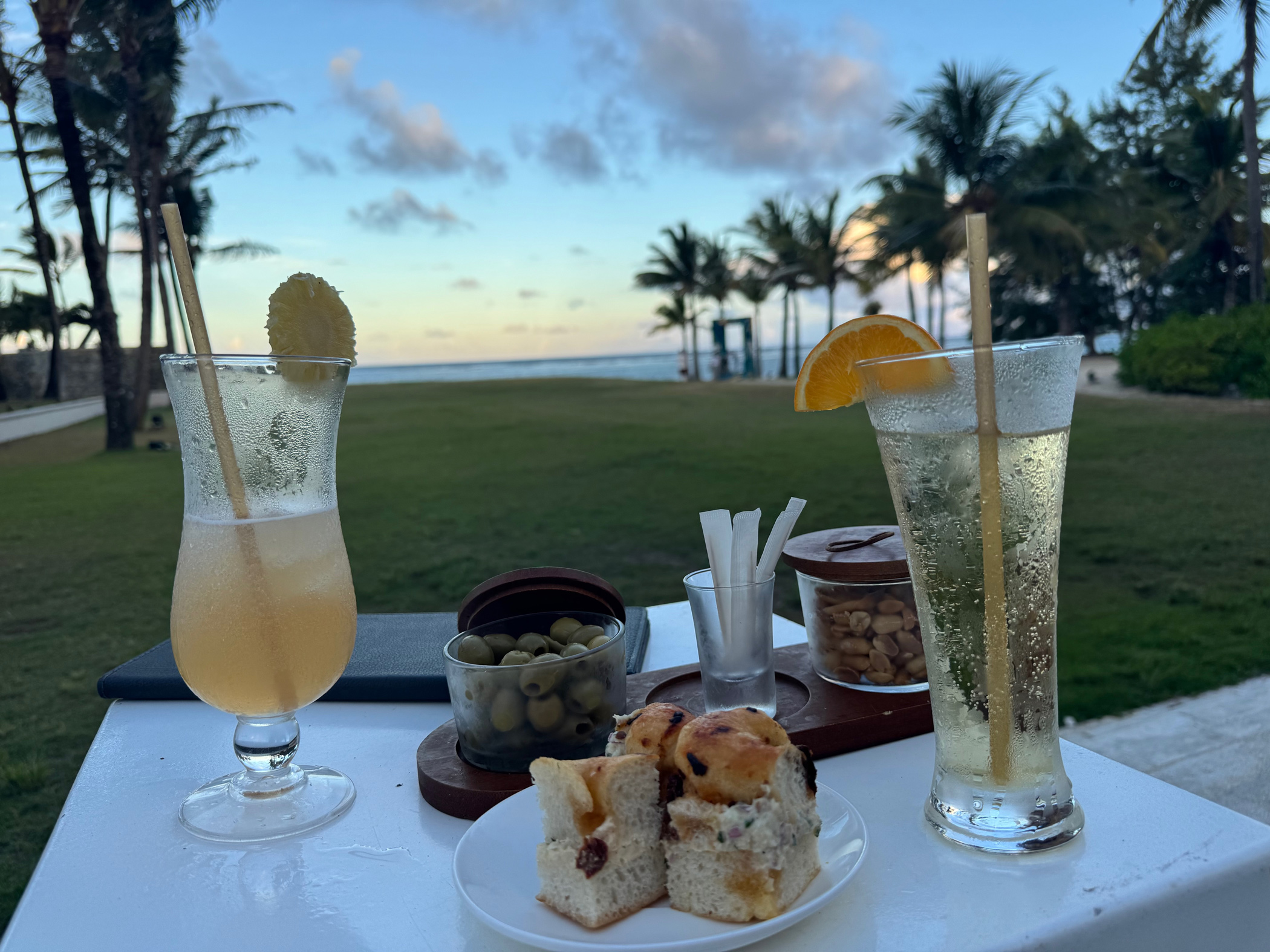 Der Ausgangspunkt für alle Restaurants ist die Plaza. Ich nenne sie einfach mal so, weil sie mit dem schwarz-weissen Schachbrettmuster des Bodens genau danach aussieht. Hohe Palmen rahmen den Platz ein, dazwischen schaffen Lounges, Sonnenschirme und sattes Grün eine entspannte Resort-Stimmung. Lachen liegt in der Luft, Stimmengewirr vermischt sich mit dem Klang der Cocktailshaker, und mittendrin liegt die Shores Bar. Ob als Auftakt zum Abend oder als sein eigentlicher Mittelpunkt, das darf hier jeder selbst entscheiden.