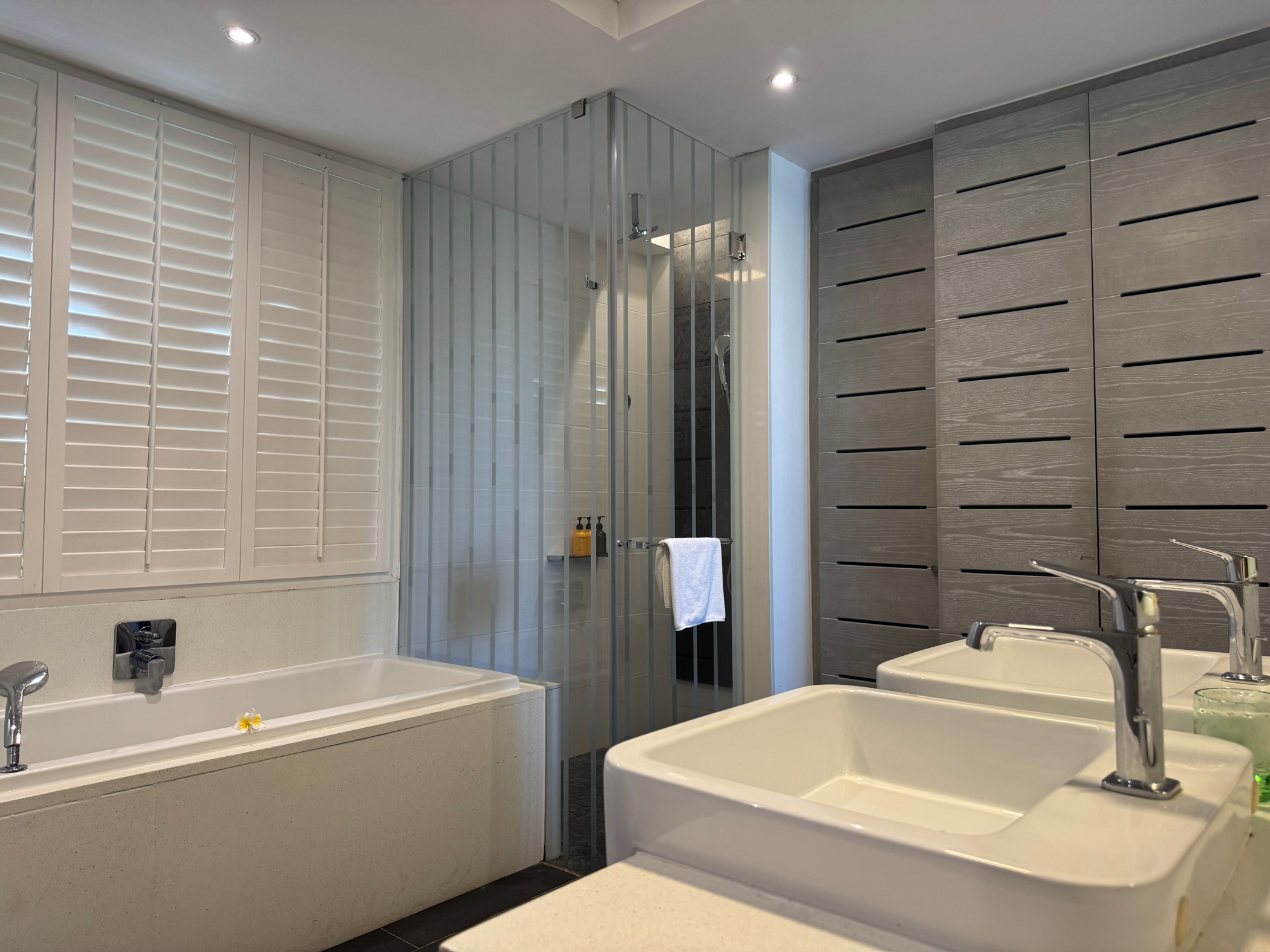 Auch die Raumaufteilung ist erstaunlich klug gelöst. Das Bad wirkt fast wie ein eigener, abgetrennter Bereich und ist angenehm grosszügig konzipiert, mit Dusche, Badewanne und Toilette. Links und rechts wird der offene Badbereich von Kleiderschränken eingerahmt, und insgesamt gibt es erfreulich viel Platz. Jedenfalls genug, um nachts nicht über Koffer, Schuhe oder Golfgepäck zu stolpern.