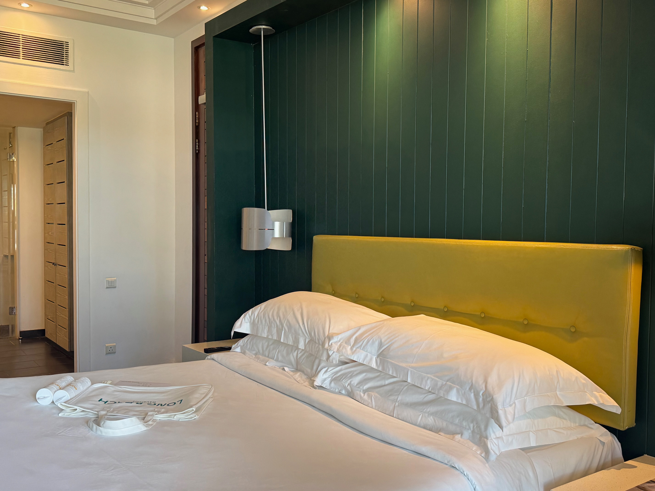 Drinnen läuft leise die Klimaanlage, der Ventilator nimmt die kühle Luft auf und verteilt sie sanft im Raum. Bei 32 Grad im März ist das für mich kein kleines Komfortdetail, sondern eine echte Wohltat. Mitten im Zimmer leuchtet ein grosser Screen mit persönlicher Begrüssung, davor stehen zwei Wasserflaschen bereit, und auf dem Bett liegen liebevoll arrangierte Aufmerksamkeiten. Besonders die grosse Strandtasche hat es mir angetan.
