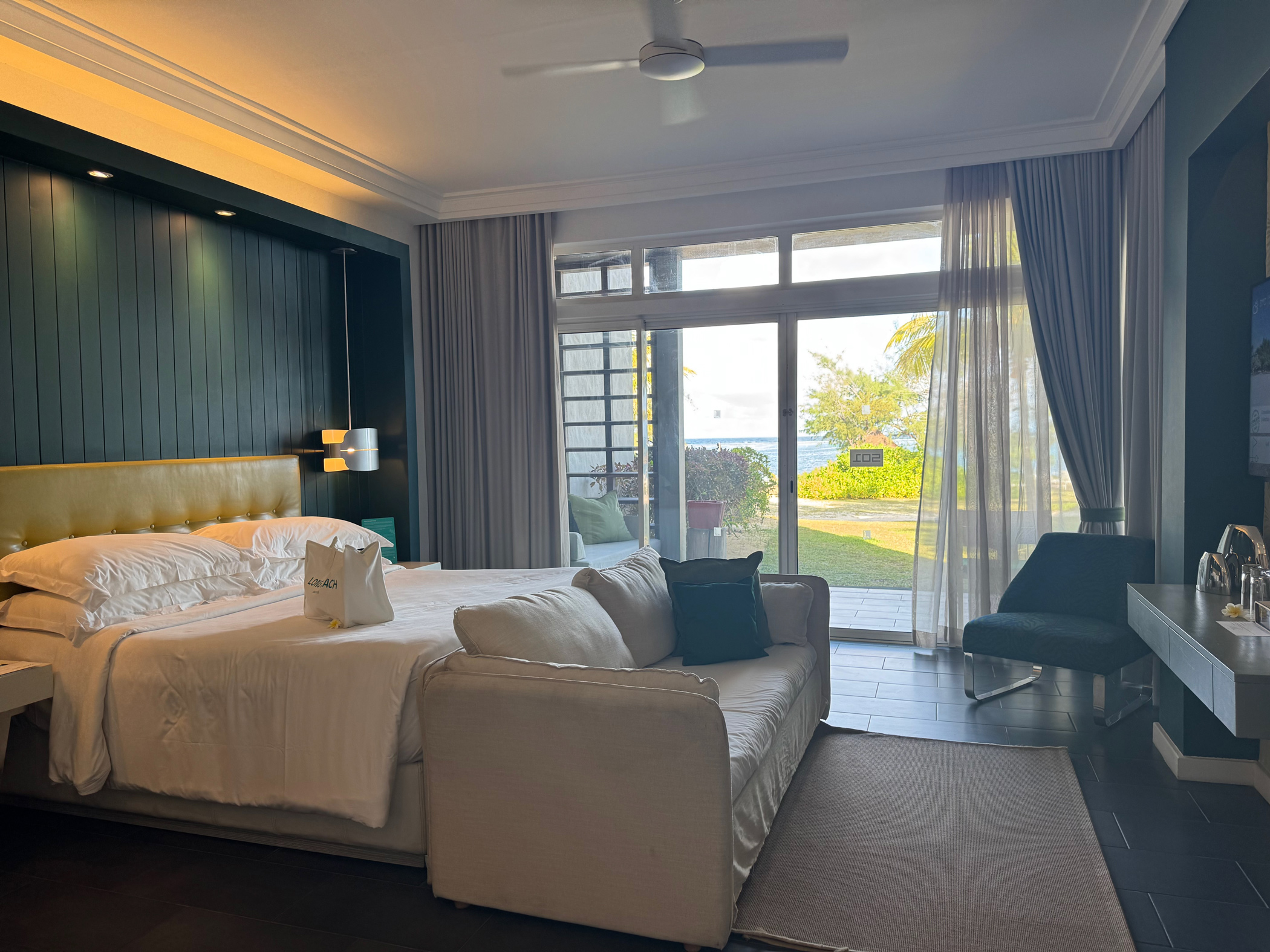 Wir wohnen hier in einer Junior Suite Beachfront. Sie liegt im Erdgeschoss, und wenn du die Schiebetür öffnest, stehst du praktisch schon mit den Füssen im Sand.