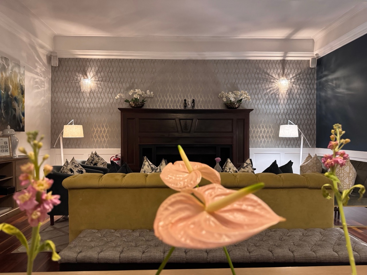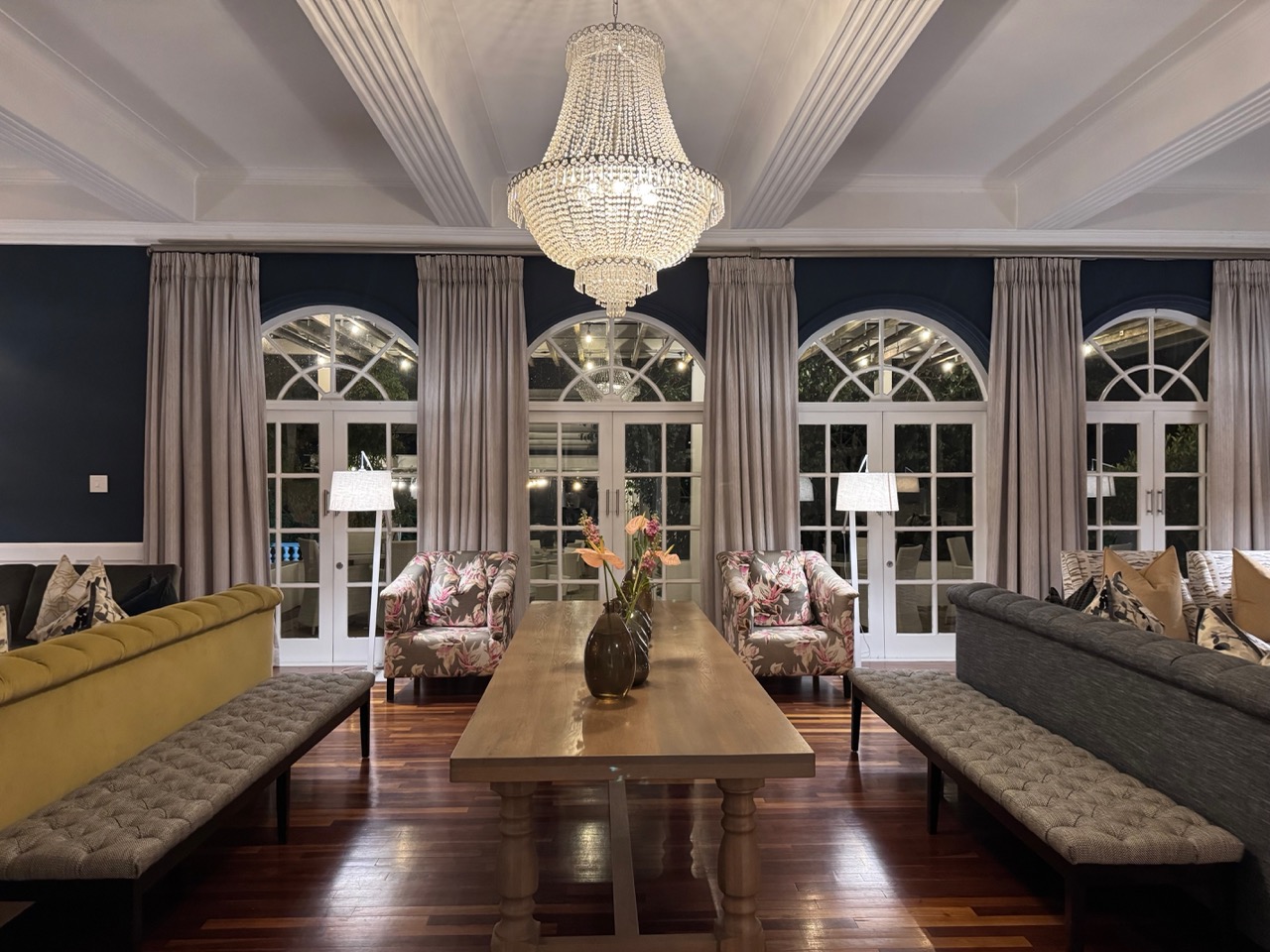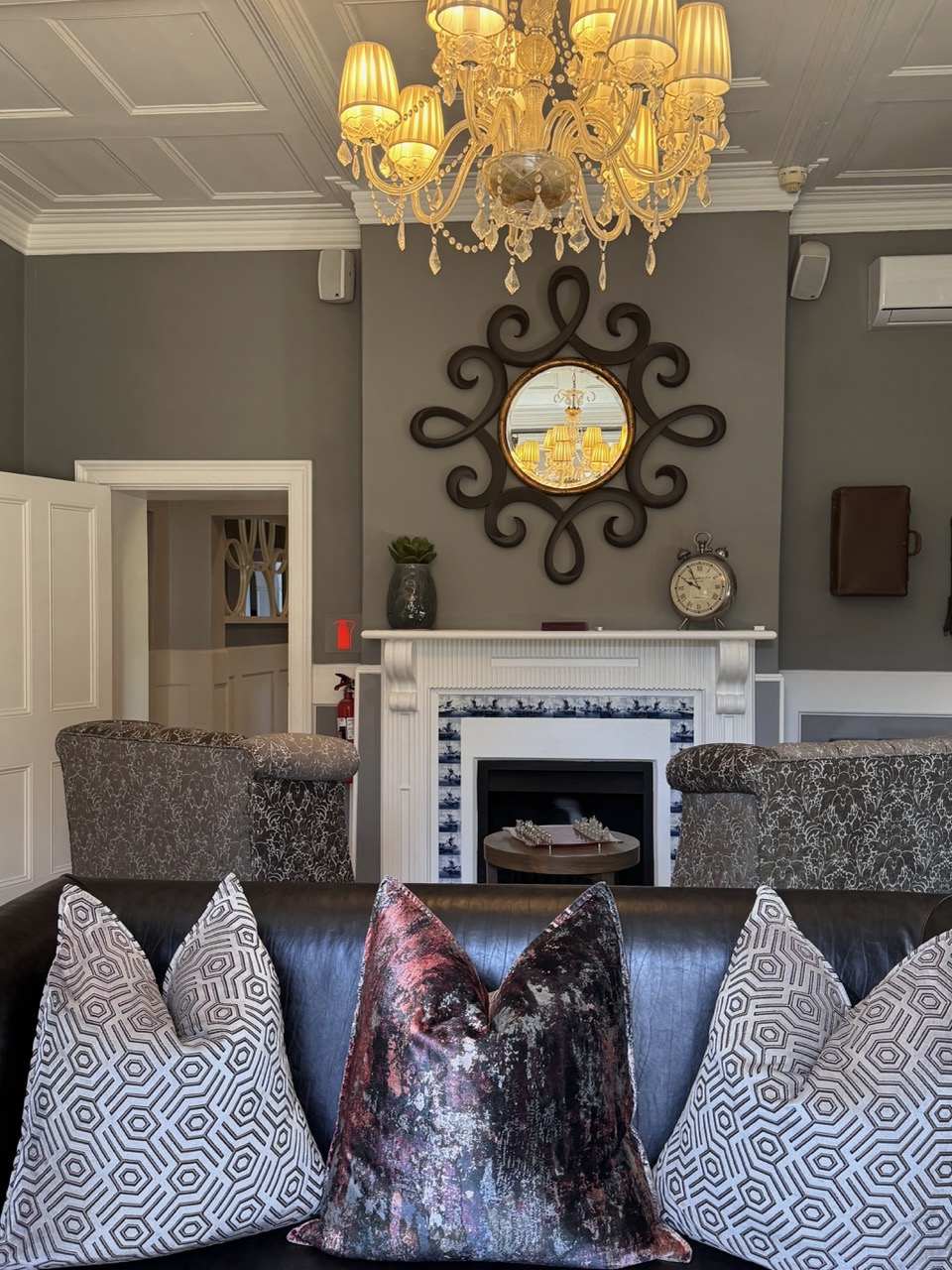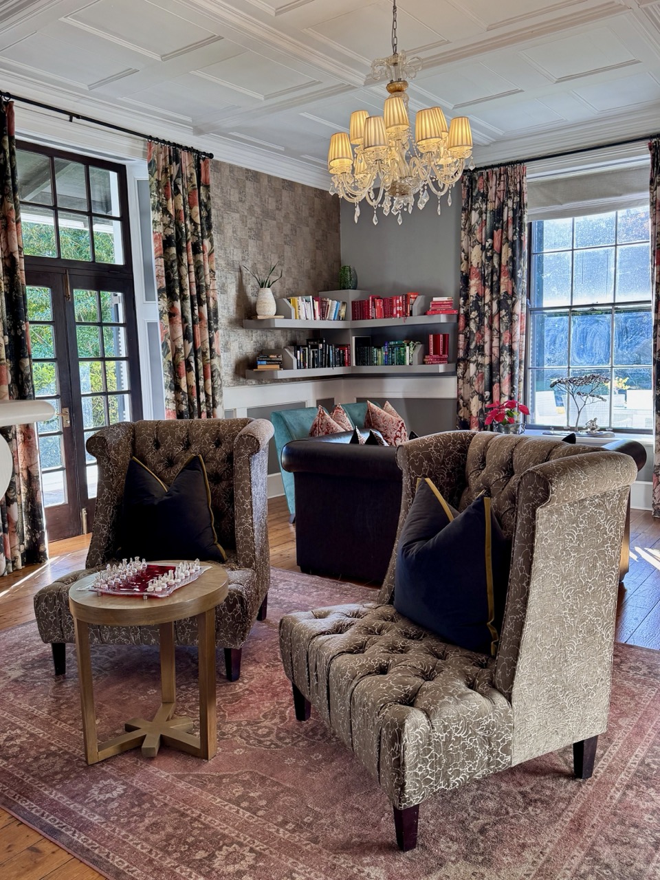 Im Inneren des The Manor House Fancourt flüstern originale Holzelemente Geschichten aus vergangenen Zeiten, während opulente Kronleuchter leise daran erinnern, dass wahre Eleganz immer von oben kommt. Ein Ohrensessel hier, cleanes Design dort – dazwischen ein flackernder offener Kamin mitten im Raum. Es ist Juli, also Winterzeit am Kap – nicht sommerlich warm, aber genau richtig für einen Drink am Feuer.